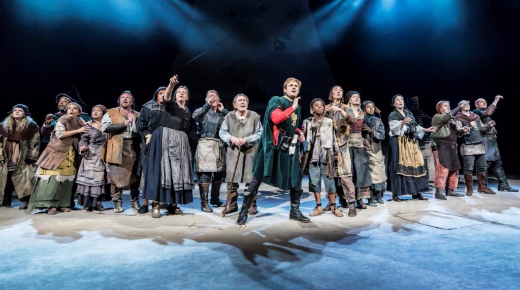 After failing to slay a magnificent beast, George returns home to his rural roots, a kind of every-England that designer Rae Smith paints like a muted Dr Seuss illustration. John Heffernan plays George as a foppish tit tinged with bravery, the soon-to-be saint eventually taking down Julian Bleach’s feudal Dragon lord. And then the Brotherhood calls and George is away again, not before pushing the villagers to imagine their future. One song later and we’re amid urbanisation, the townsfolk back under the thumb of the Dragon, now a titan of industry. The saint returns, and things progress much like they did in the first act: Dragon slayed, England looking forward, George off on his adventures.