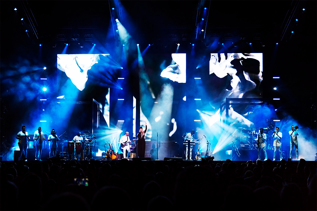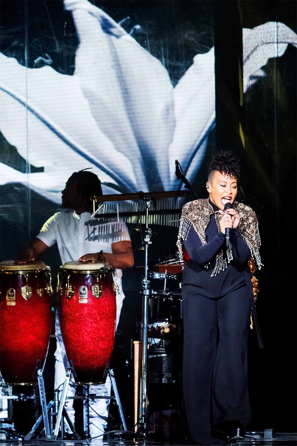 Appearing in an all-black jumpsuit with a gold string bolero, the Scottish singer was accompanied by her full band decked out in angelic white, including her three-piece brass, back-up singers the Halos, two drummers and her guitarists.