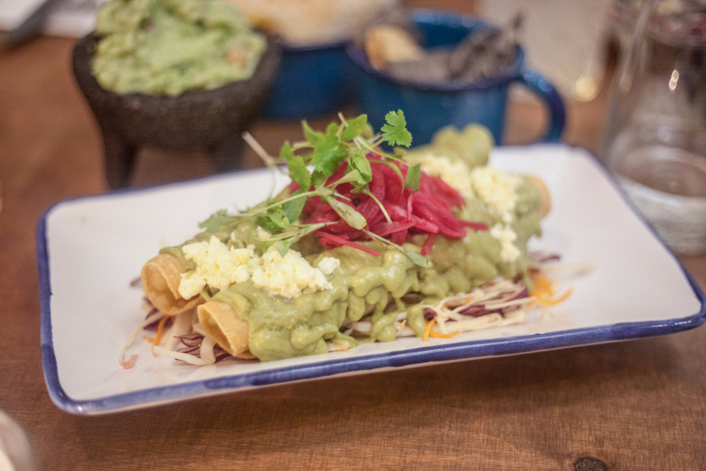 Baby Potato Flautas are equally delicious. Creamy crushed potatoes are abundantly seasoned with coriander and jalapeno, rolled in tacos and then smothered in an addictive avocado sauce. If we have any complaints, it’s that there isn’t a spare taco on the side, to mop up what remains of said sauce. It pairs well with a dish of Frijoles Negros, deep, rich black beans with little pucks of creamy cheese and well-balanced margaritas from the downstairs bar.