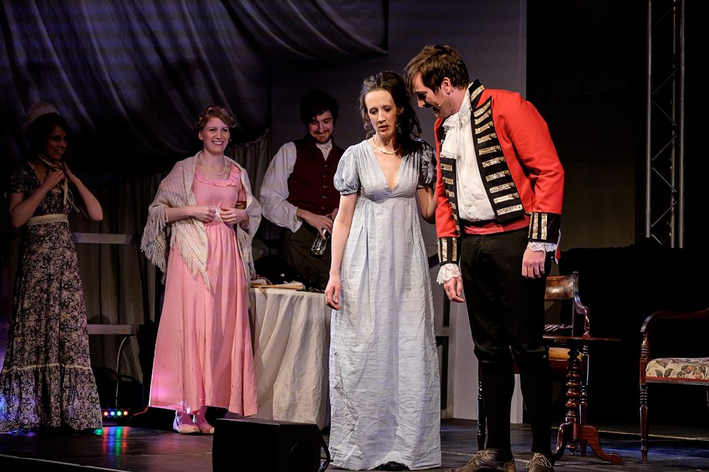 Dressed in Regency costumes with a wallpapered screen in the background to match, the small cast weaves the threads of the story with great confidence, always on the ball when it comes to comic timing and working in total harmony with one another. Maintaining a series of reoccurring motifs selected at random gives the plot some shape. Inevitably, the narrative cannot be said to be strong and at times it seems to be losing all sense, but the talent of the group ensures that the laughter never subsides and there is always an attempt to explain and embed every unexpected new element, even when it seems totally bizarre and foreign to the plot.