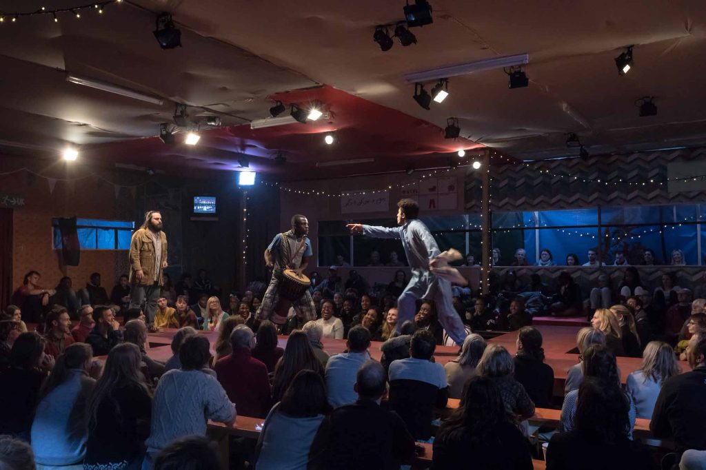 Having spent some time in the former settlement in Calais known as the Jungle, this reviewer felt much anticipation about what the Young Vic’s reproduction of life there was going to be like. The theatre space has been transformed into the “Afghan Café”, with areas that are named after different countries, whose people have been driven – often many thousands of miles – to Calais. The piece’s narrator, Safi (Ammar Haj Hahmad), says at one point that the Afghan Café is actually many restaurants. In this way, it serves as a lens through which the whole settlement – the humanitarian crisis of its existence, the shared experiences, and horrific commonalities between the refugees, whatever their nationality – could be viewed