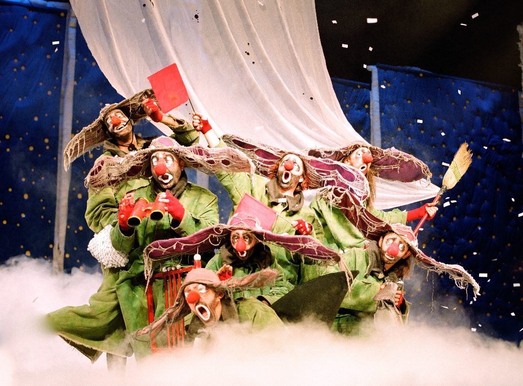 Conceived by performance artist Slava Polunin, the show is a madcap tableau of events, not entirely plot driven. Polunin shares the role of the “yellow clown” with nine other actors, but his appearance never changes, with a glum expression and hang dog eyes, typifying the super sad clown. As we see him walk across the stage, a rope around his neck, he contemplates suicide. As he tugs on the rope, his Doppelgänger appears, mimicking his actions. Soon after this, more clowns emerge, with long oblong feet and floppy hats; they differ in size and characteristics, thought to represent the different emotions of the “yellow clown”.