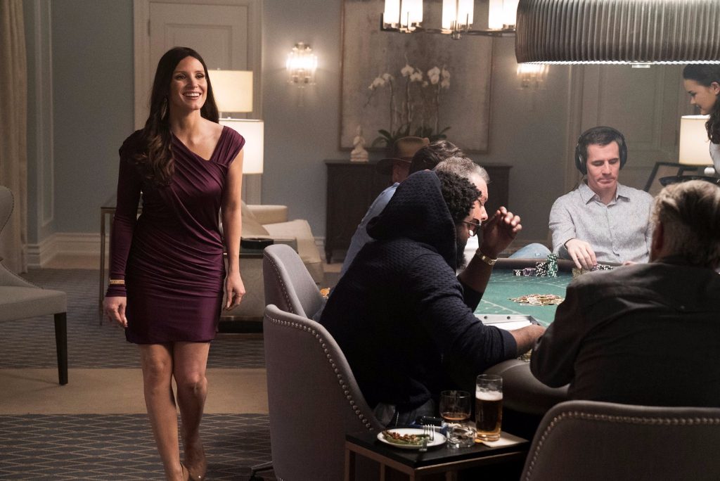 Right from the start, Sorkin drives the audience at a million miles an hour with Molly, his motor-mouthpiece, narrating the minute-by-minute details of an Olympic ski-jump. This flows into her overwhelming enthusiasm for poker, learning all the rules and colloquialisms, as she climbs up the poker-hosting ladder. Previous directors of Sorkin’s work relax their filmic pace to let the words speak for themselves. But in Molly’s Game, words and movie are one and the same. The visuals and the editing are just as fast and delicious. Like The Social Network, the picture jumps back and forth between the conviction and the events leading up to it – using a structure that’s easier to digest than that of Steve Jobs.