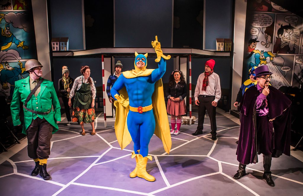 Directed by Mark Perry with music and lyrics by Leon Parris, Bananaman is the rambunctious tale of ordinary teenager Eric Wimp (Mark Newnham) who suddenly gains superpowers after a comet lands on Earth. Set in the quiet suburbs of Acacia Road, it’s a place where nothing ever happens. The peace is soon interrupted by villains Doctor Gloom and General Blight – both determined to take over the world, singing their evil plans, disguised as a post-box and dustbin – portrayed excellently by Mark Pickering and Carl Mullaney; Doctor Gloom sounds like an evil scientist while General Blight is played as a stereotypical German Nazi, reflecting Britain’s pop culture when the comic first attracted fans.