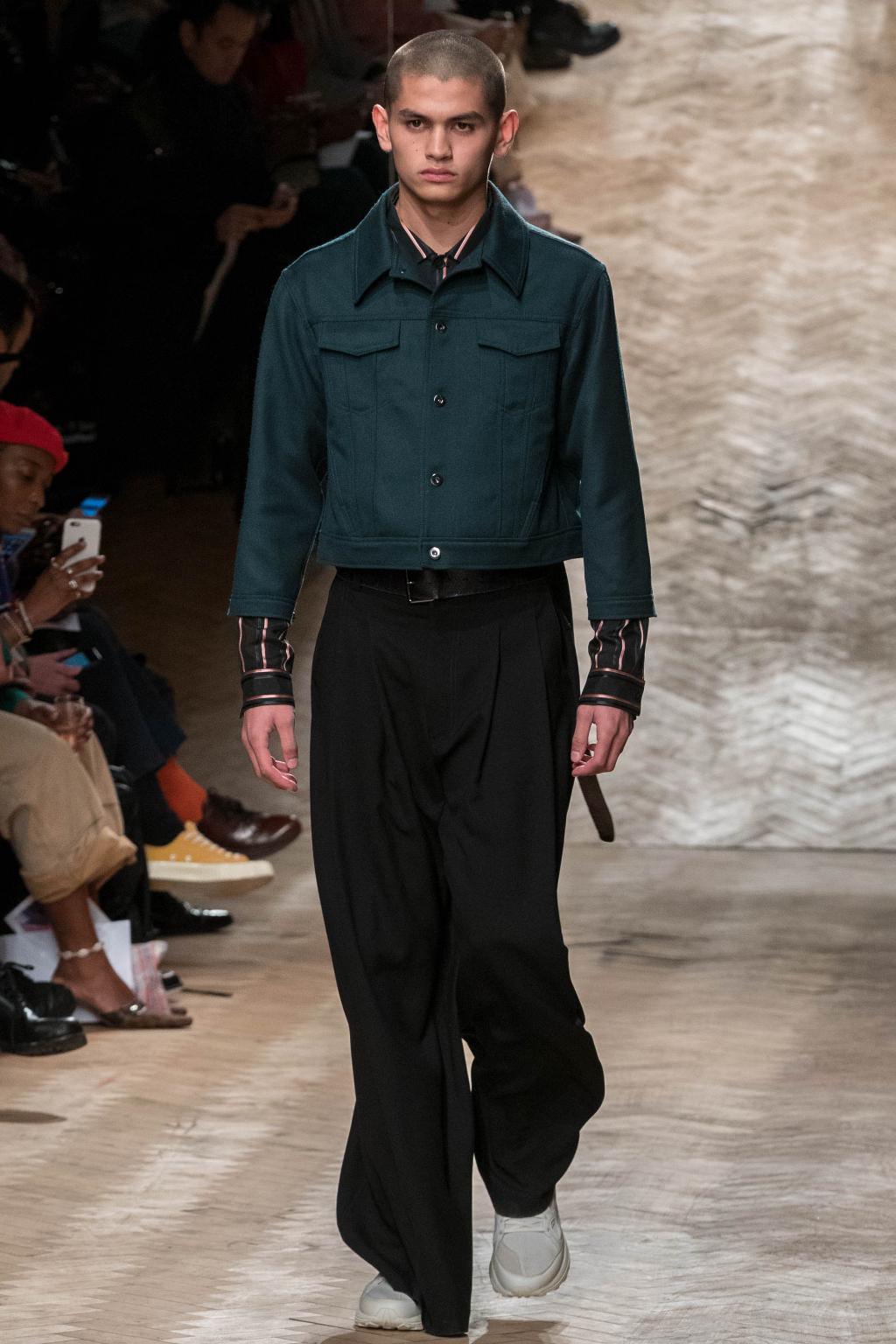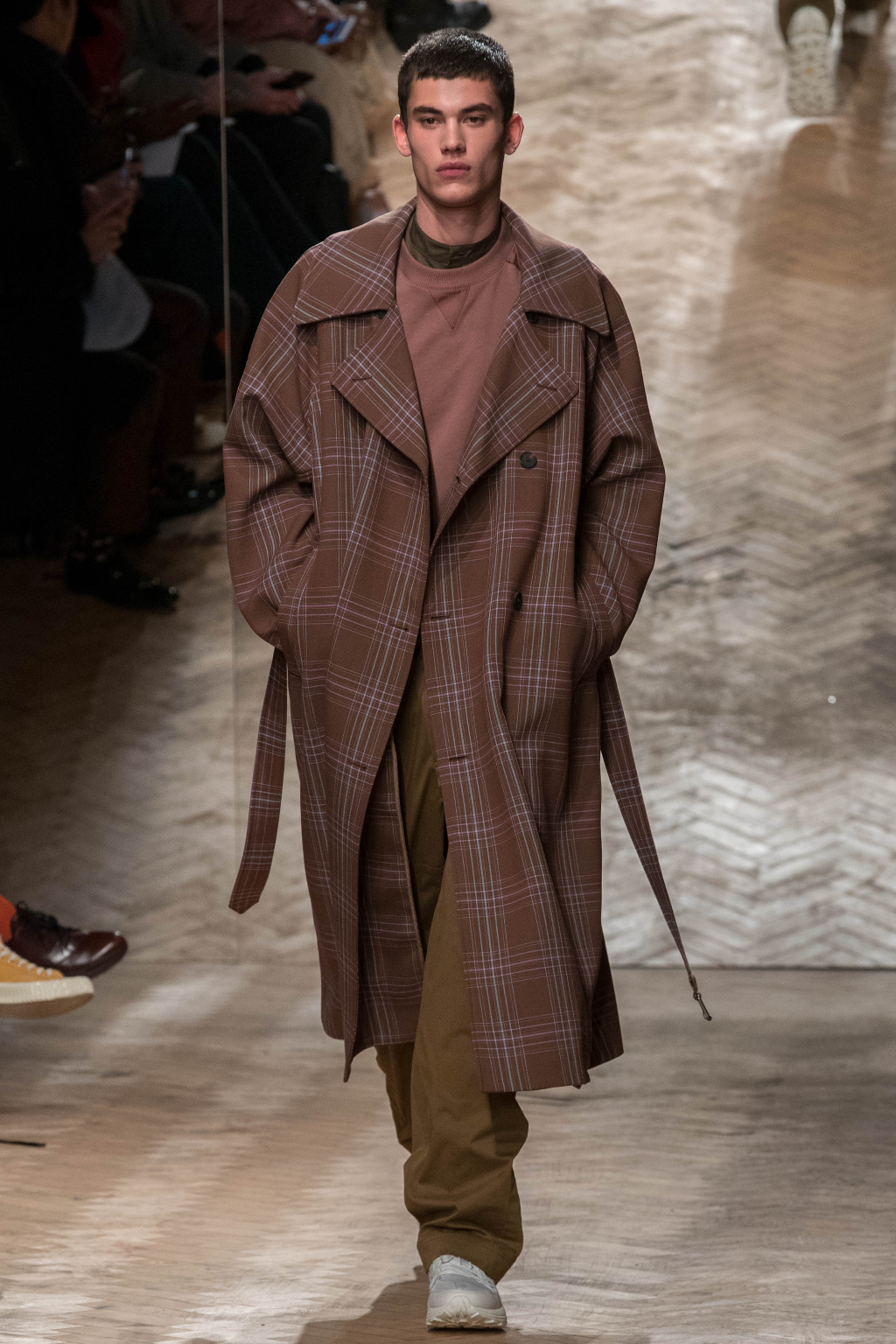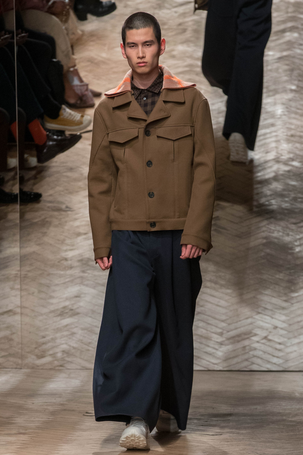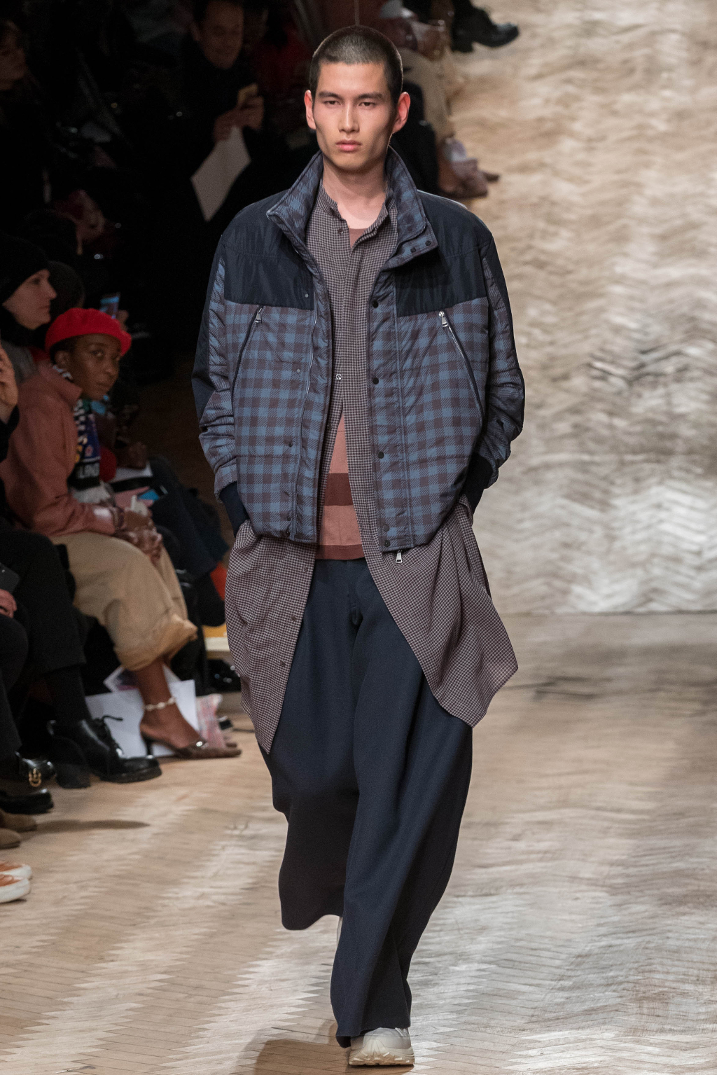 Chunky and voluminous, the loose trousers are always matched with white trainers. One of the most interesting elements, though, are the cropped jackets: apparently all similar, they actually add to every figure an original touch, whether due to the checks – large or small – or to the different positioning of the fabric stripes along them.
