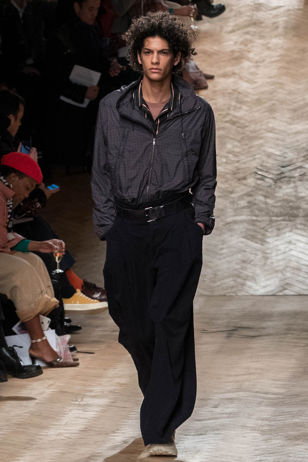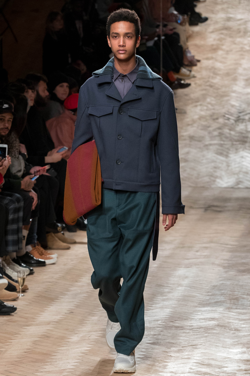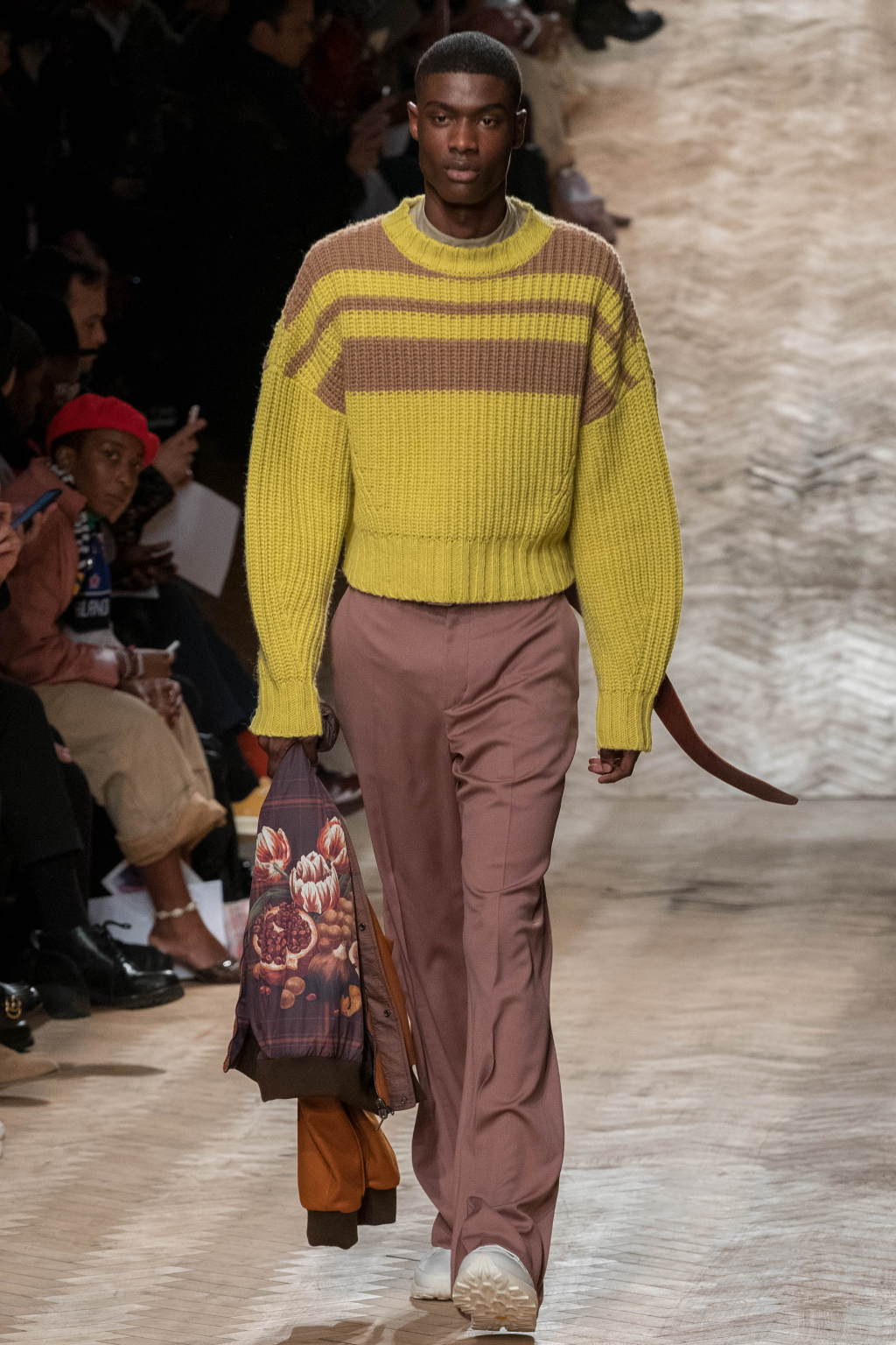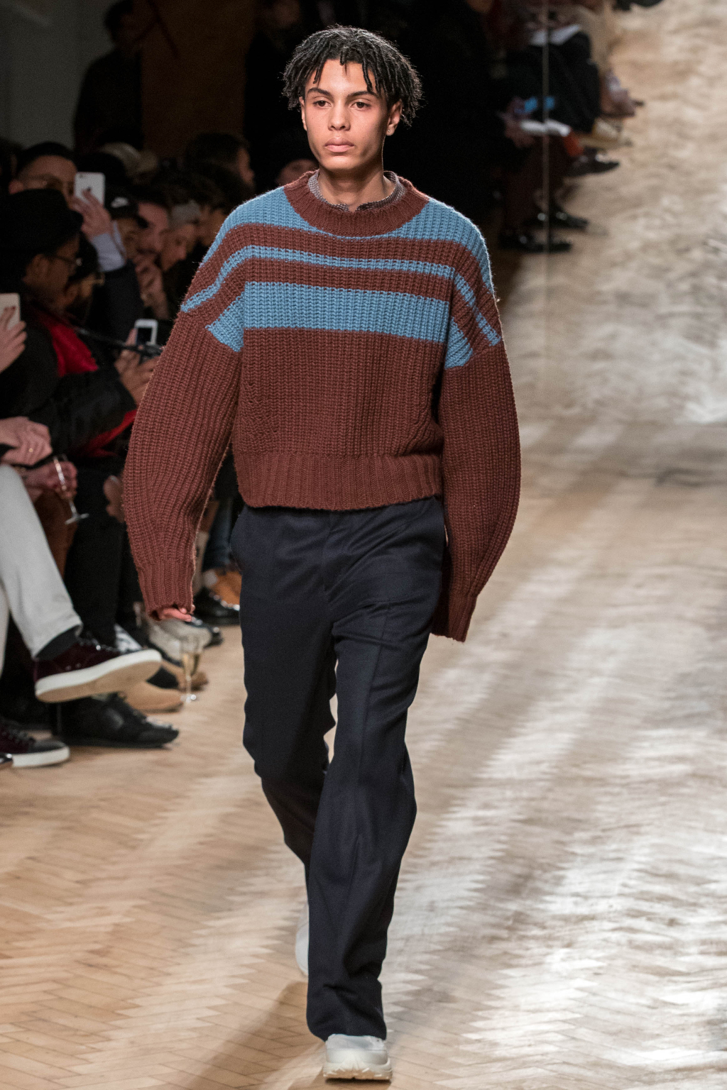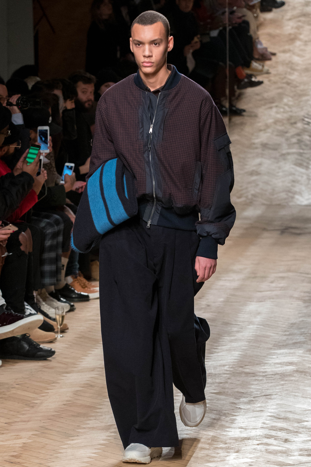 Chunky and voluminous, the loose trousers are always matched with white trainers. One of the most interesting elements, though, are the cropped jackets: apparently all similar, they actually add to every figure an original touch, whether due to the checks – large or small – or to the different positioning of the fabric stripes along them.