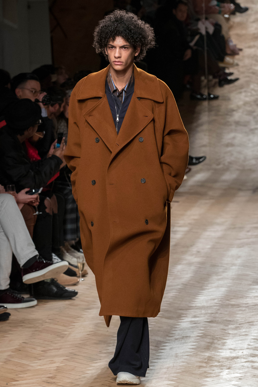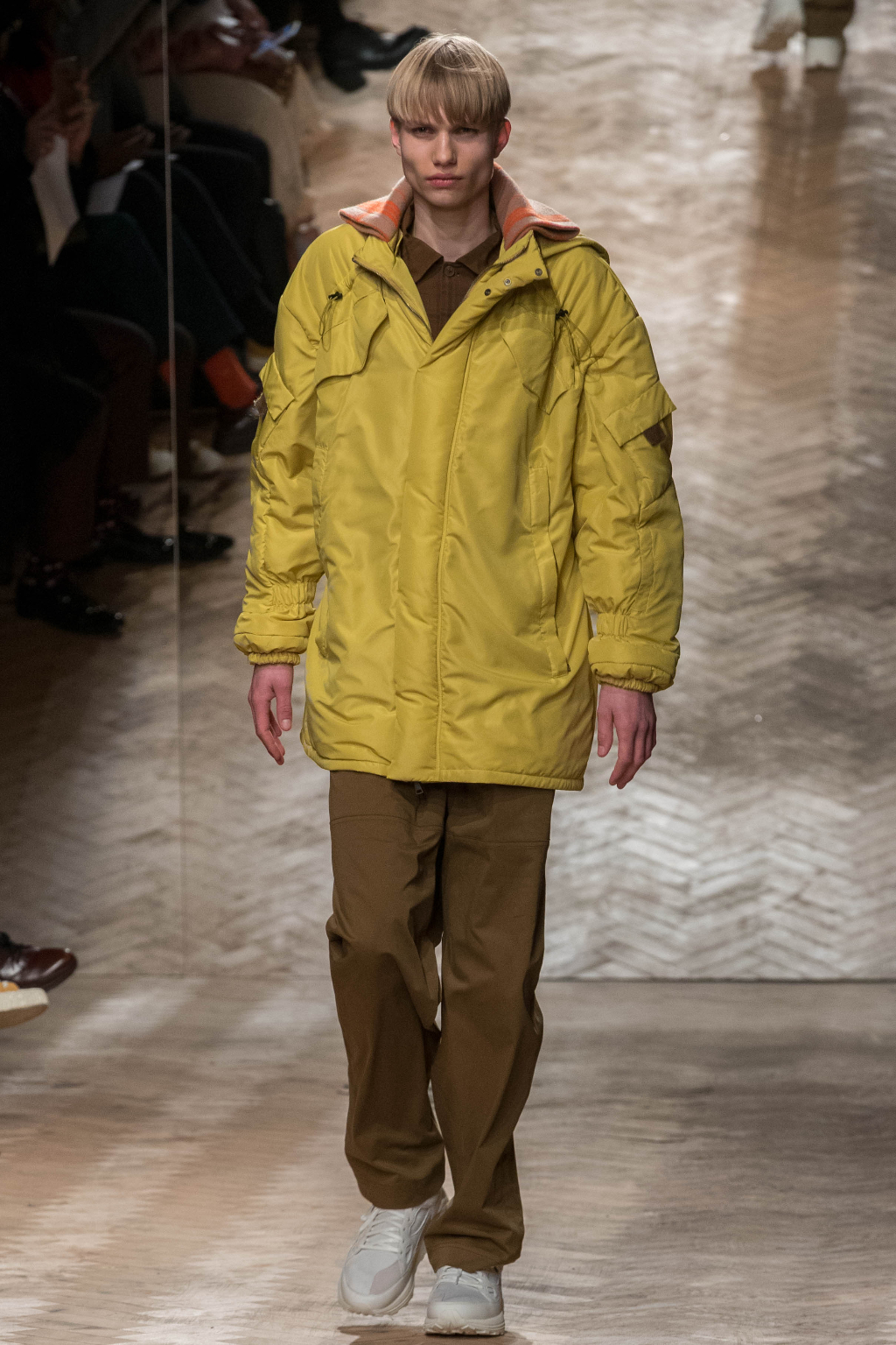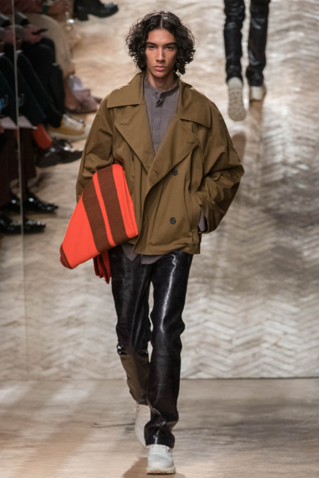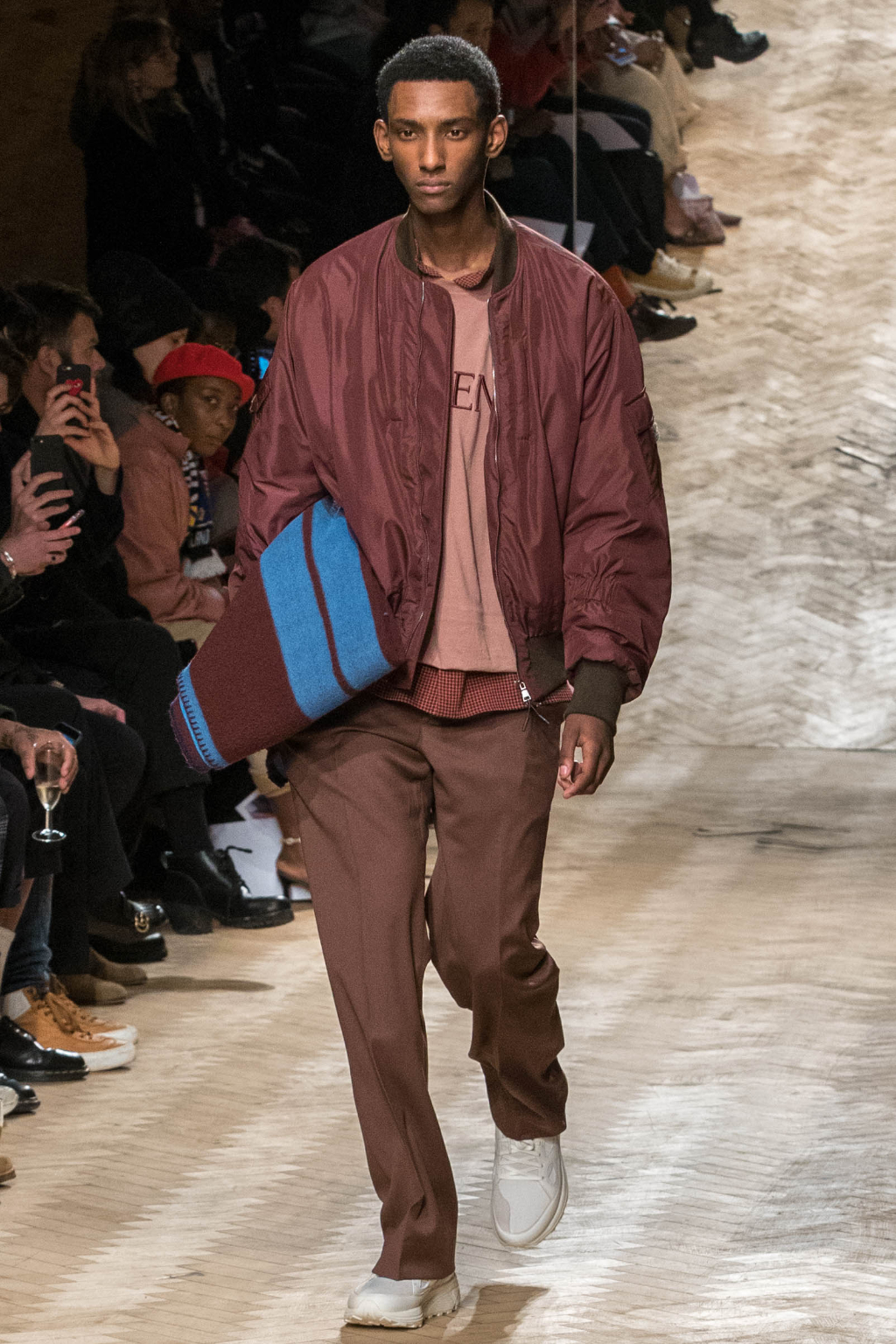 Chunky and voluminous, the loose trousers are always matched with white trainers. One of the most interesting elements, though, are the cropped jackets: apparently all similar, they actually add to every figure an original touch, whether due to the checks – large or small – or to the different positioning of the fabric stripes along them.