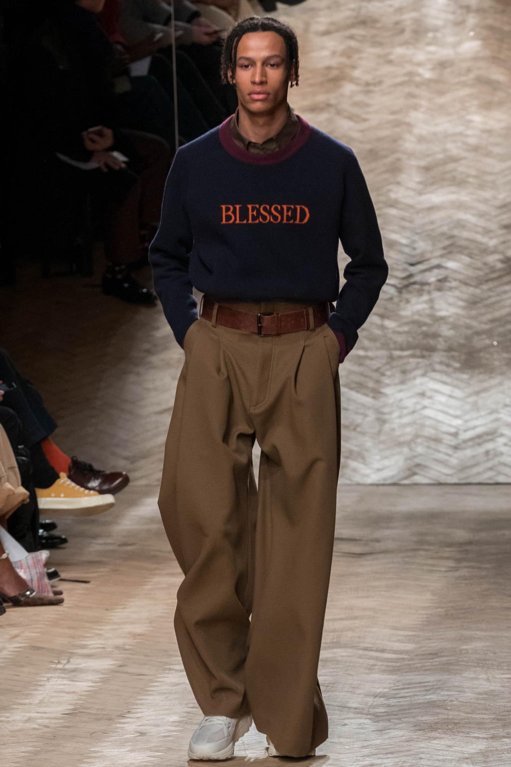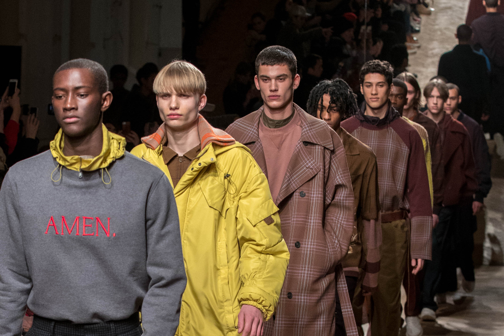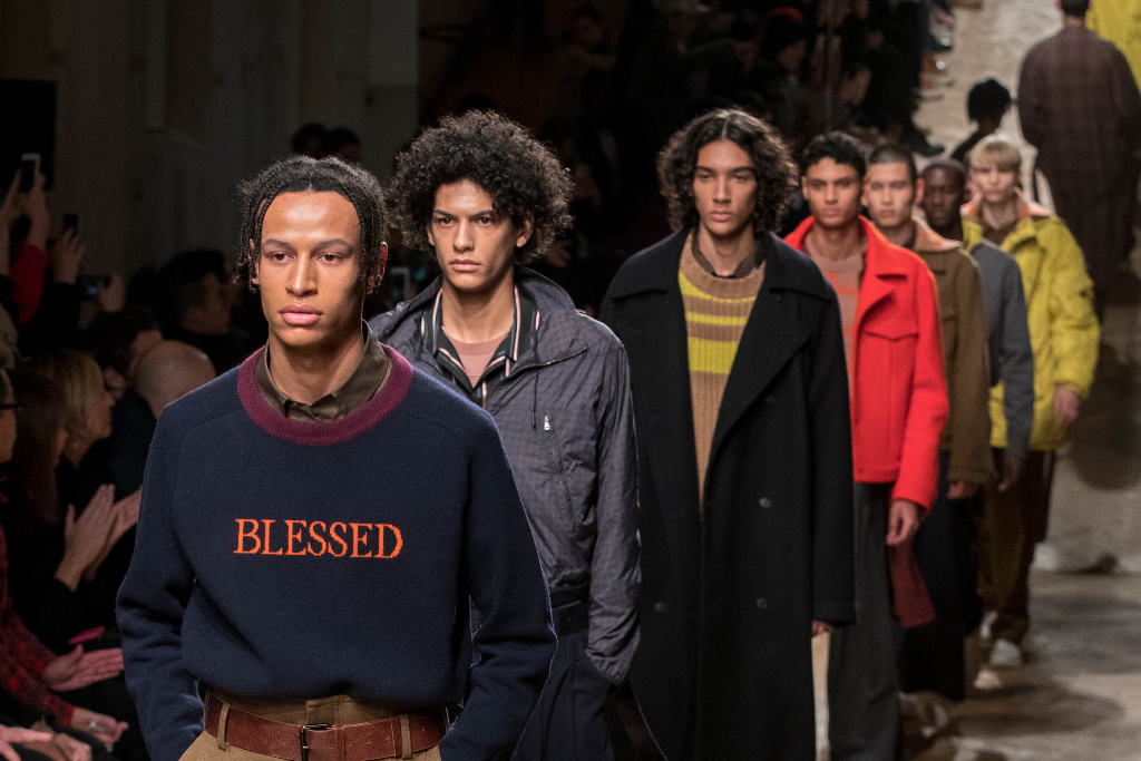The words “amen” and “blessed”, alluding to themes of existentialism , appear alone in bold at the centre of a couple of sweaters. Qasimi mixes different cultures and their traditions with the urban attitude of the modern men.