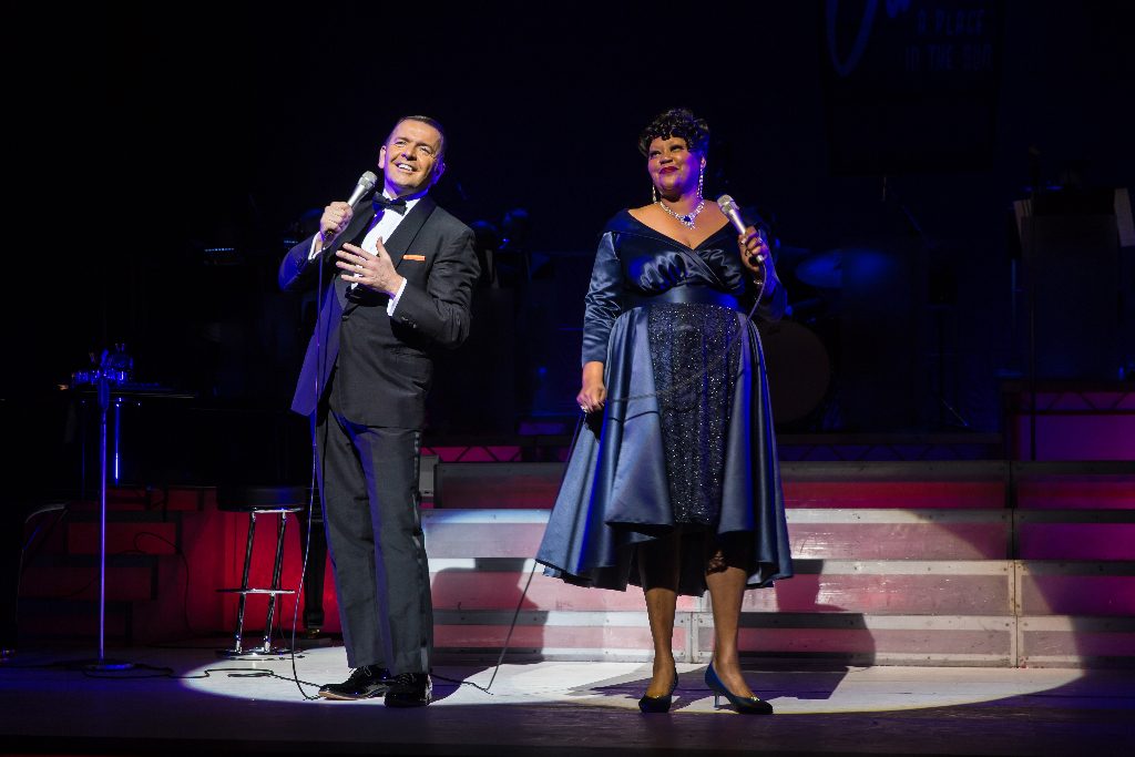 The Rat Pack need no introduction and they don’t provide one either, with Sinatra launching straight into Luck Be a Lady when the show begins. The actor bears a striking physical resemblance to the entertainer and has an uncannily similar singing voice too. Those two compliments can be applied to all the performers, who go beyond playing dress-up and really embody the legends they’re portraying, mannerisms and all. A couple of times where Casey and Phillips spoke a little too quietly off-mic didn’t affect their overall performance, whereas Hayes could be heard from anywhere.