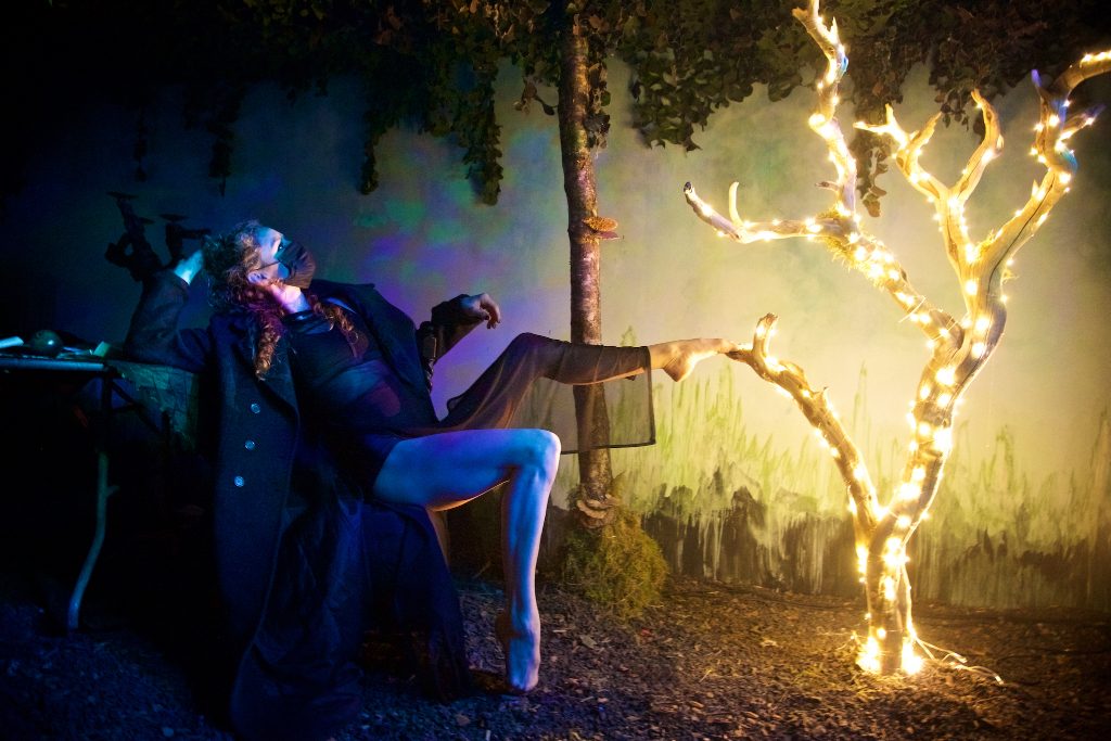 The Furies also have a go at playing with fire. Rosie Bartley, Jessica Pearce and Isobel Midnight guide the audience from one side to the other of the room, and smoothly fill in the pauses in between the episodes. They perform a choreographed dance featuring burning torches and lead an emotive scene with candles that is focused on the musician and singer.