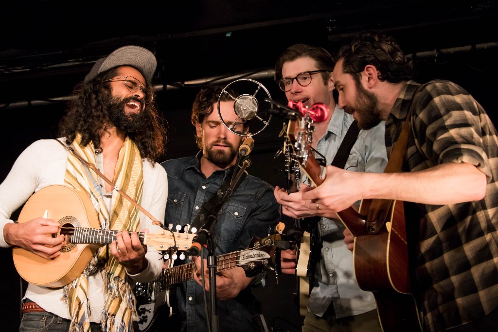 The Bostonian quartet, Darlingside, cast a spell over the packed basement of the Courtyard Theatre in Hoxton. Every element of their performance contributed to this, from the charming, funny patter between songs to the use of one old-school microphone in the middle of the stage, around which they all crowded. From the beginning, the audience was treated to a wonderful flurry of stringed instruments, changing hands and changing tunings between every number. As the four-piece progressed through their set, electric guitars, a bass, cello, banjo, mandolin (and even one or two synthesizer keyboard towards the end) started appearing.