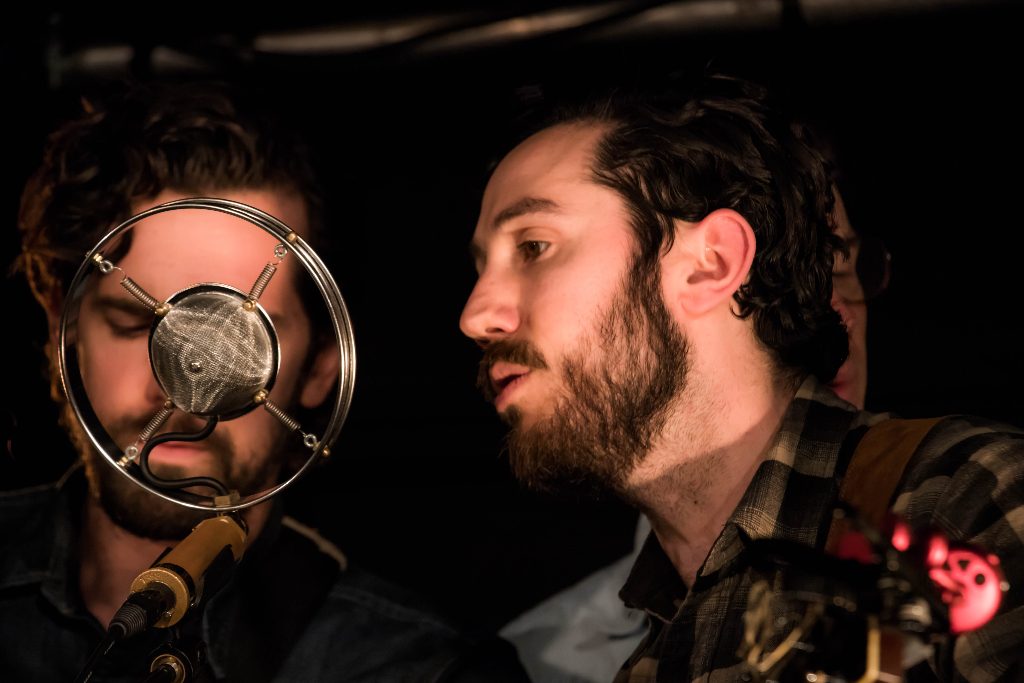 The Bostonian quartet, Darlingside, cast a spell over the packed basement of the Courtyard Theatre in Hoxton. Every element of their performance contributed to this, from the charming, funny patter between songs to the use of one old-school microphone in the middle of the stage, around which they all crowded. From the beginning, the audience was treated to a wonderful flurry of stringed instruments, changing hands and changing tunings between every number. As the four-piece progressed through their set, electric guitars, a bass, cello, banjo, mandolin (and even one or two synthesizer keyboard towards the end) started appearing.