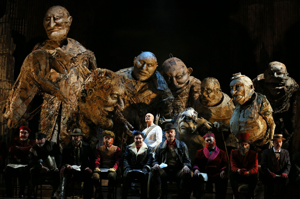 The production is directed by Phelim McDermott and designed by Julian Crouch, co-founders of innovative theatre company Improbable, whose actors work around the singers to create an immersive and visually striking environment. Innovative scenery and puppetry are used to great effect, always in harmony with the singers and Glass’s score. In one particularly powerful scene, figures walk repeatedly across the stage unfurling rolls of sticky tape to make a translucent, shimmering barrier, the creak of the tape dispensers and the tread of the actors’ footsteps adding to the soundscape being created by the orchestra and the principals at the front of the stage.