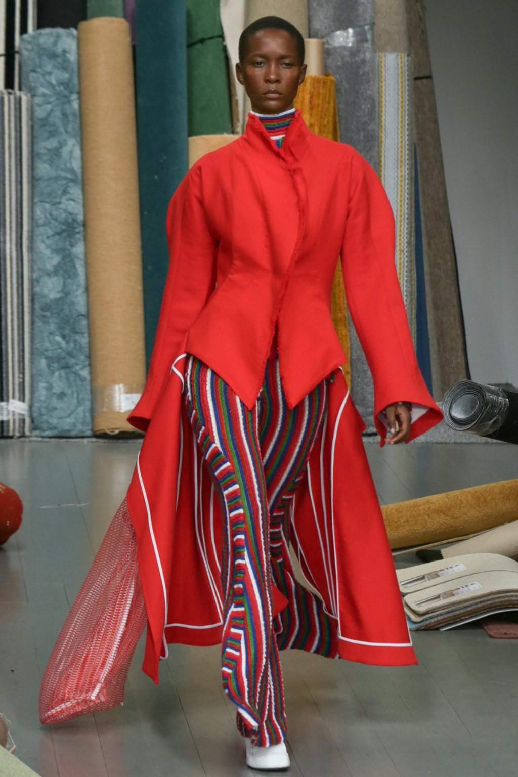 Block colours of red, pink, “Cadbury” purple, blue and green combined with draping aimed to channel the duality of the themes of community and common purpose. Inspired both literally and societally by working-class markets from his youth, the designer has drawn upon the beauty and vitality of the spaces. A stand-out piece in the form of a high-necked, long sleeve floor length gown used red, green and white stripes to further accentuate the female form. The attire was accessorised with a literal nod to the market in the form of a bag that could be used to carry fresh goods.