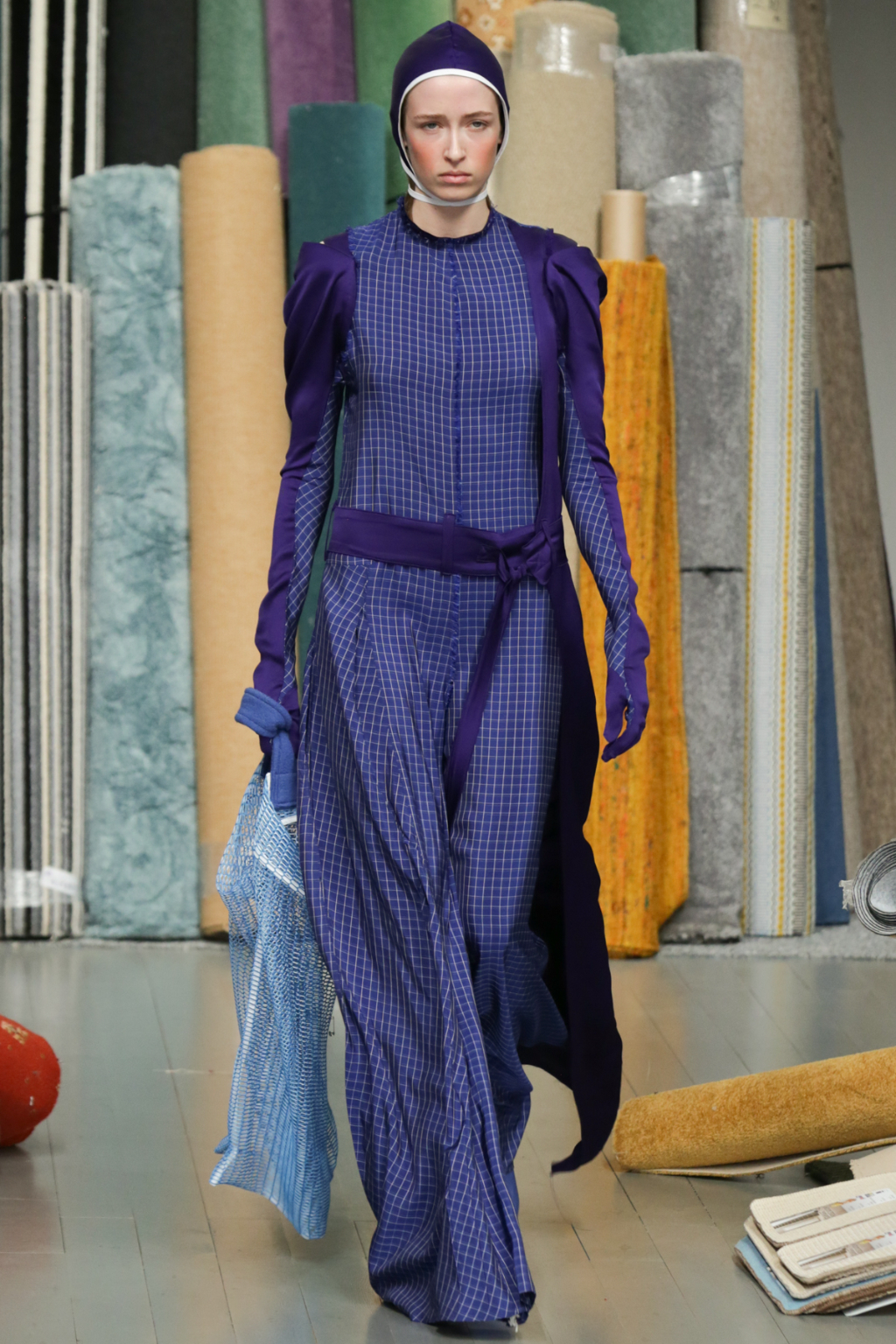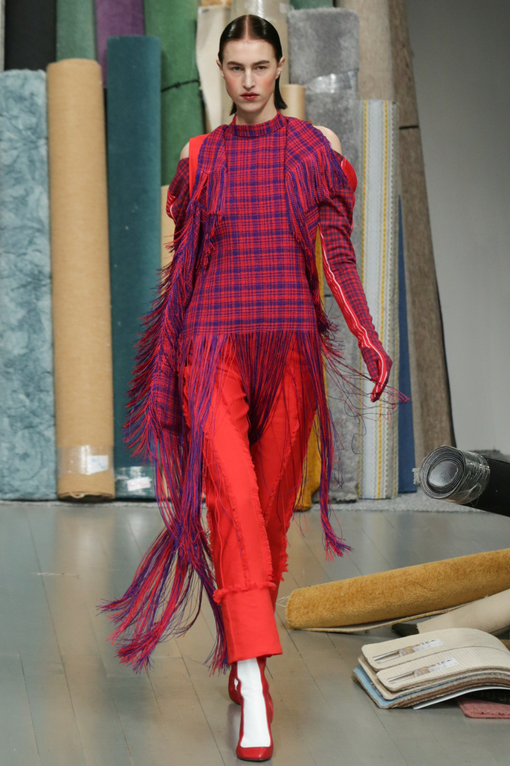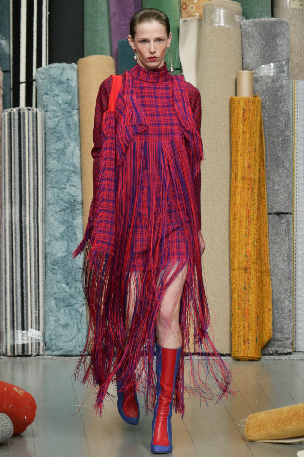 Woven aprons, headscarves and artisanal jewellery accessorise dramatic and exaggerated draping details to cleverly pin-point the essence of the vivaciousness of the market spaces that inspired Malone. Structured collars, cinched waists and repeat checked patterns act as the antithesis to the more unrefined aspects which draw on the designer’s ongoing fascination with the theme of vulgarity. The repetition of shapes and size are meant to replicate the fabrics found on factory floors and is most eye-catchingly evident in an almost red-tartan check inspired ensemble. The almost floor length tassel fringing, with notes of electric blue sprinkled throughout, is contrasted with bare legs and colour-blocked boots to formulate a striking and honest vision.