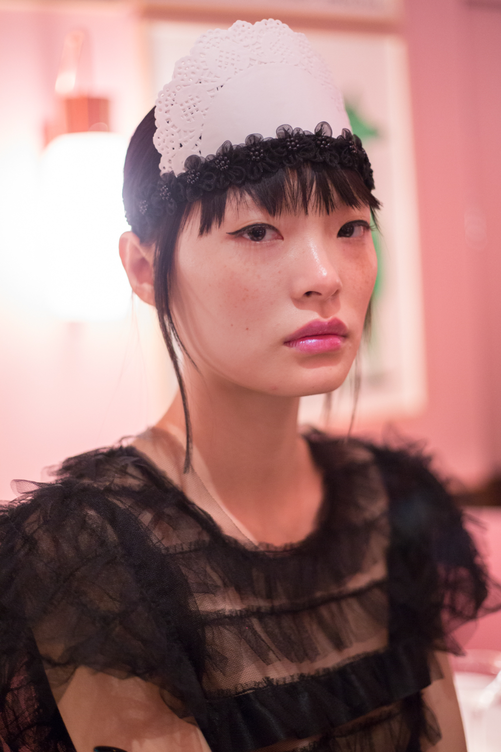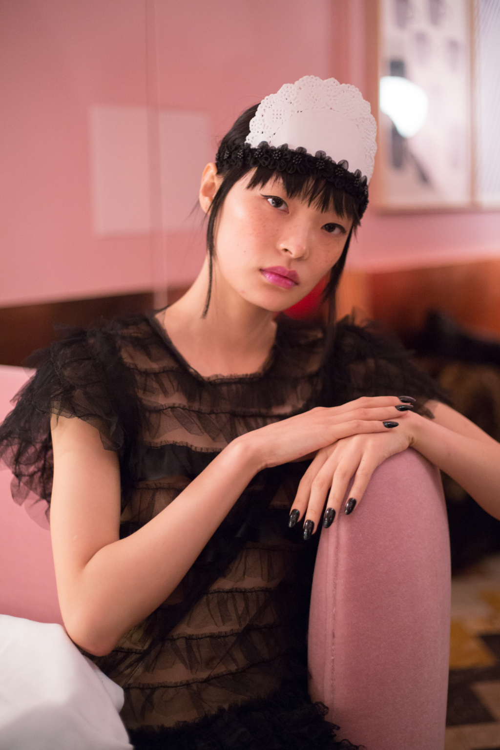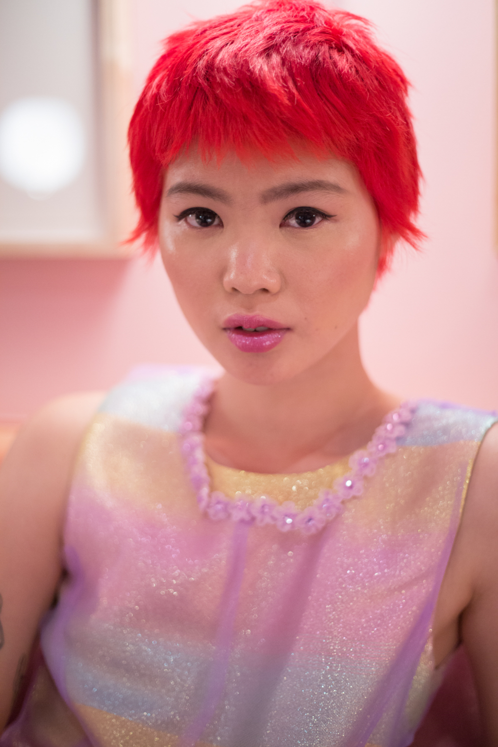 Sickly swirls of rainbow tulle transport you into Ryan Lo’s world where each model has eyes like a Manga character and glittered lips. Ruffled appliqué fabrics have been hand scrunched to sculpture patterns abnormal to their usual form, such as houndstooth and flowers.