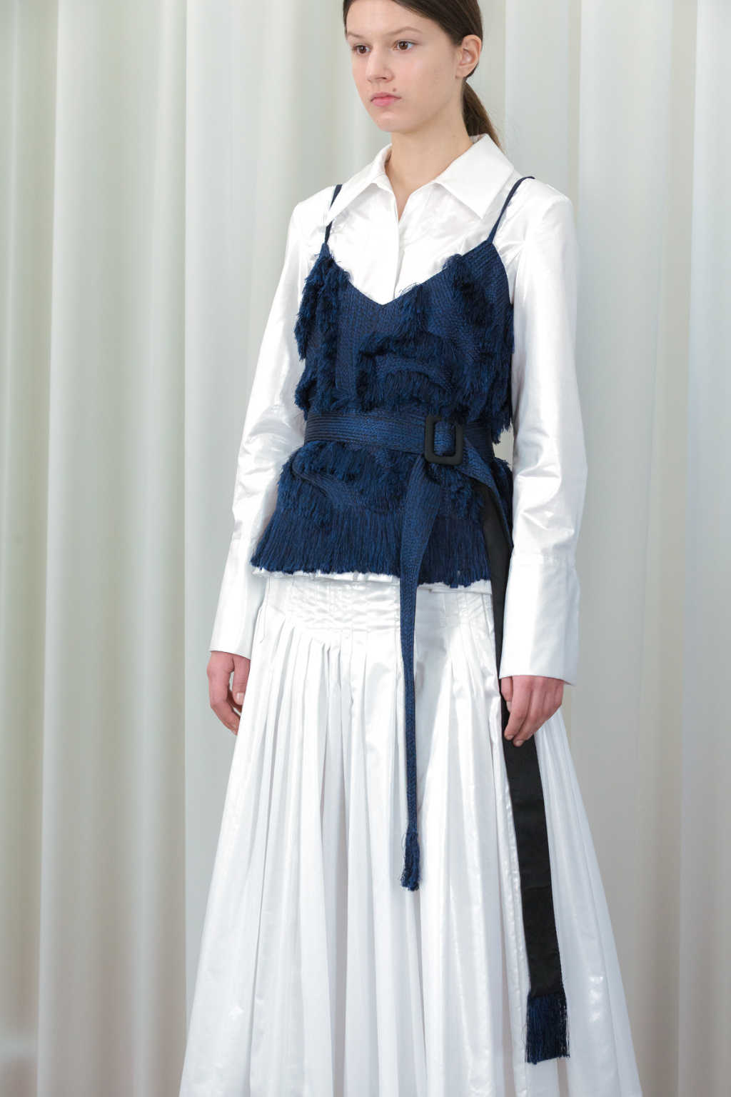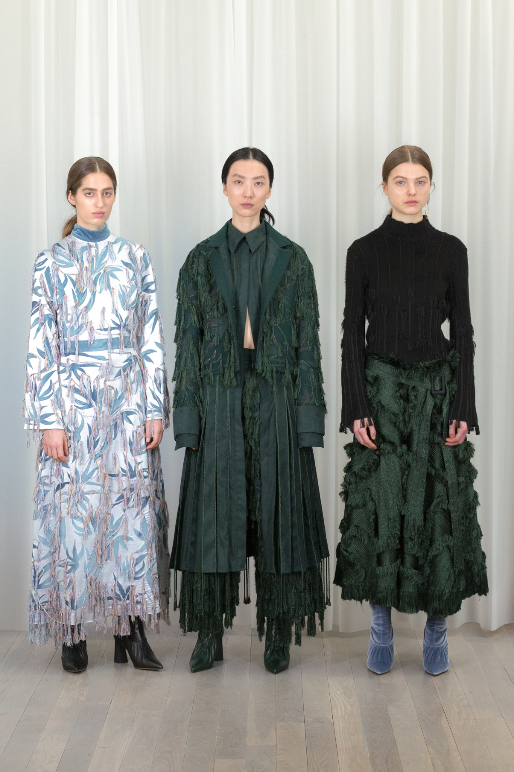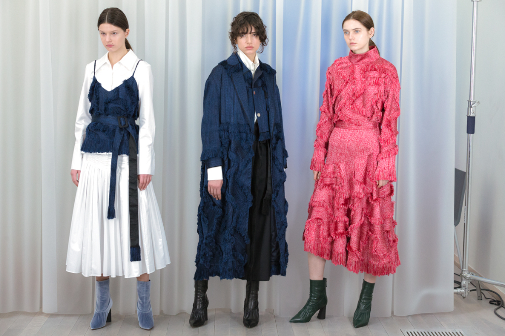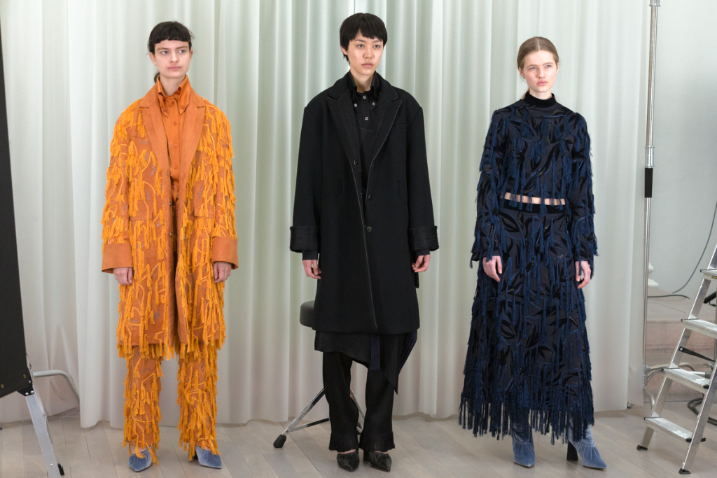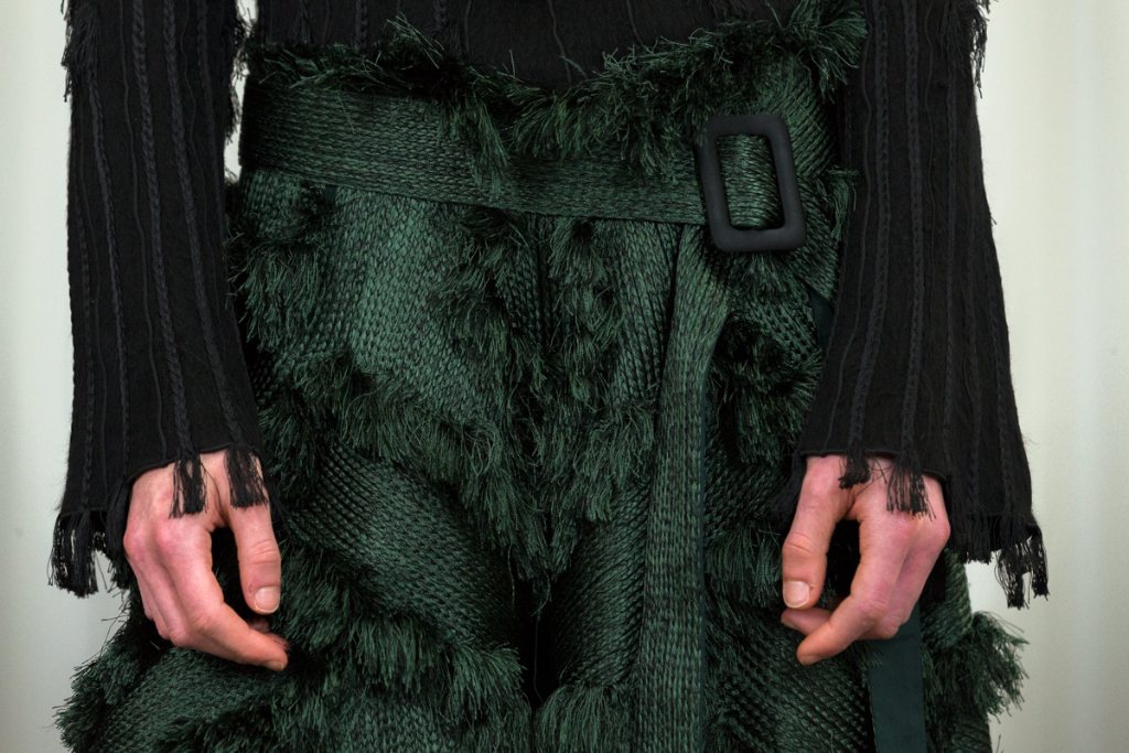 Artful craftsmanship and deconstruction forms the foundation of all of Xu Zhi’s designs and this is evidence through the heavy use of tailoring. Ankle length tailored coats have been placed over wide leg trousers and alongside artfully pleated skirts. Carefully placed yarn tassels have been bunched across the blunt lines of the tailoring, representing paint splashes.