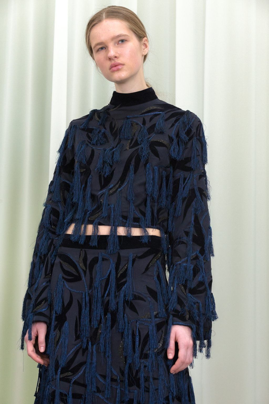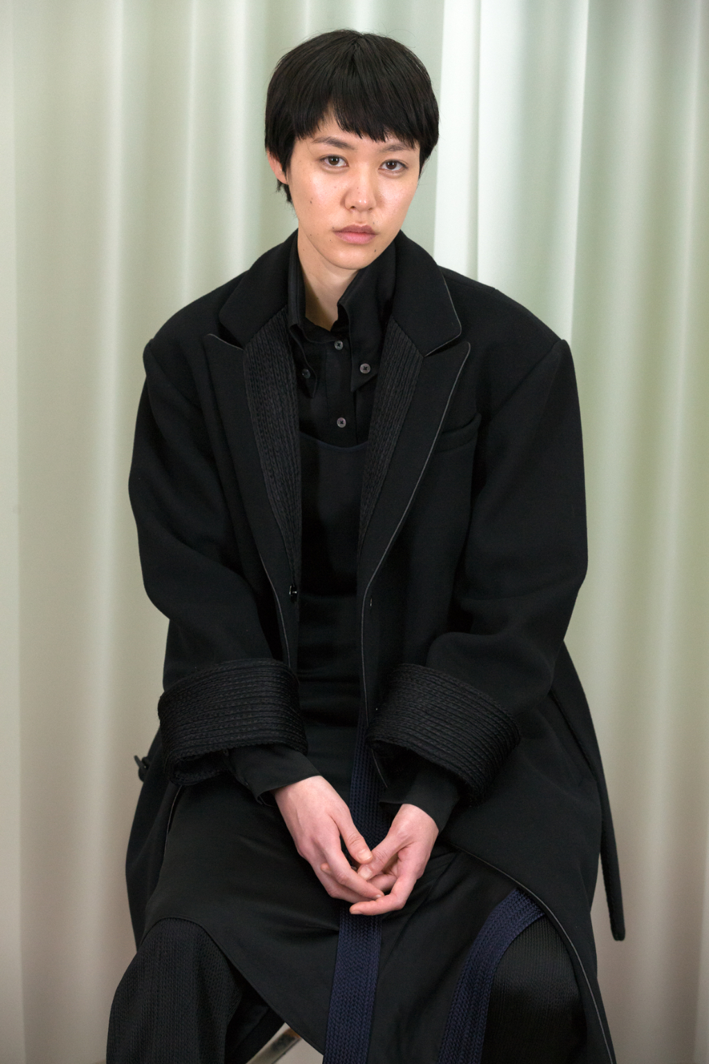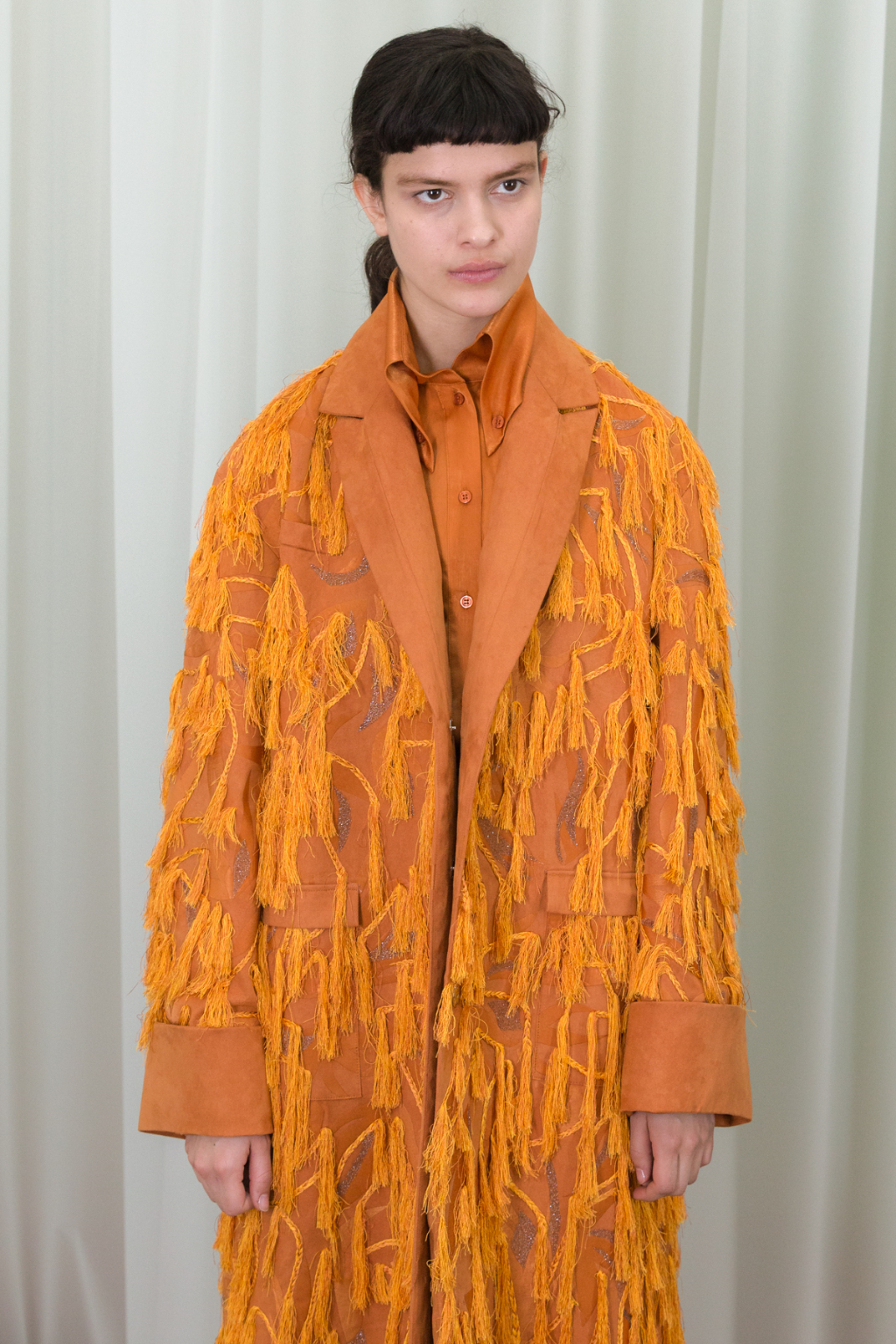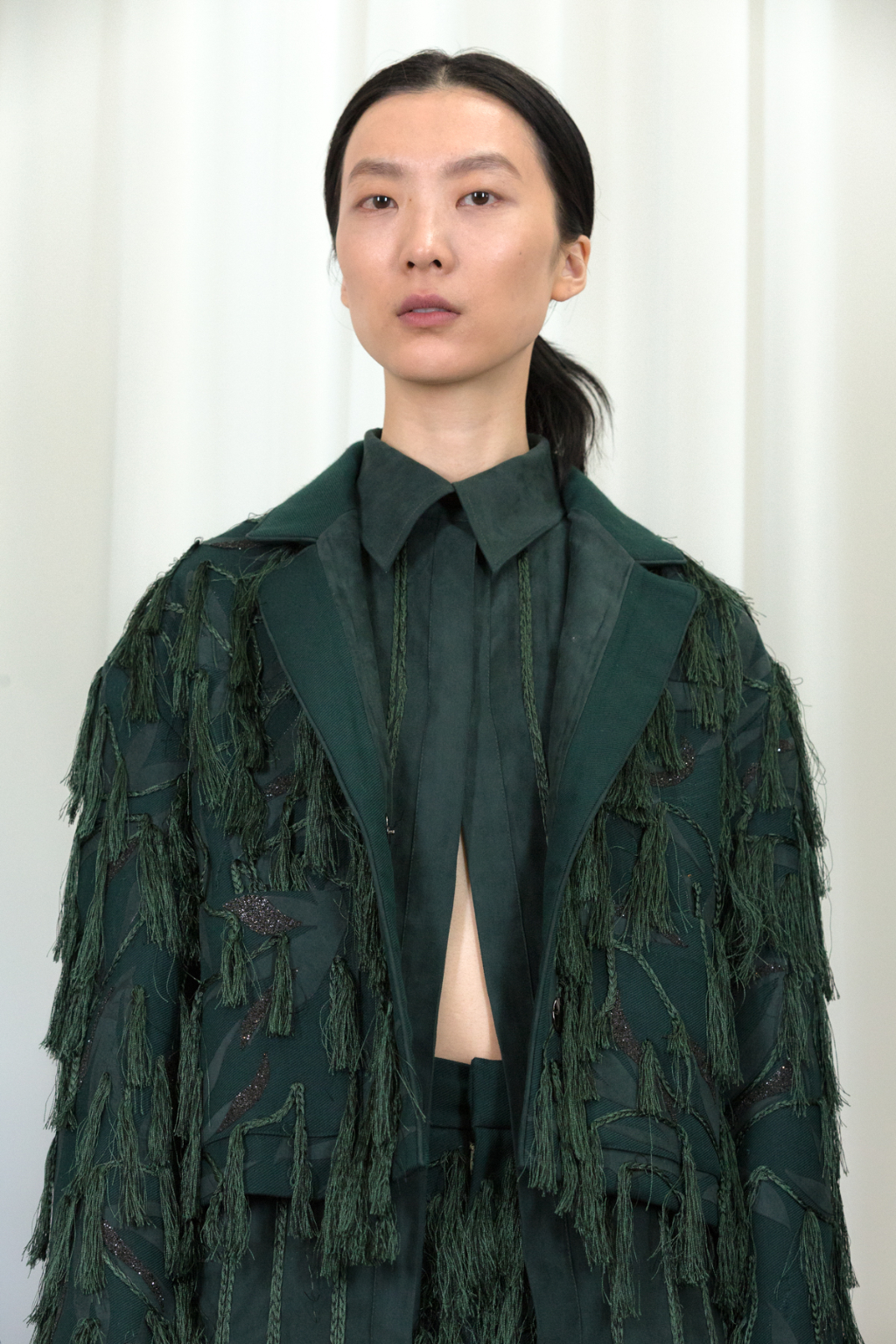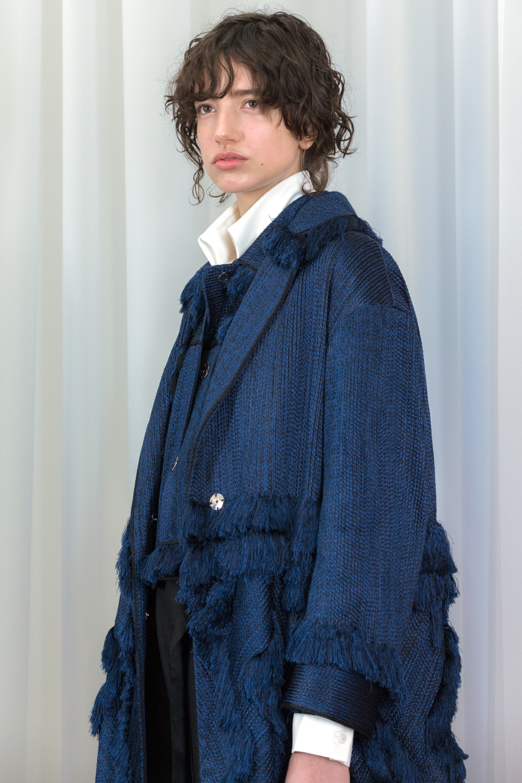 Artful craftsmanship and deconstruction forms the foundation of all of Xu Zhi’s designs and this is evidence through the heavy use of tailoring. Ankle length tailored coats have been placed over wide leg trousers and alongside artfully pleated skirts. Carefully placed yarn tassels have been bunched across the blunt lines of the tailoring, representing paint splashes.