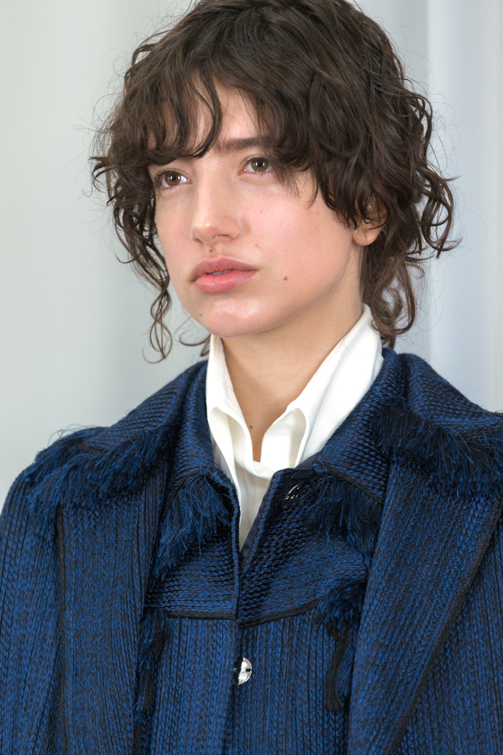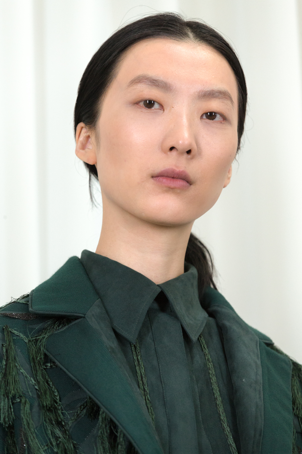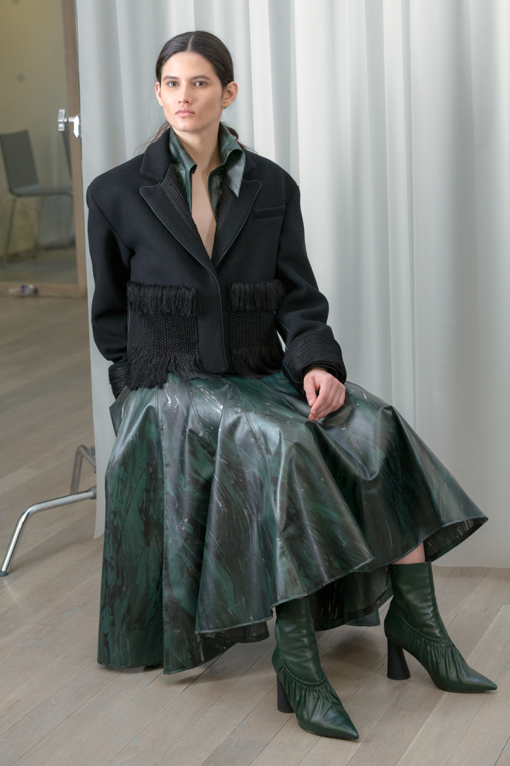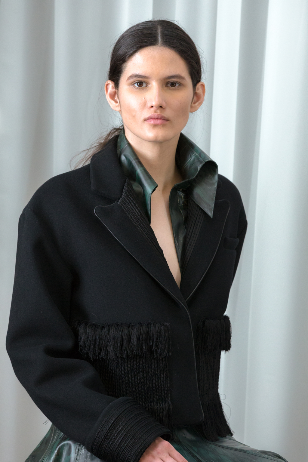 Artful craftsmanship and deconstruction forms the foundation of all of Xu Zhi’s designs and this is evidence through the heavy use of tailoring. Ankle length tailored coats have been placed over wide leg trousers and alongside artfully pleated skirts. Carefully placed yarn tassels have been bunched across the blunt lines of the tailoring, representing paint splashes.