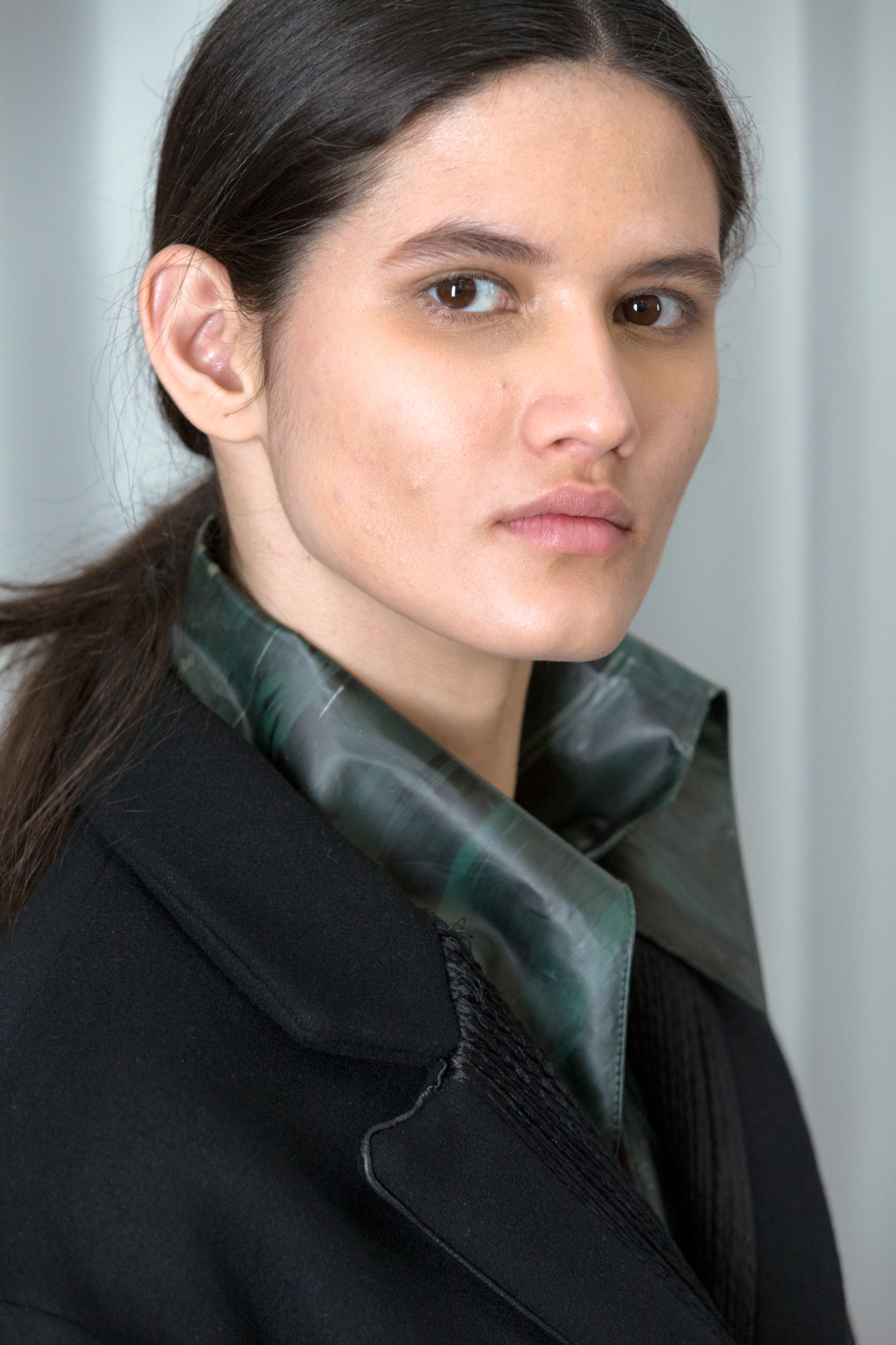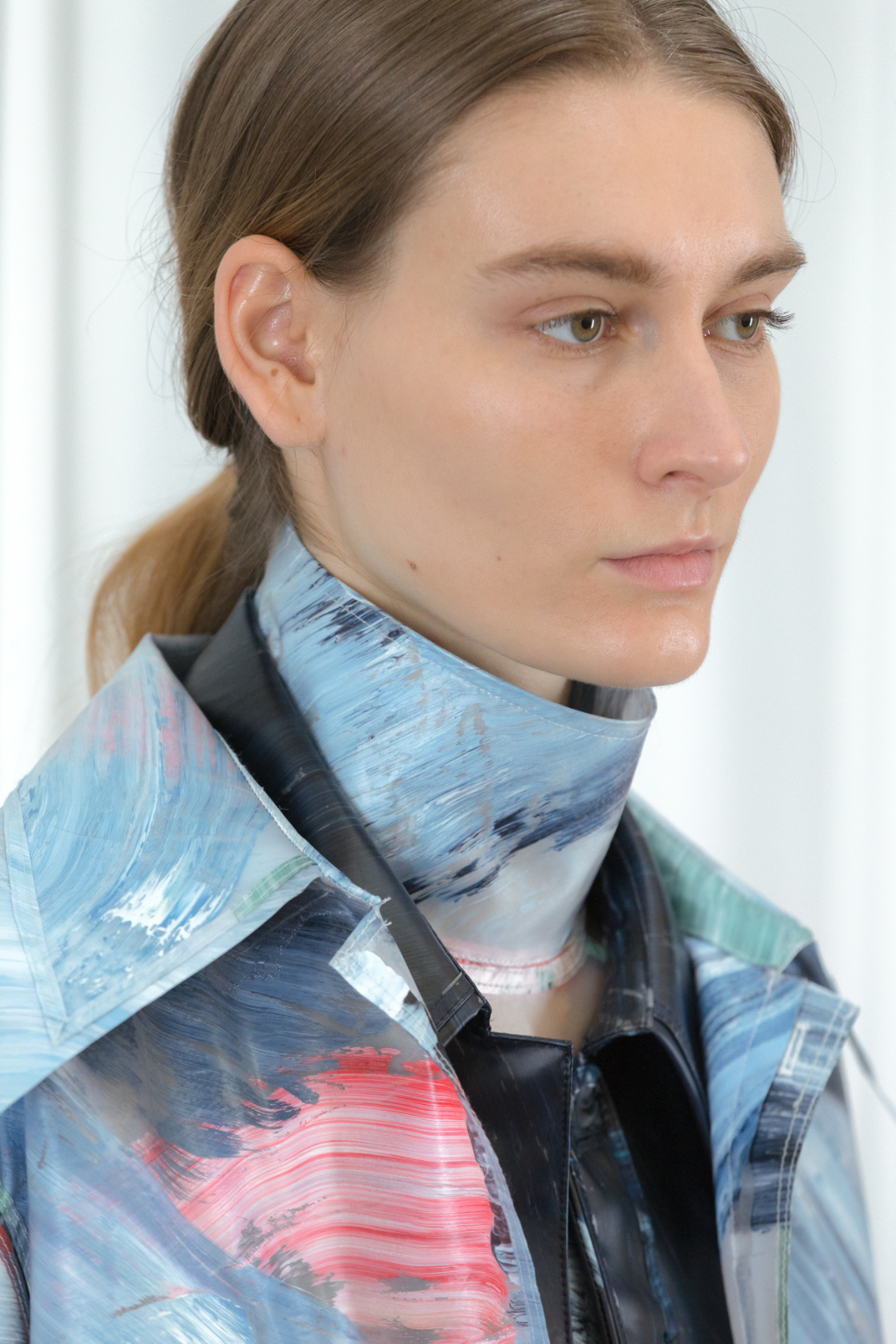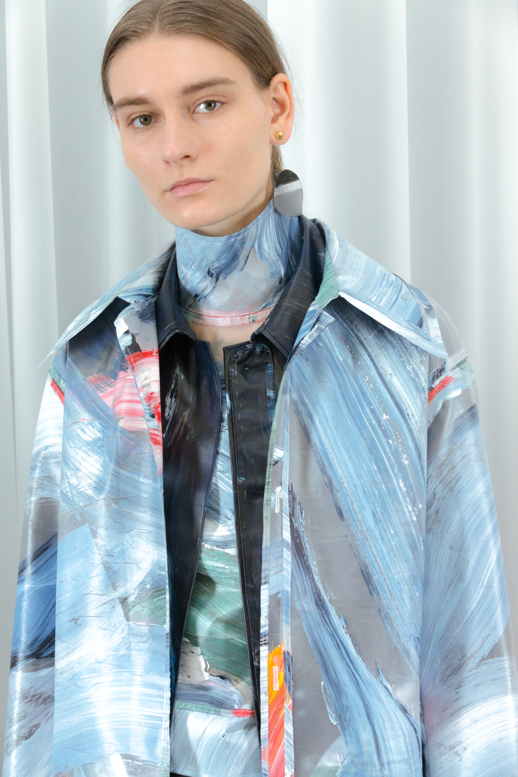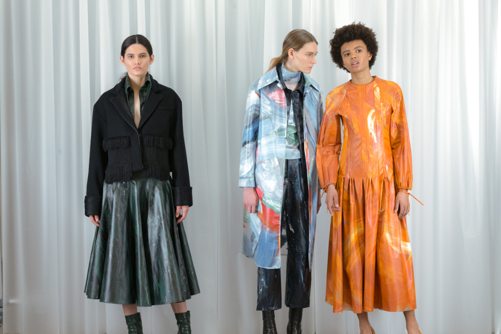 Zhi has taken the essence of Gerhart Richter’s photographs of Rossetti’s photography smeared with paint and used this as the basis of the fabric throughout the collection. Ankle length skirts and coats have been given a waxy finish, mimicking the sheen of oil paintings. Washes of paint have been brushed across the surface displaying moody tones of green while a stand-out coat is stood by its side in contrasting melancholy blue and grey. One dress seems to have been pulled from Rossetti’s The Lady of Pity painting itself, mirroring the mix of gloomy orange, topped with the signature Jane Morris pout.