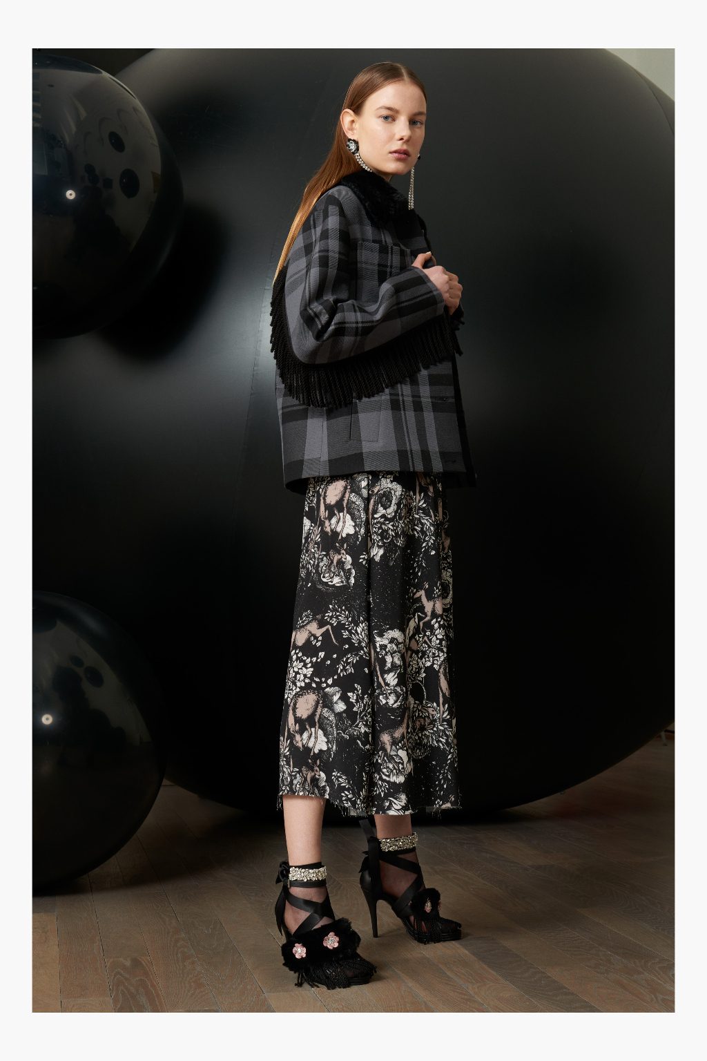 Wrapped in luxury and fantasy, deconstructed dresses and sharp tailoring were lavishly gilded with sequins and layered underneath sprawling checked scarves the size of blankets. Western fringing topped shirts and swung from the hips of skirts, while flowers were embroidered over lace dresses and across devoré skirts, offering a more feminine touch.