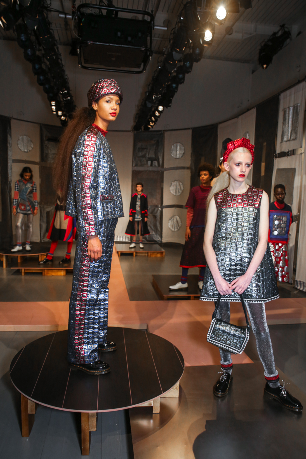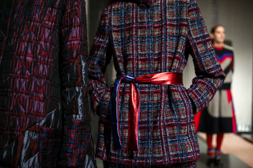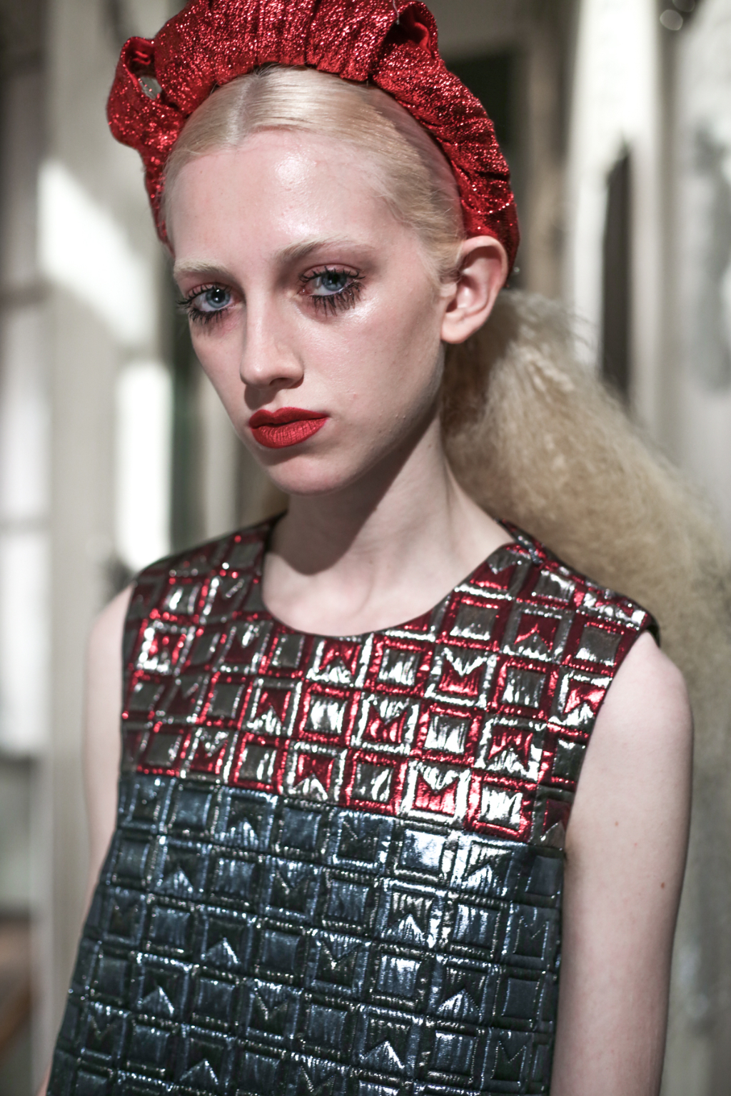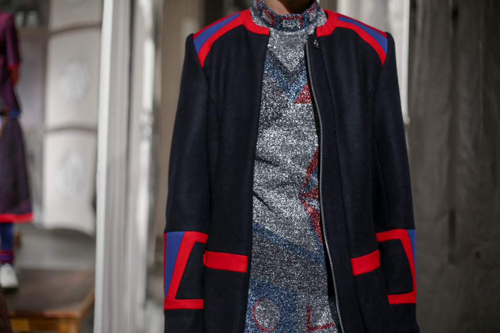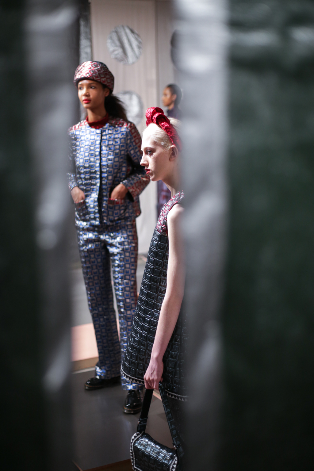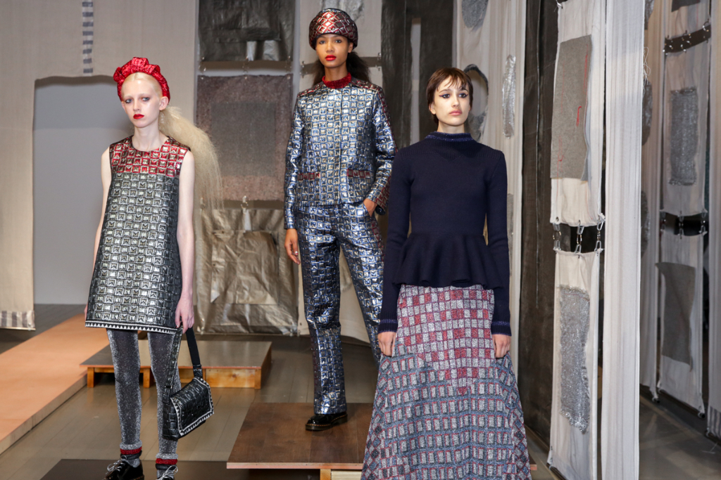 A selective colour scheme of multi-tonal reds, blues and silvers ran through each and every look, unifying a range of metallic textures and patterns that wreaked havoc on the A-line shapes of longline quilted skirts, knitted crew-neck jumpers and 60s mini shift dresses.