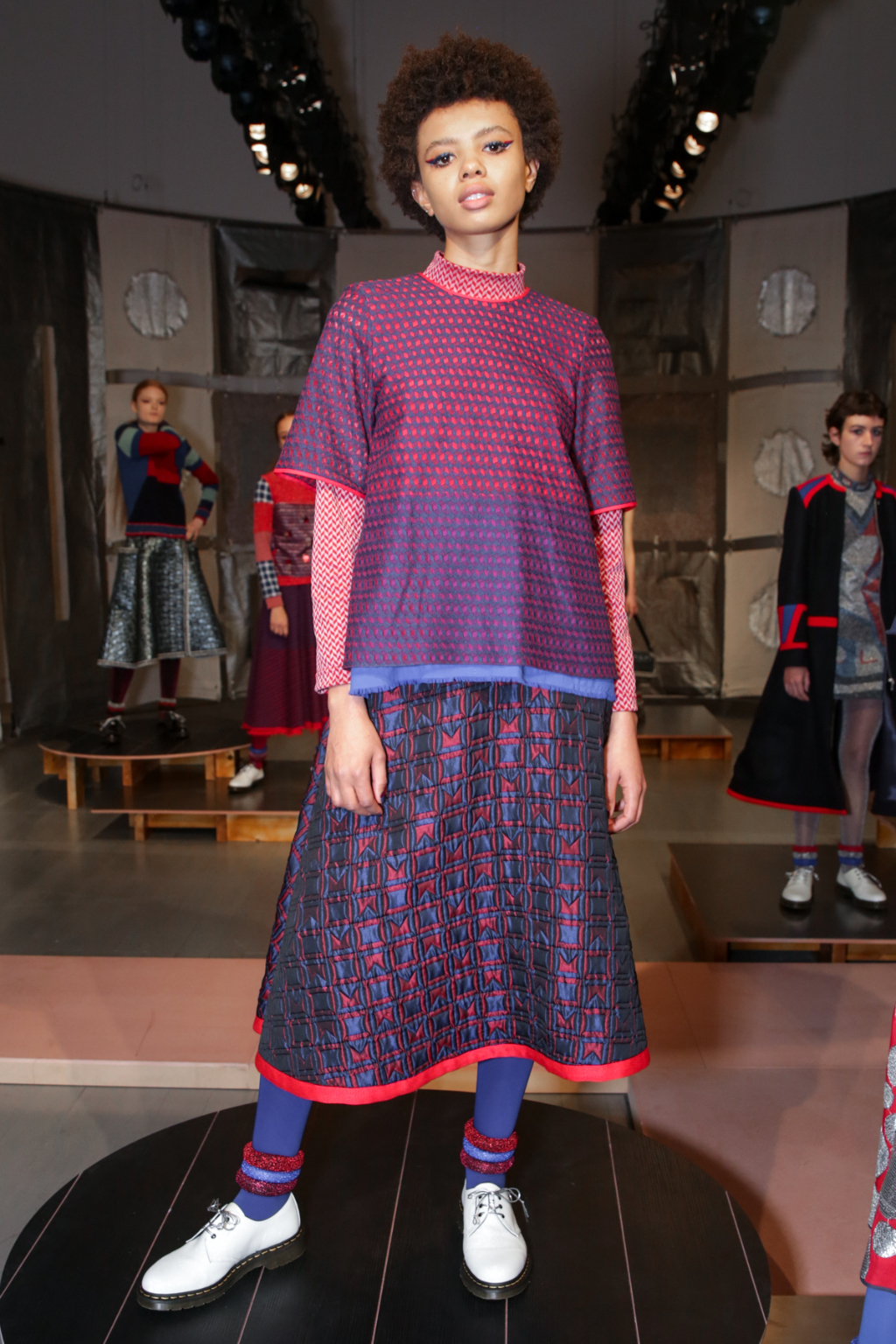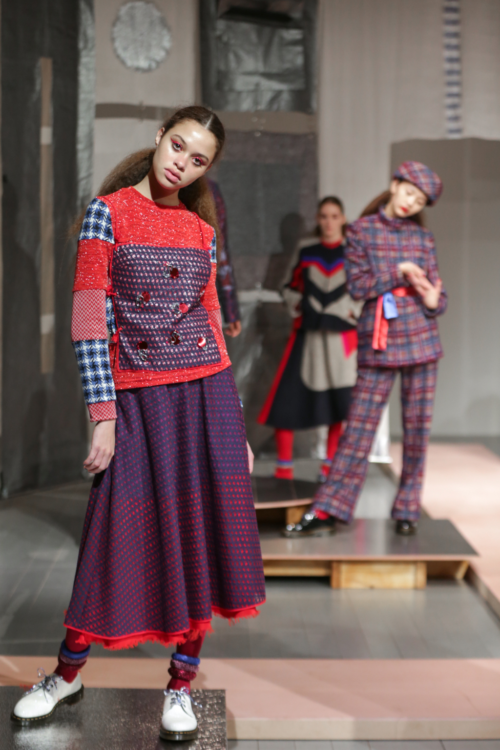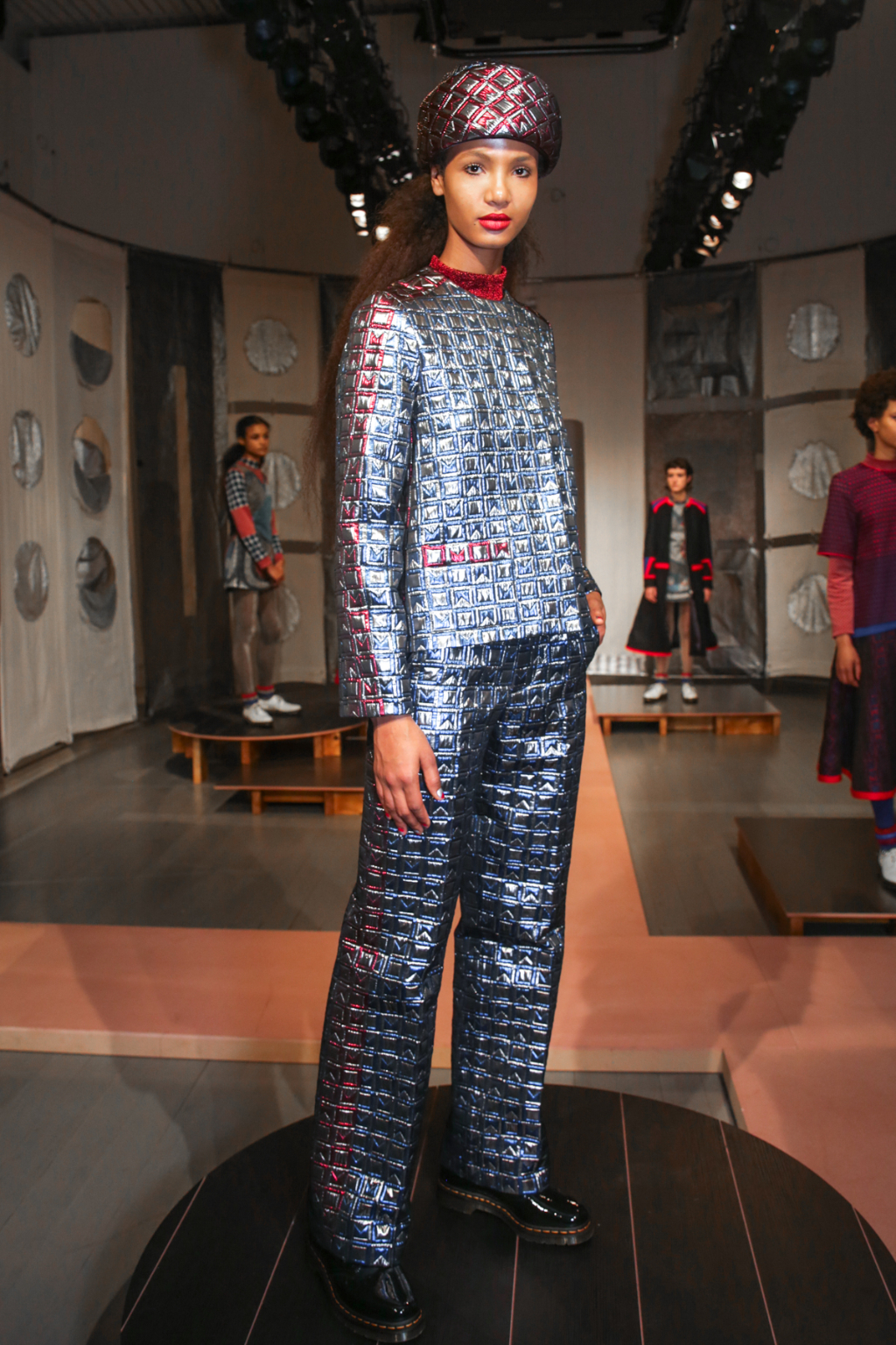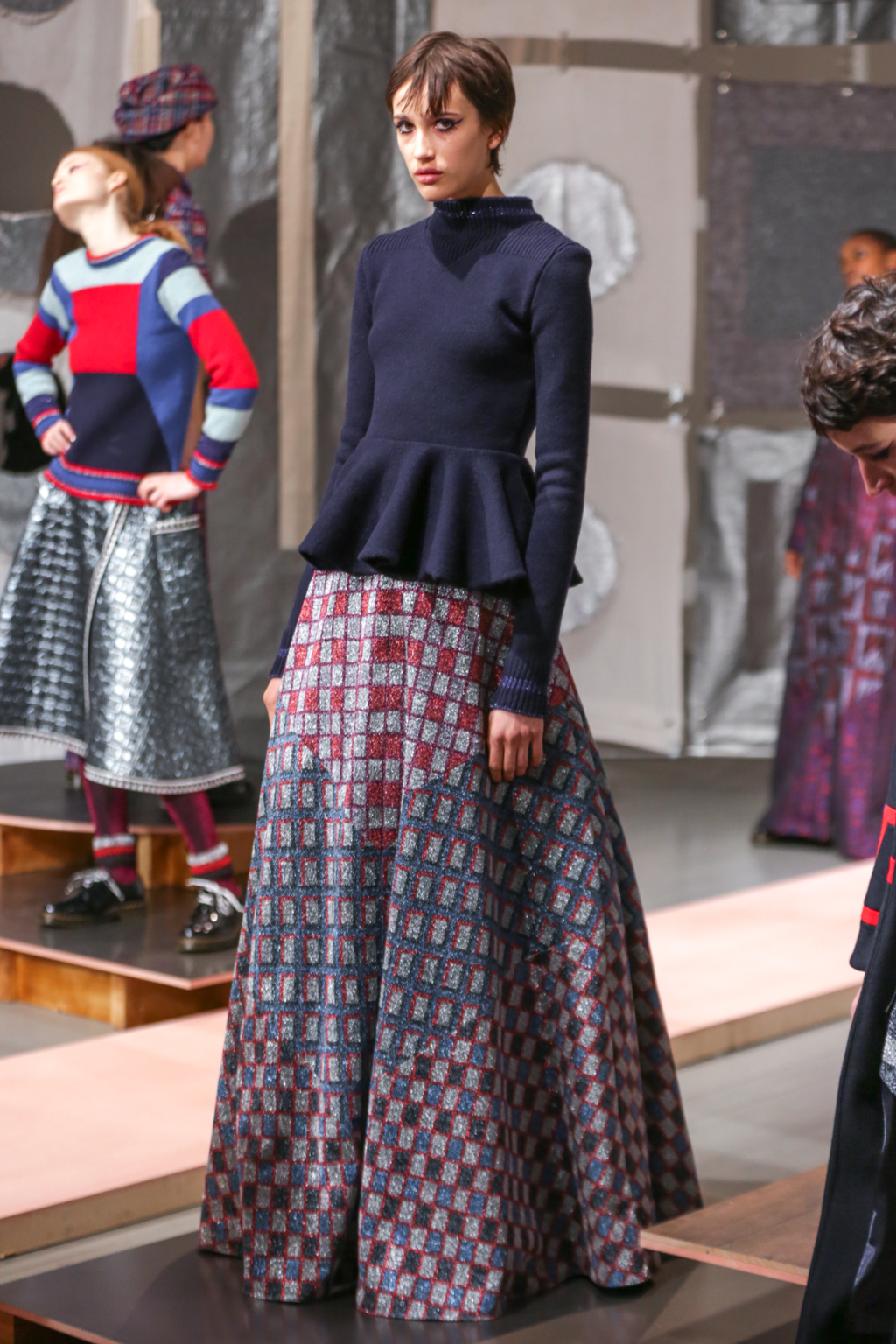 A selective colour scheme of multi-tonal reds, blues and silvers ran through each and every look, unifying a range of metallic textures and patterns that wreaked havoc on the A-line shapes of longline quilted skirts, knitted crew-neck jumpers and 60s mini shift dresses.