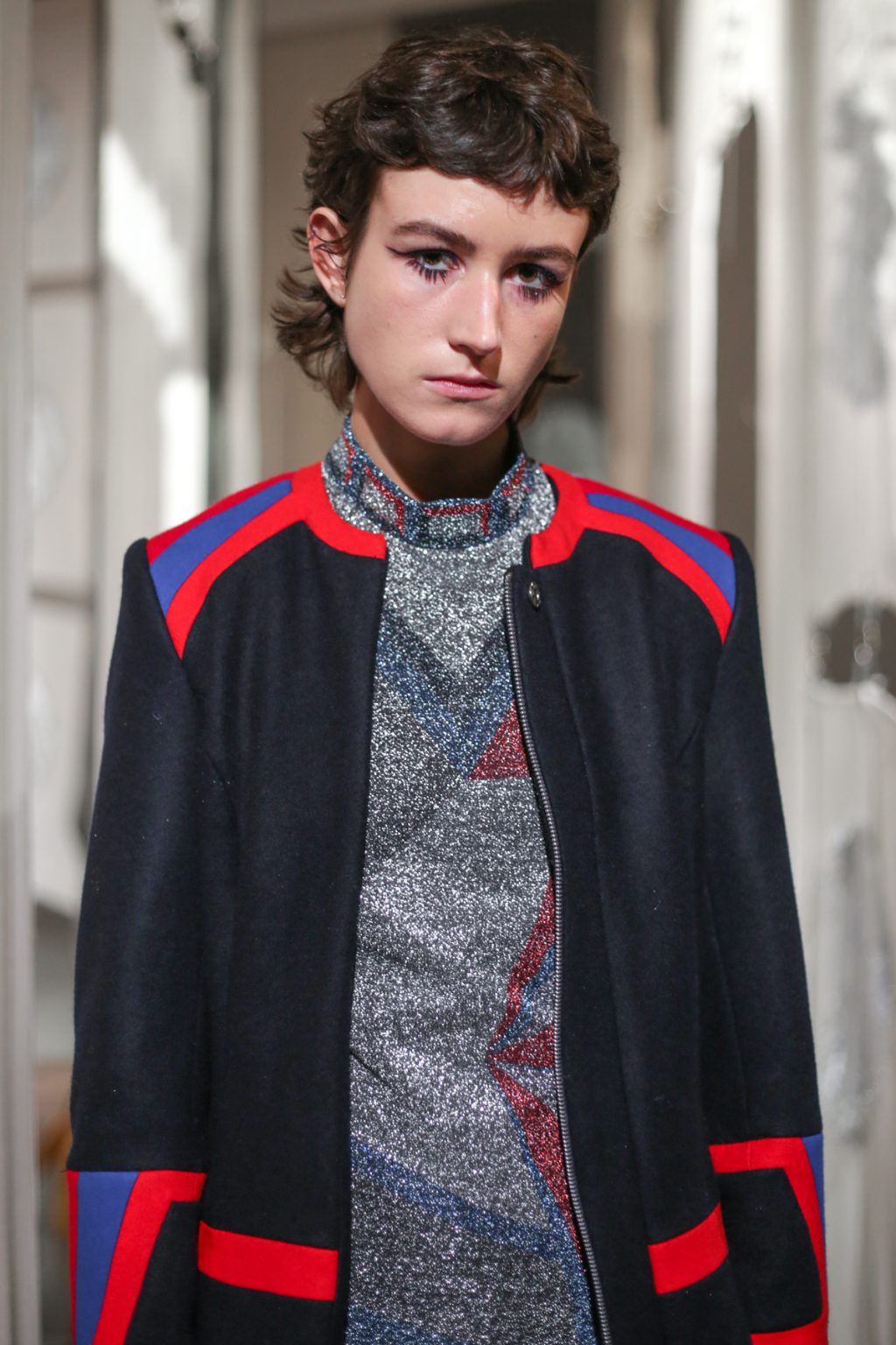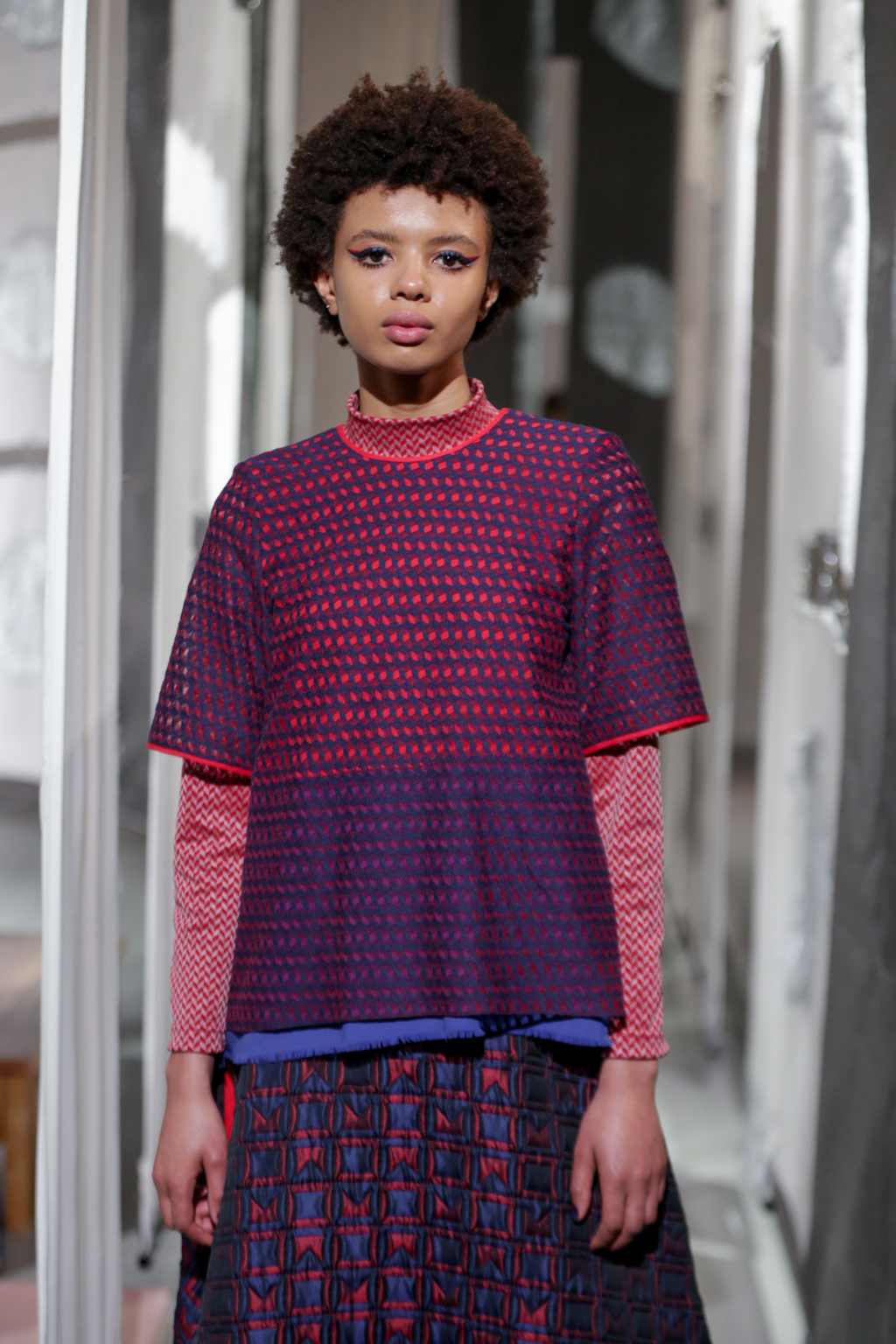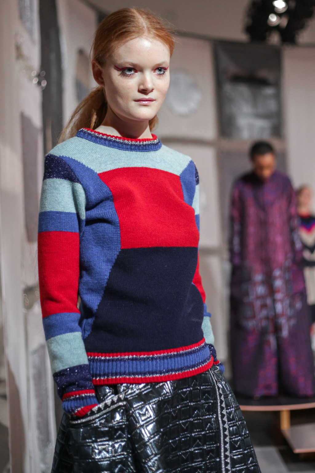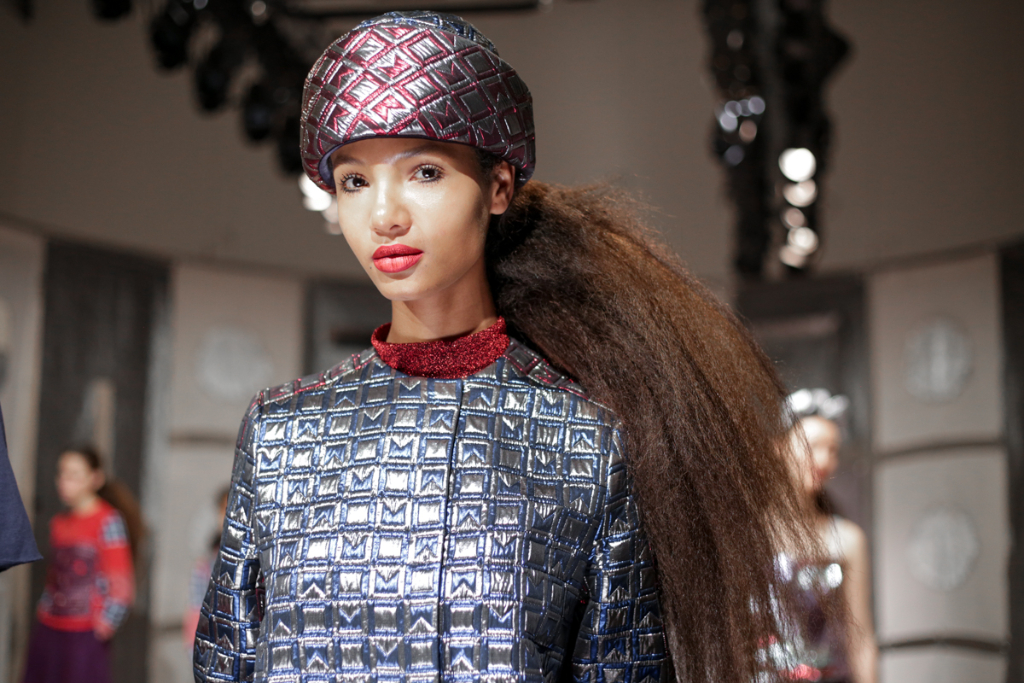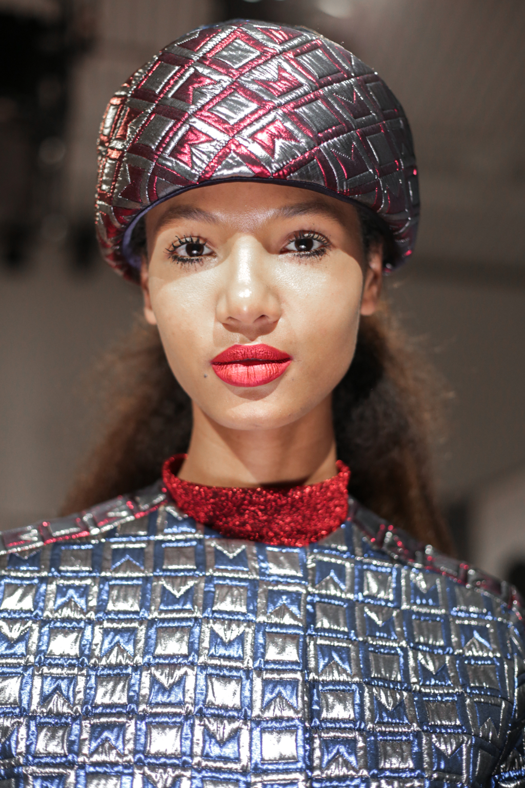 A selective colour scheme of multi-tonal reds, blues and silvers ran through each and every look, unifying a range of metallic textures and patterns that wreaked havoc on the A-line shapes of longline quilted skirts, knitted crew-neck jumpers and 60s mini shift dresses.