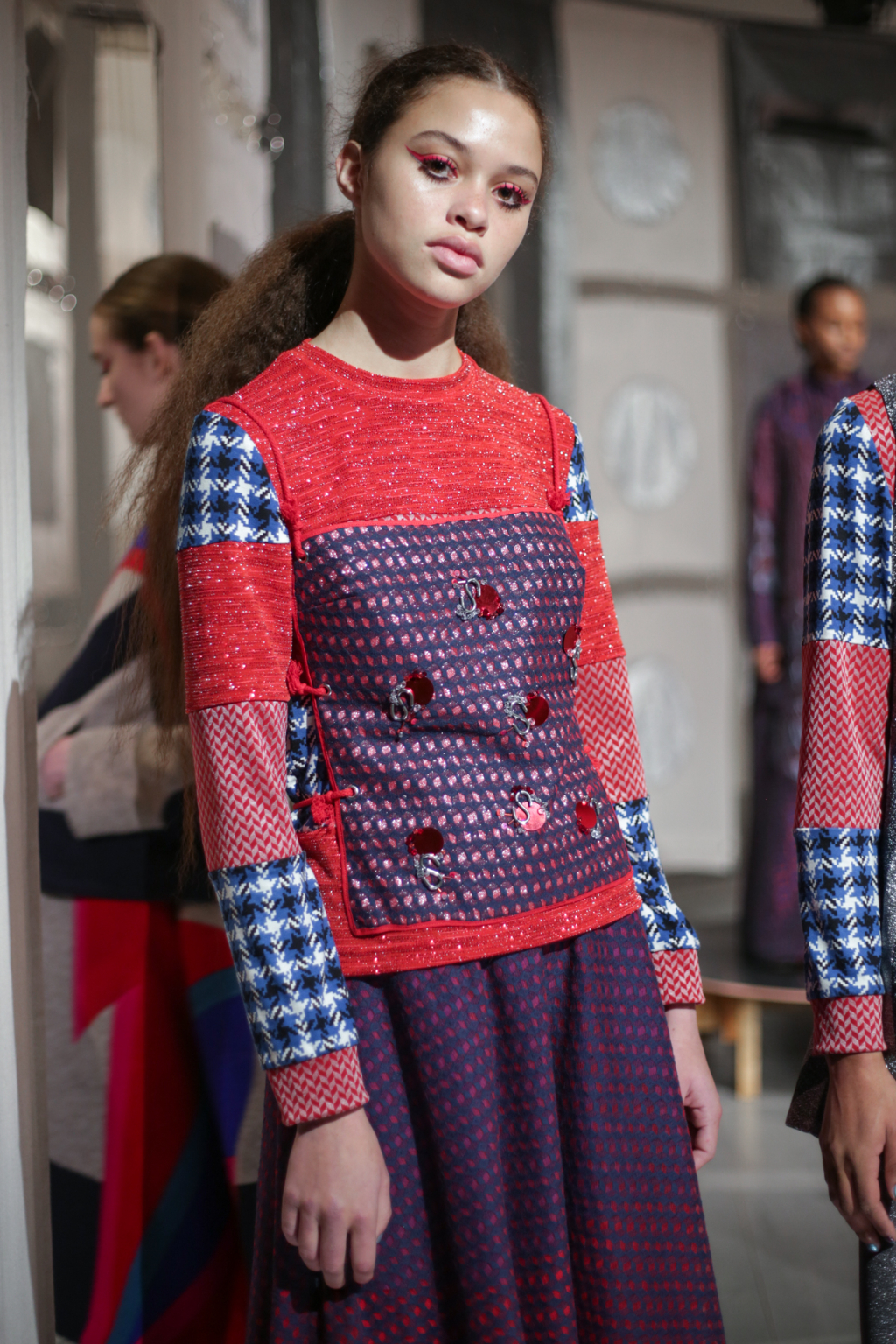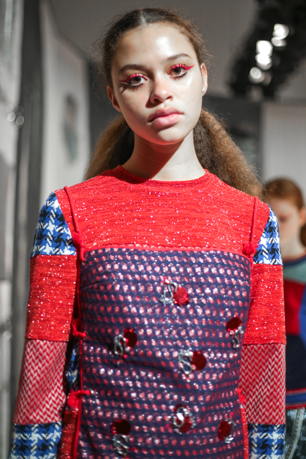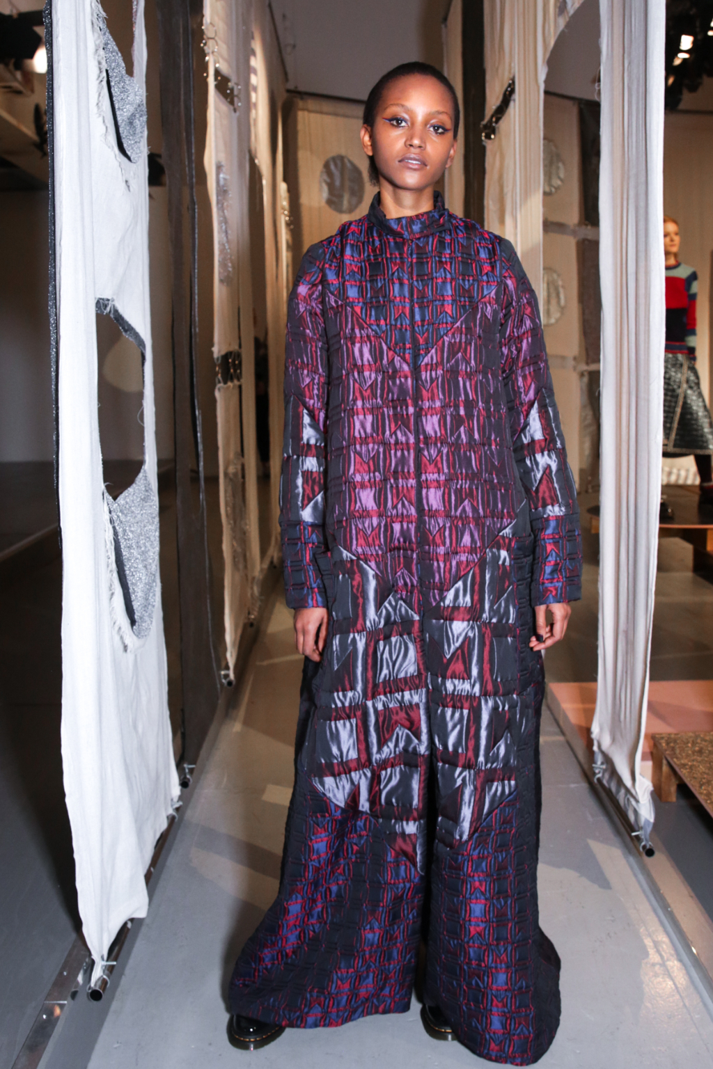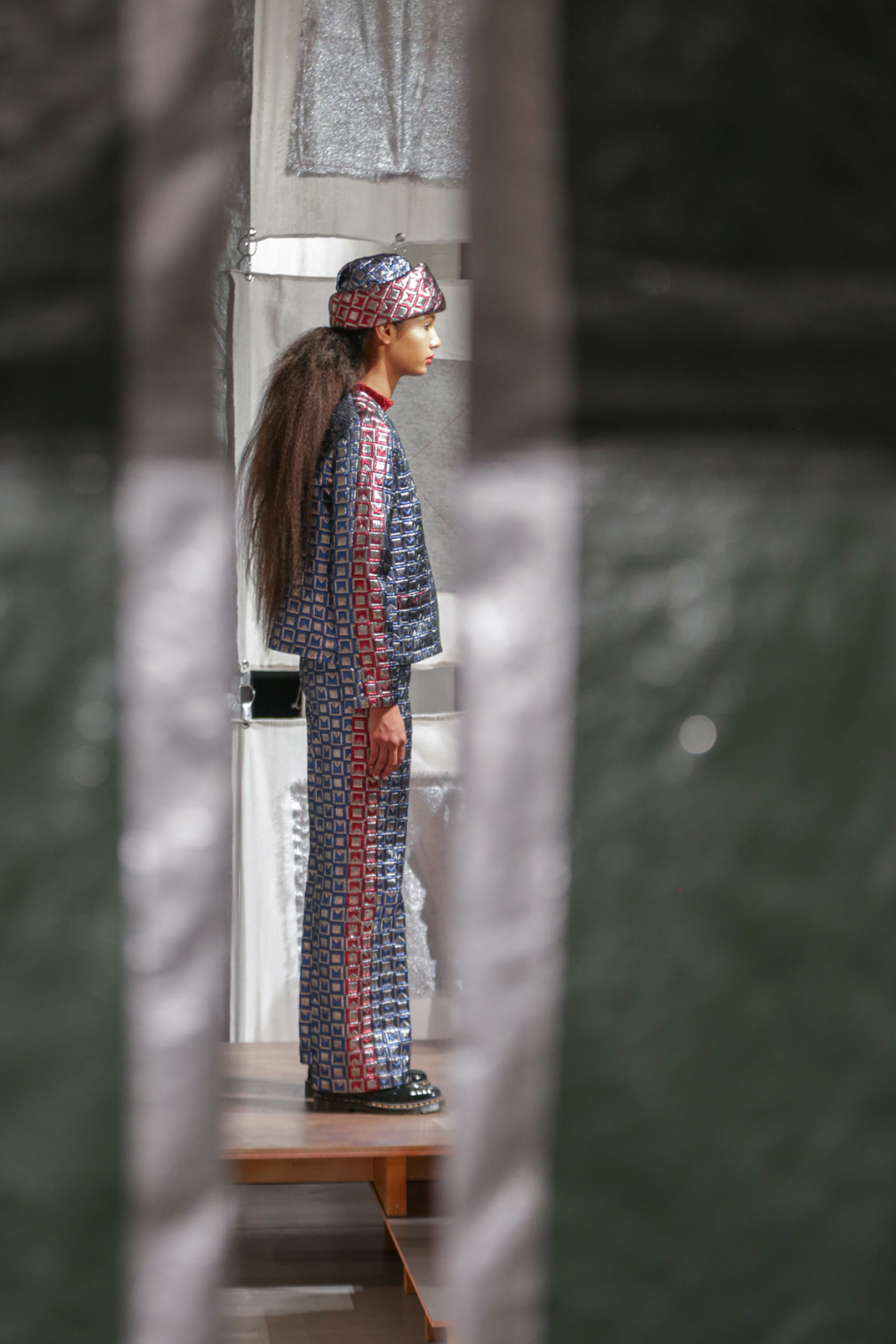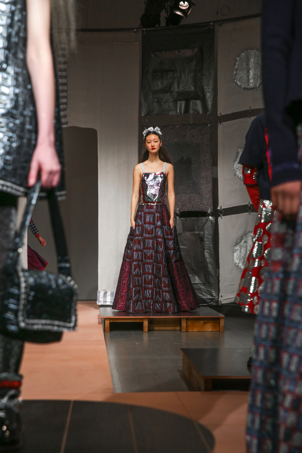 A selective colour scheme of multi-tonal reds, blues and silvers ran through each and every look, unifying a range of metallic textures and patterns that wreaked havoc on the A-line shapes of longline quilted skirts, knitted crew-neck jumpers and 60s mini shift dresses.