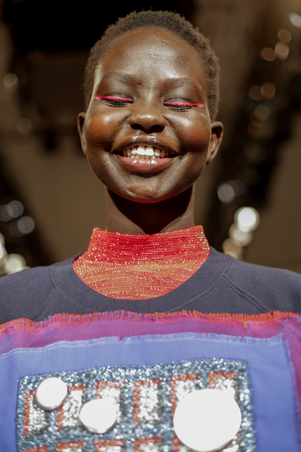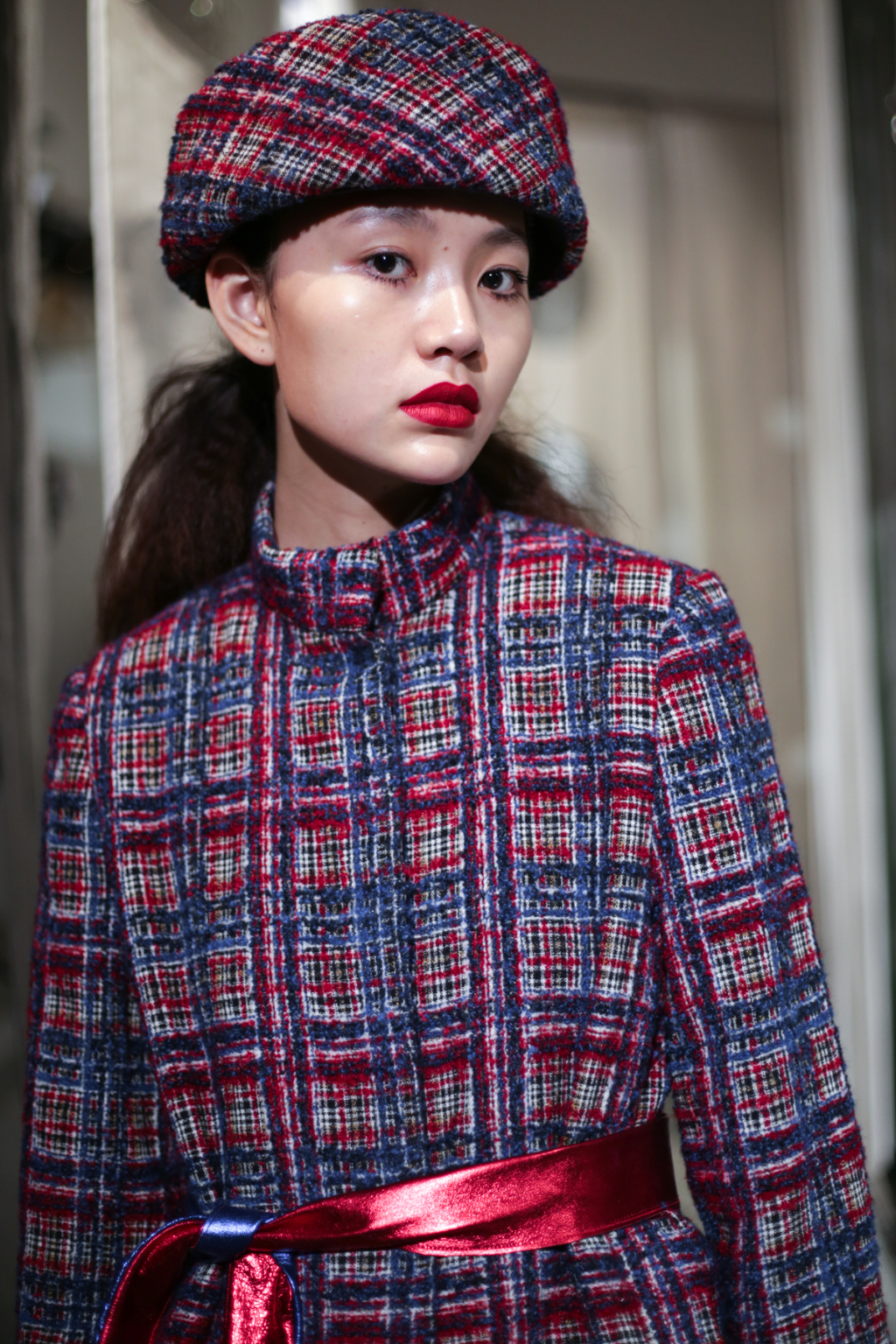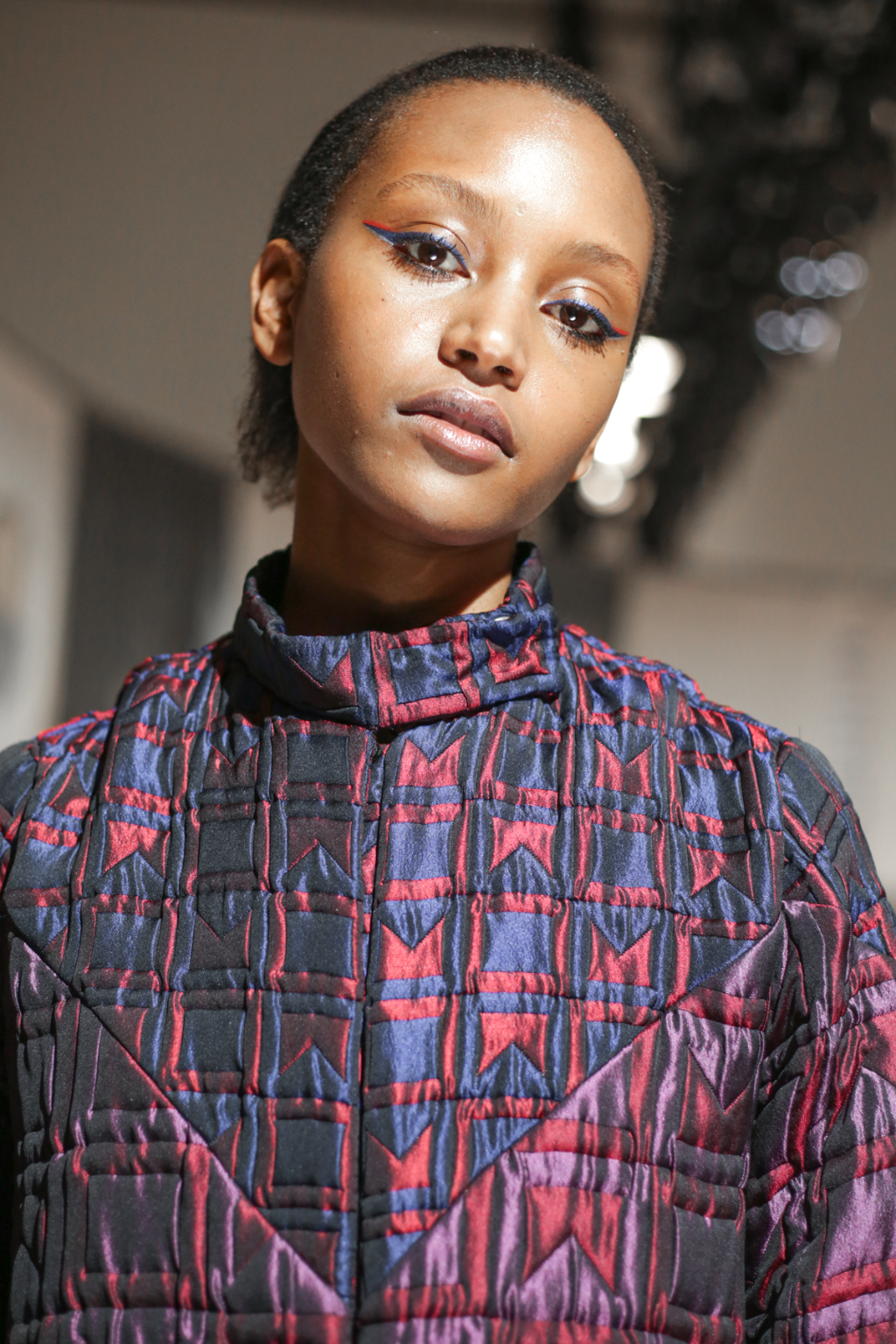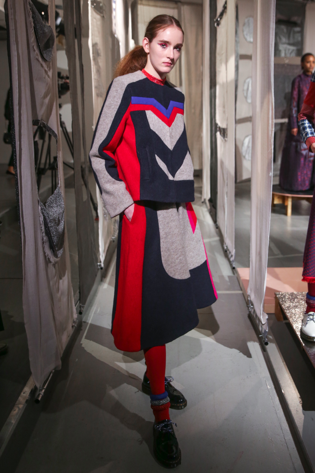 A selective colour scheme of multi-tonal reds, blues and silvers ran through each and every look, unifying a range of metallic textures and patterns that wreaked havoc on the A-line shapes of longline quilted skirts, knitted crew-neck jumpers and 60s mini shift dresses.
