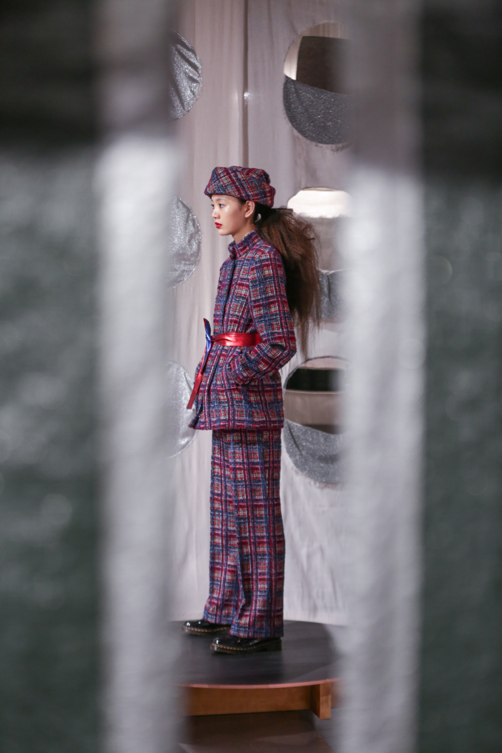 Amongst the collaborative effort were metallic two-piece suits, a sequined square-neck camisole, a collarless A-line coat and a magnificent aubergine-hued cloak that shifted slightly in iridescence with every movement. Meanwhile, metallic leather hairbands, Jackie O hats and saccharine lurex crowns added a touch of eccentricity and fun to the main collection.