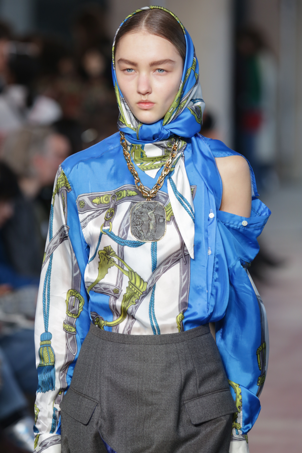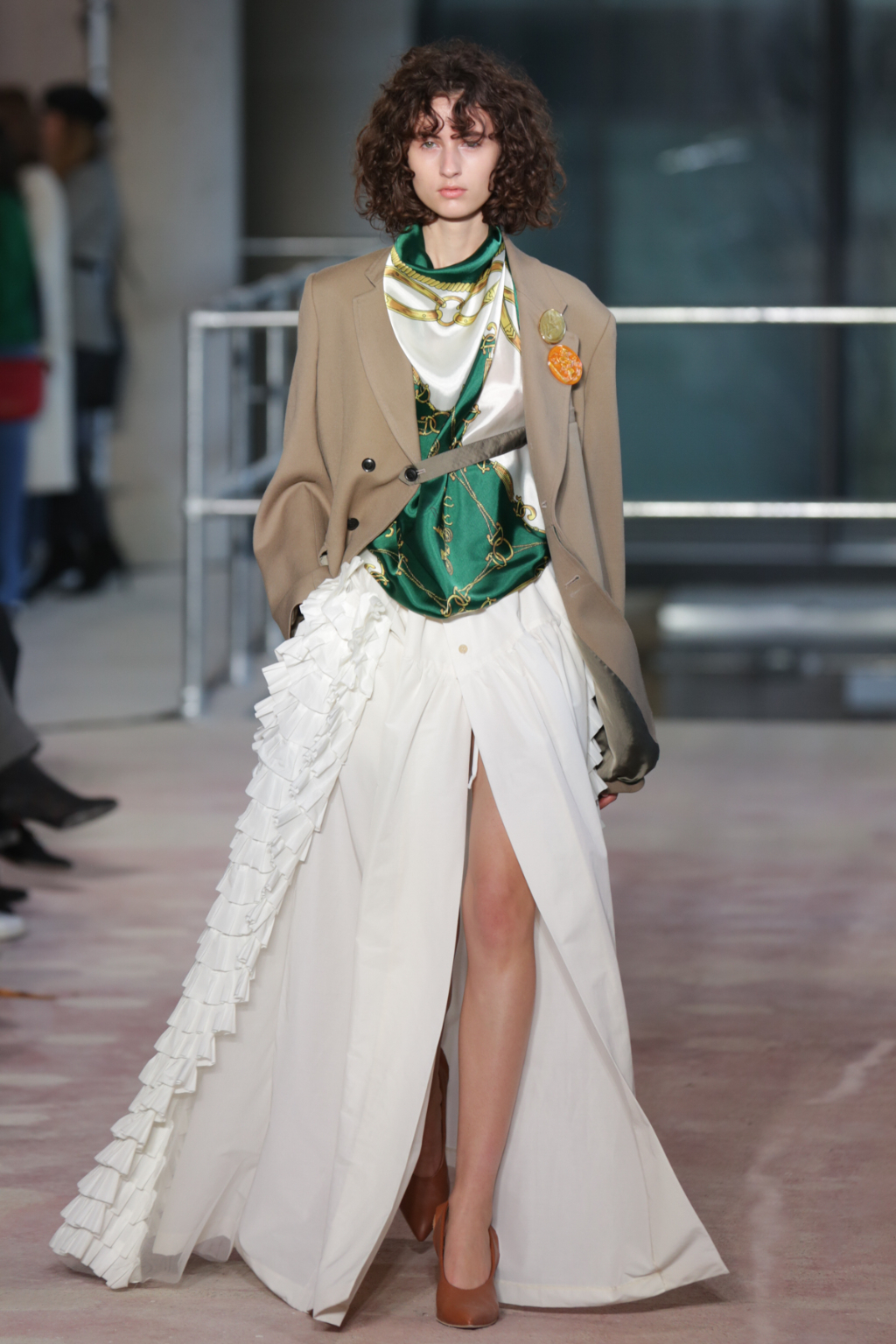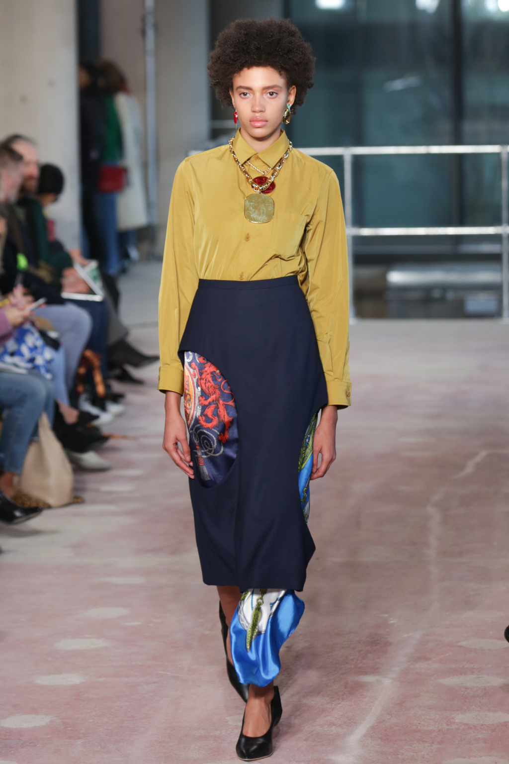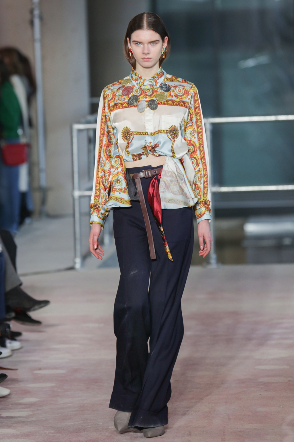Although style sentiments were rather Dynasty-esque (absolutely a compliment, to clarify), they were cannily worked into contemporary pieces. Intricately-printed silk scarves (think vintage Versace or Ralph Lauren) took form in blouses and sleeves, and trickled down the hems of outfits to create asymmetry.