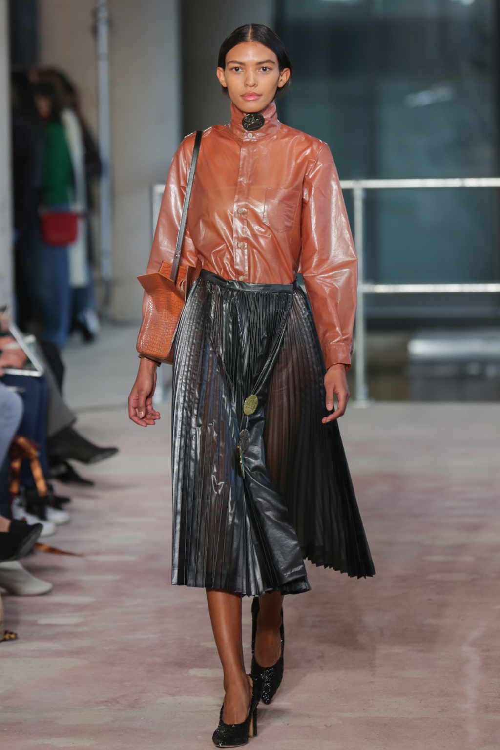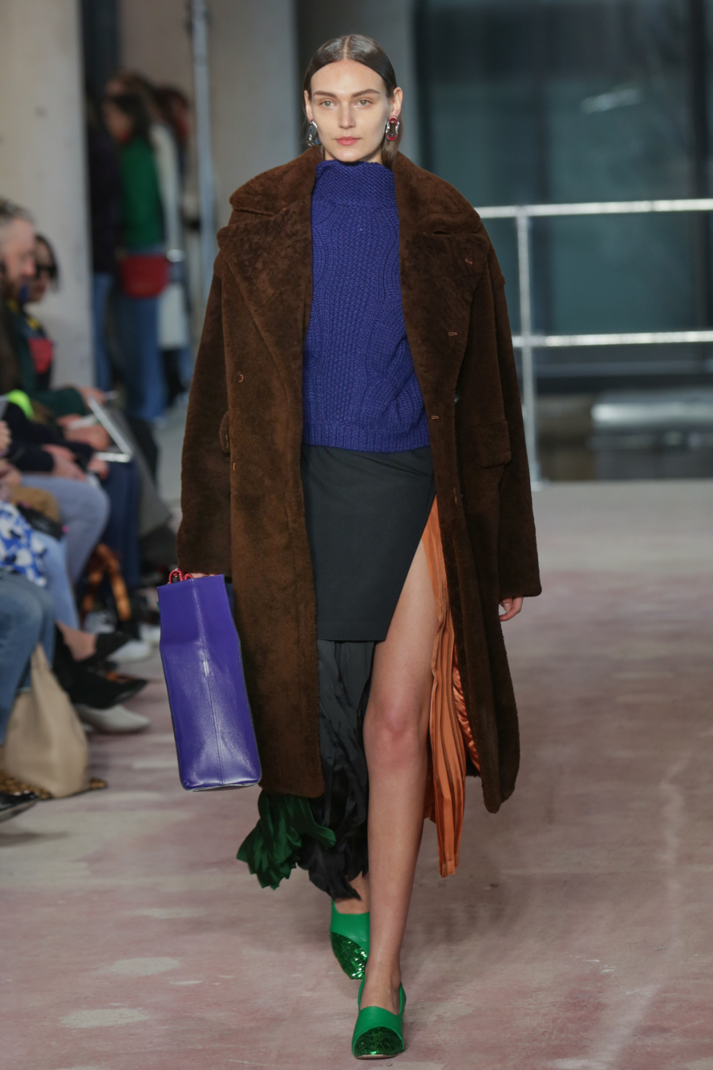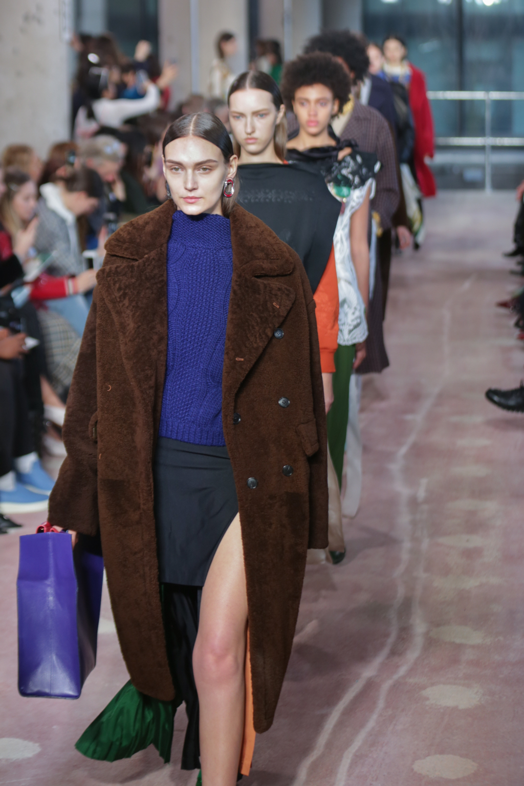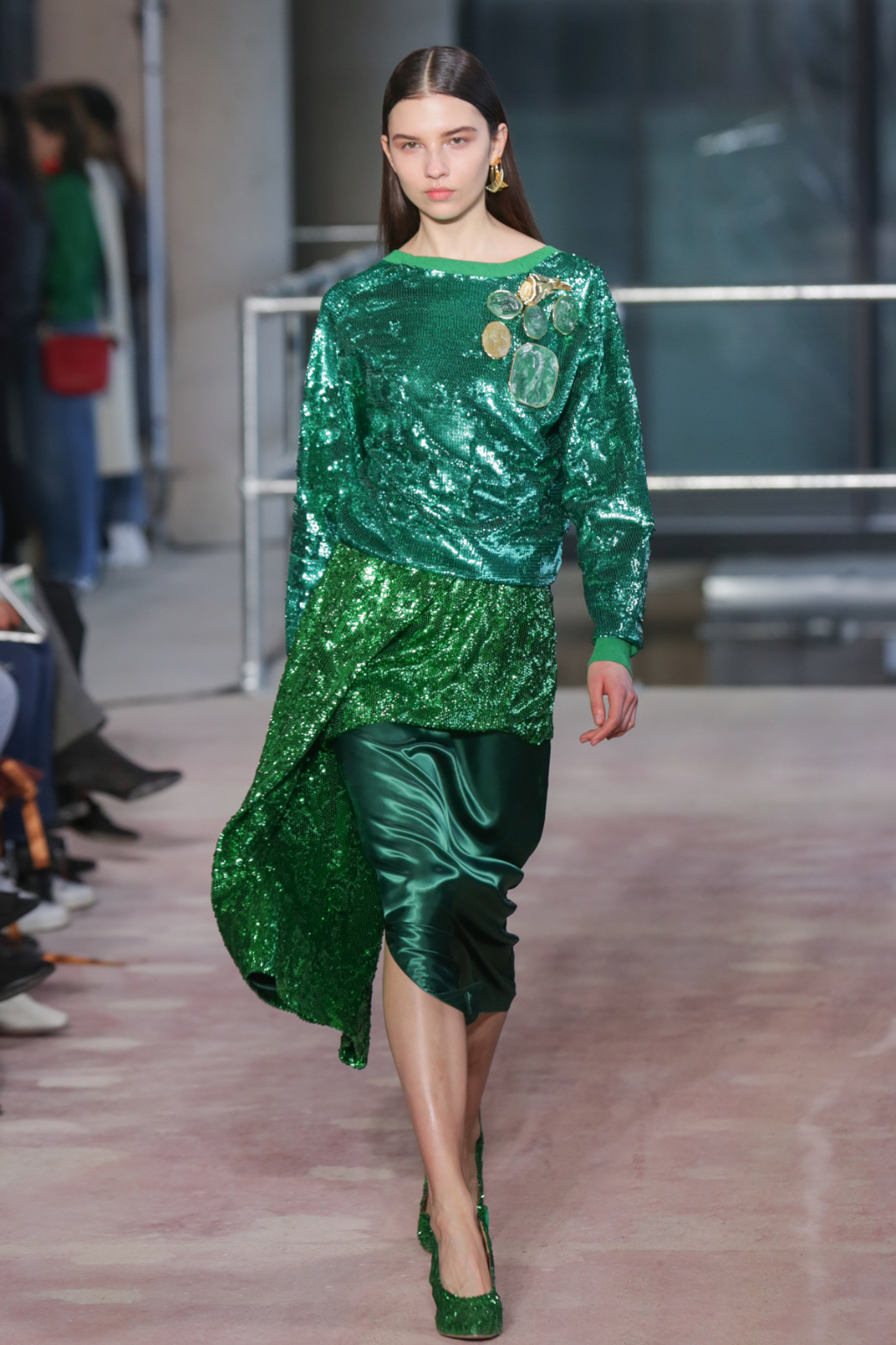 Textures were lightweight, but everything else was nothing short of decadent. There was an abundance of overcoats in different finishes, from glossy black vinyl to cocoa-hued teddy to forest-Green leather, but one outstanding piece was a jewel-encrusted technicolor dreamcoat.