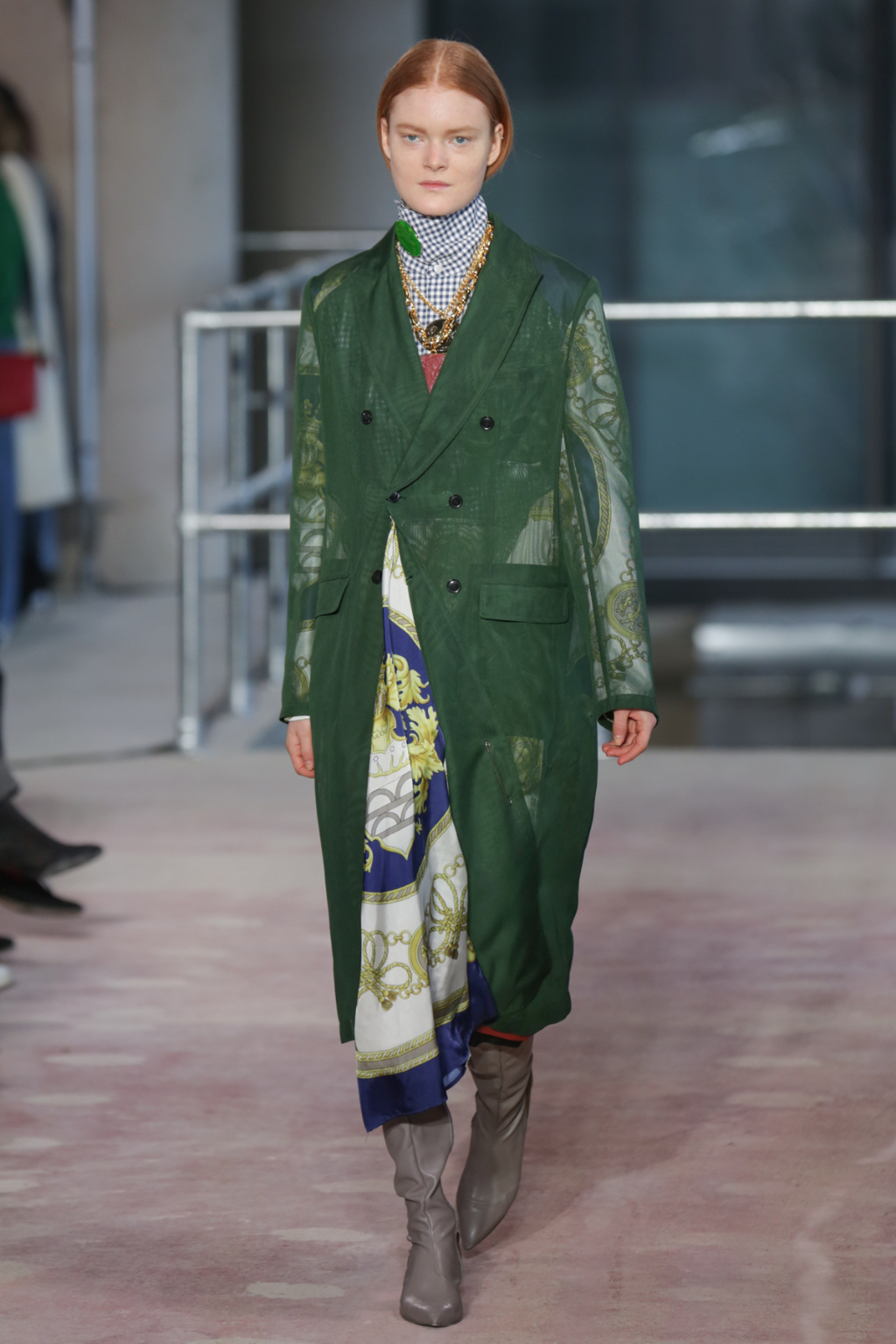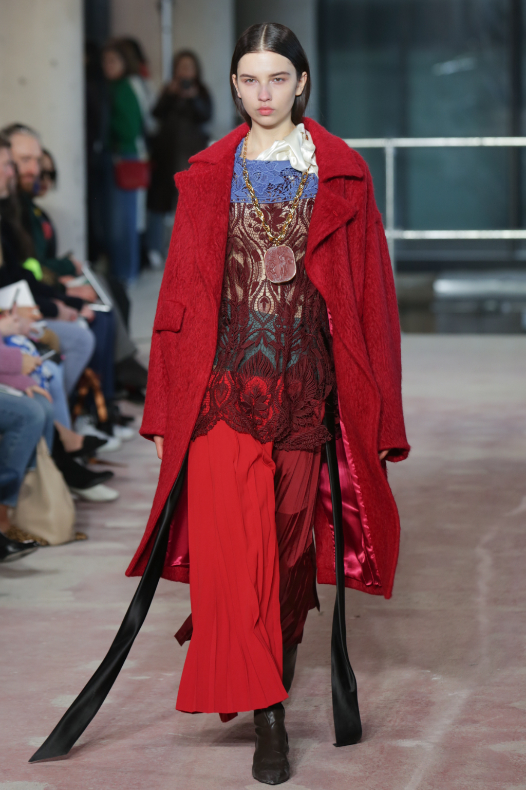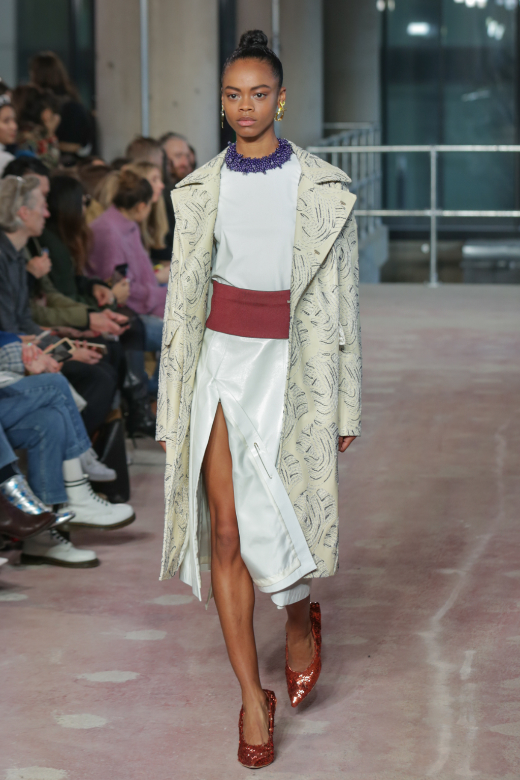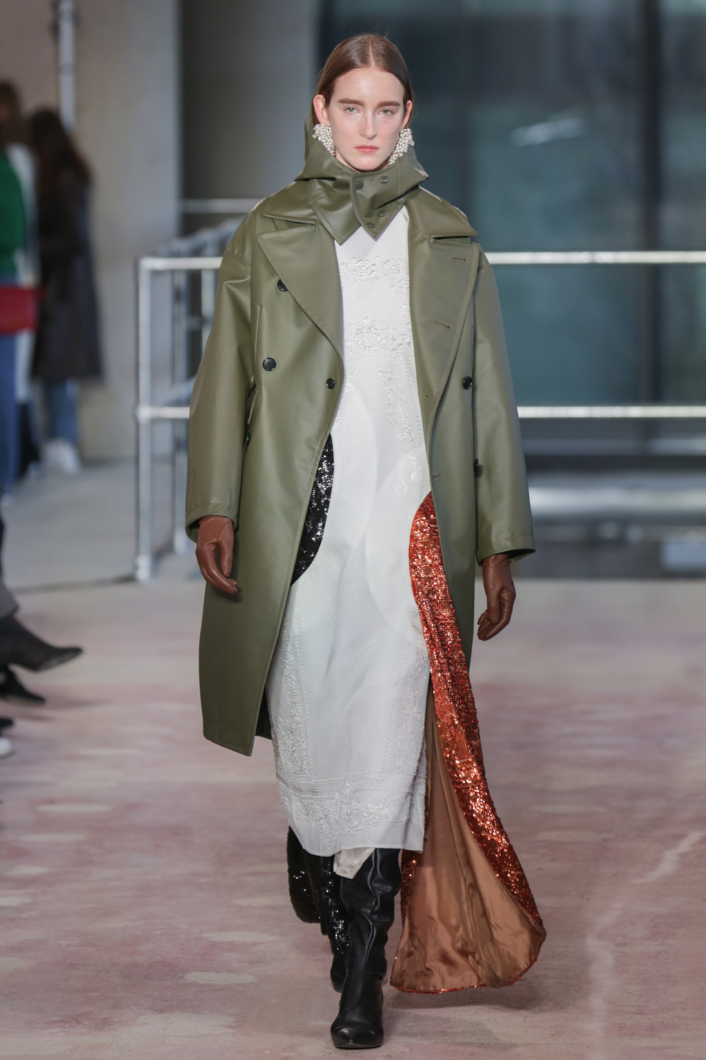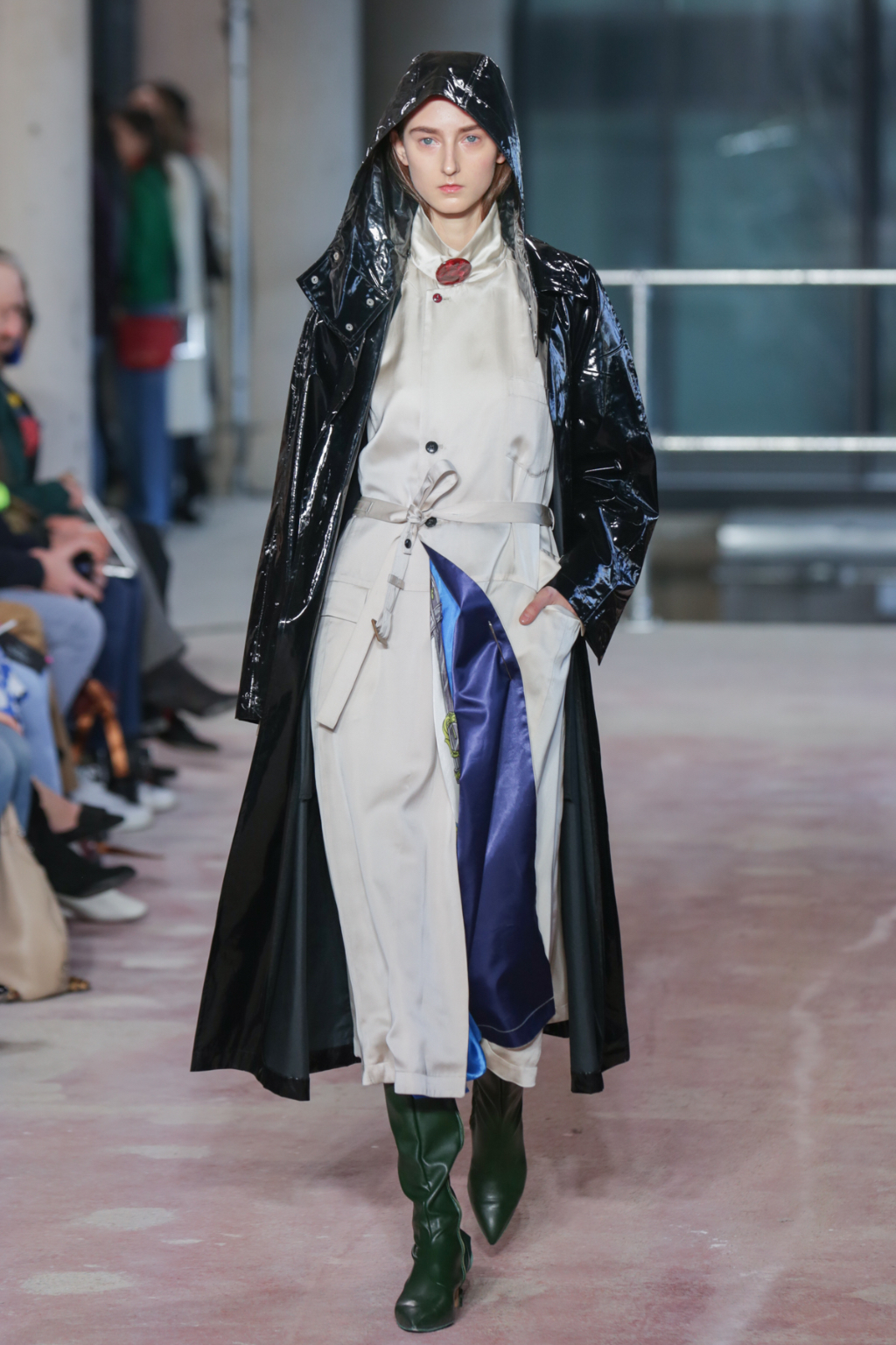 Textures were lightweight, but everything else was nothing short of decadent. There was an abundance of overcoats in different finishes, from glossy black vinyl to cocoa-hued teddy to forest-Green leather, but one outstanding piece was a jewel-encrusted technicolor dreamcoat.