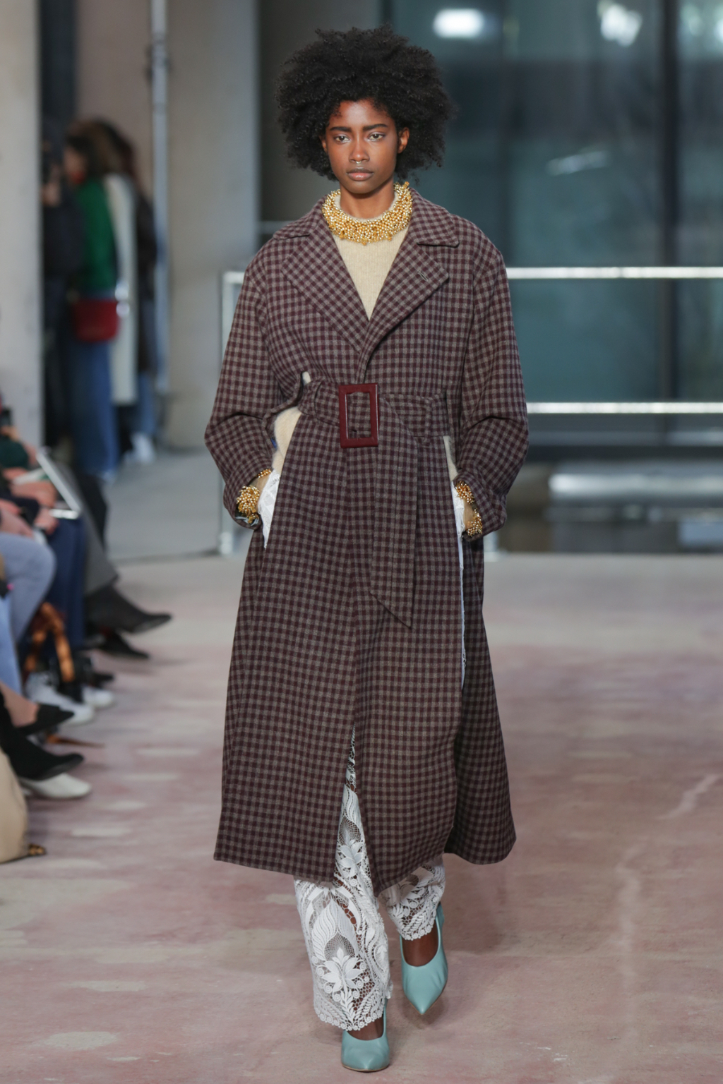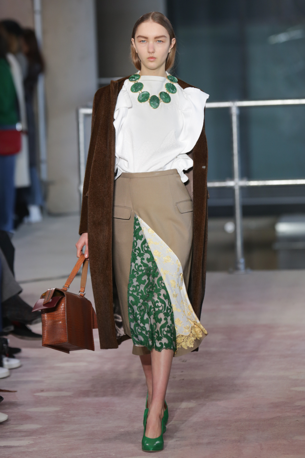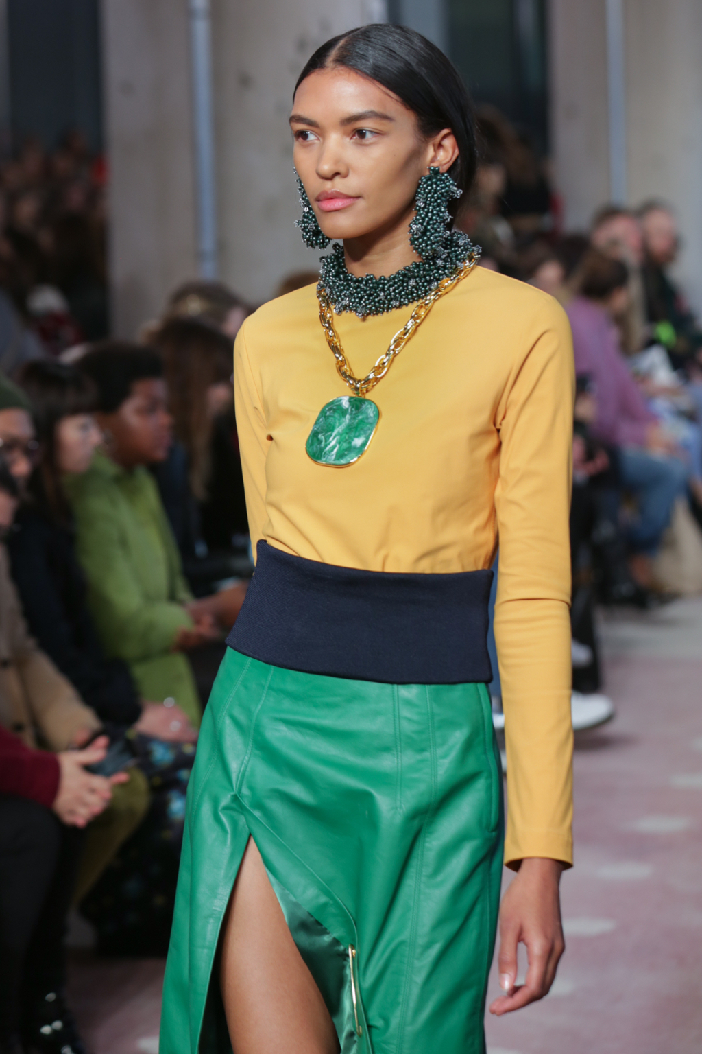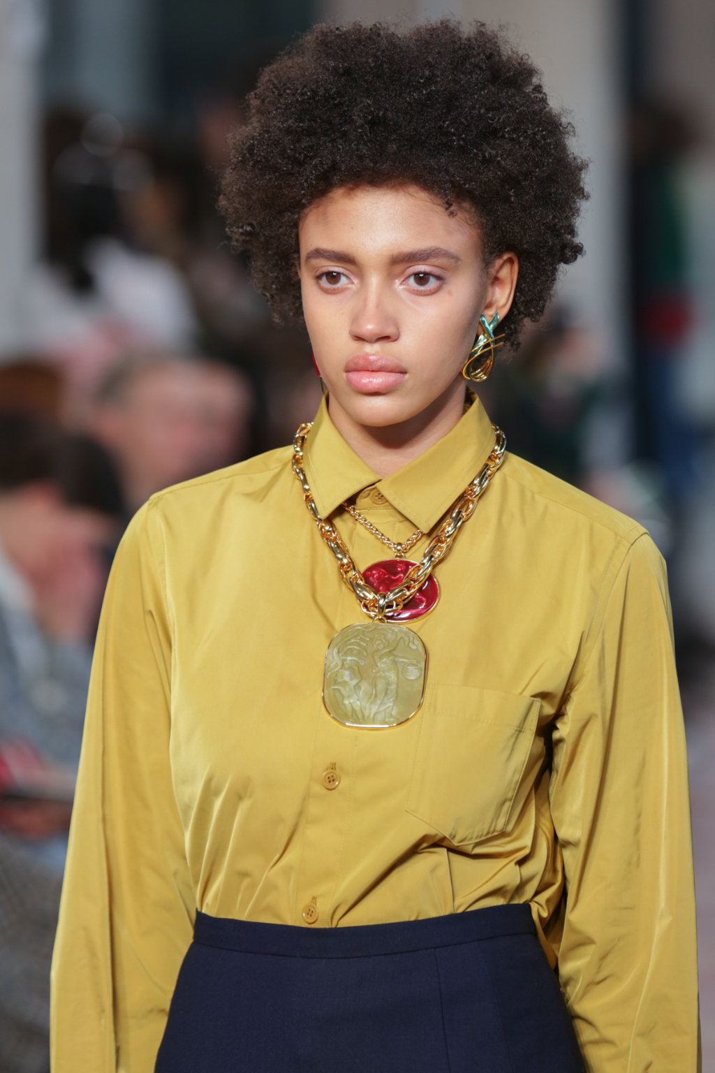 Square, oversized handbags, collars and ears were studded with enormous gemstones, whilst the ornaments also swung zealously from chunky gold chains. Mirroring the natural element of these minerals were some of the reoccurring hues in the collection. Shades of green included khaki, bottle green and vivid emerald; mink, navy and beige also complemented the richer saffron, turquoise and copper.