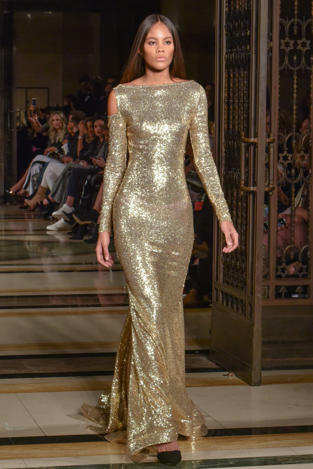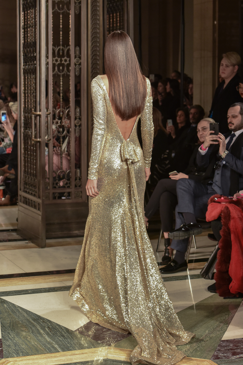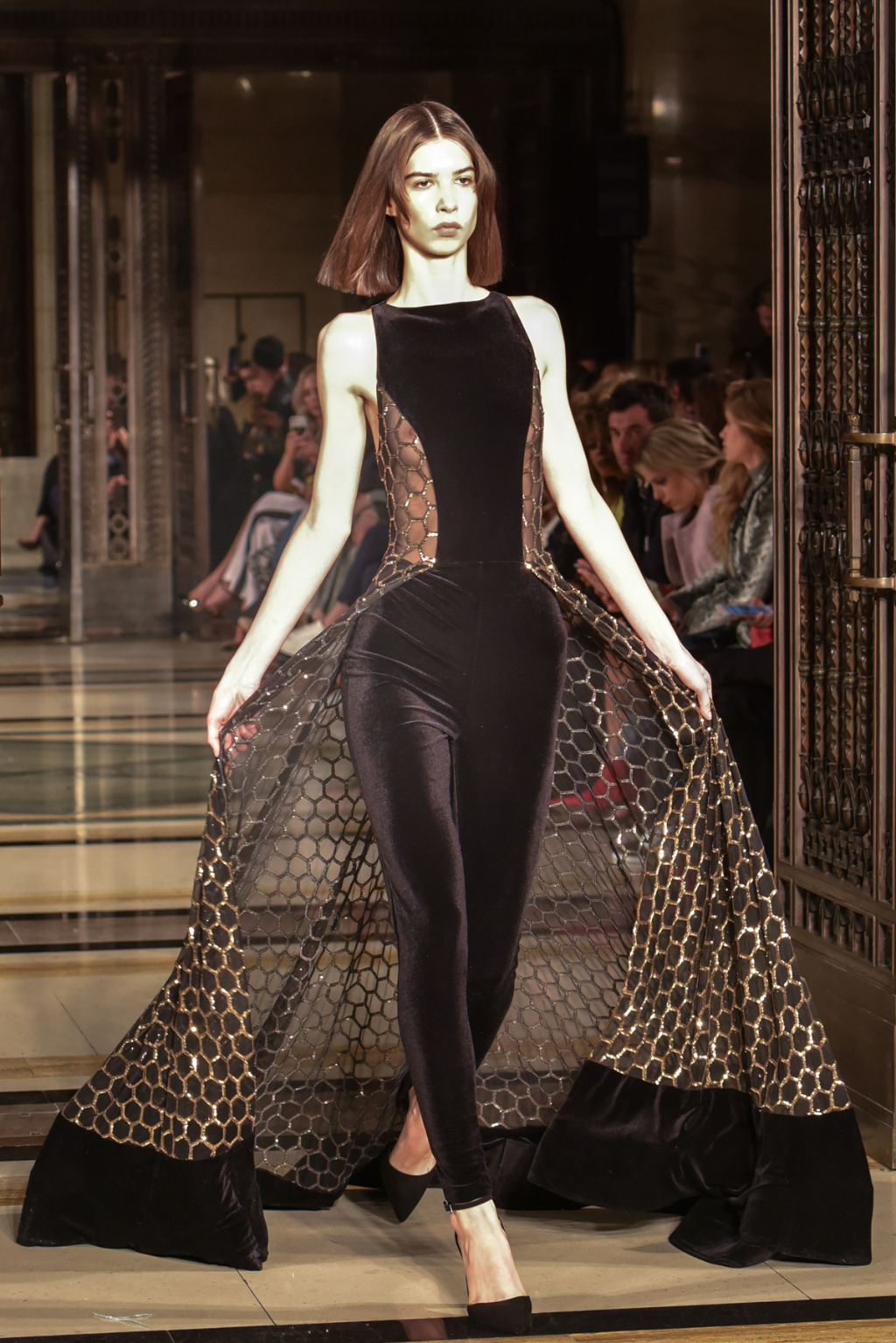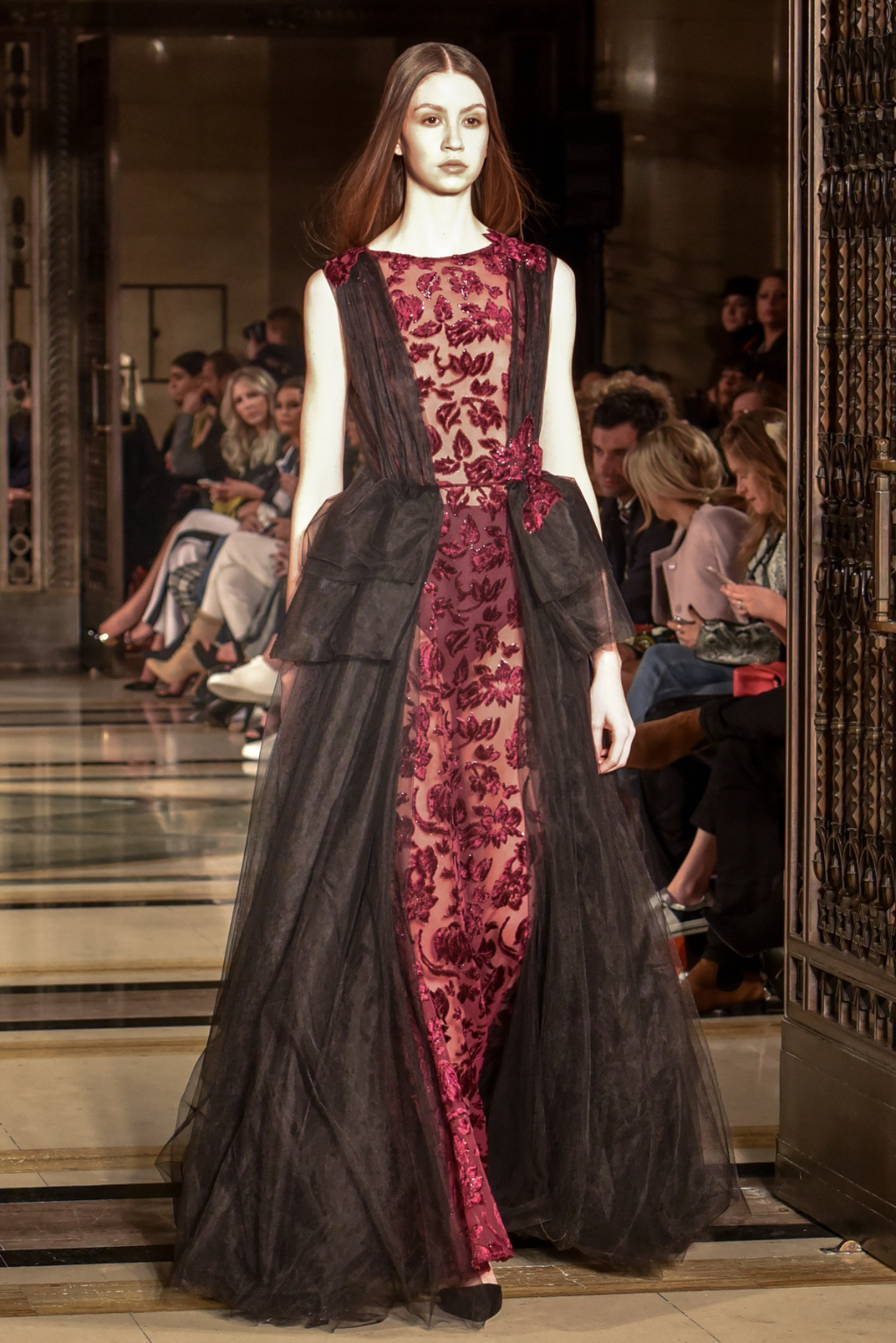 A colour palette of deep red, rich navy and black was beautifully contrasted with gold and silver metallic embellishment, creating the lavish approach that this designer is loved for.