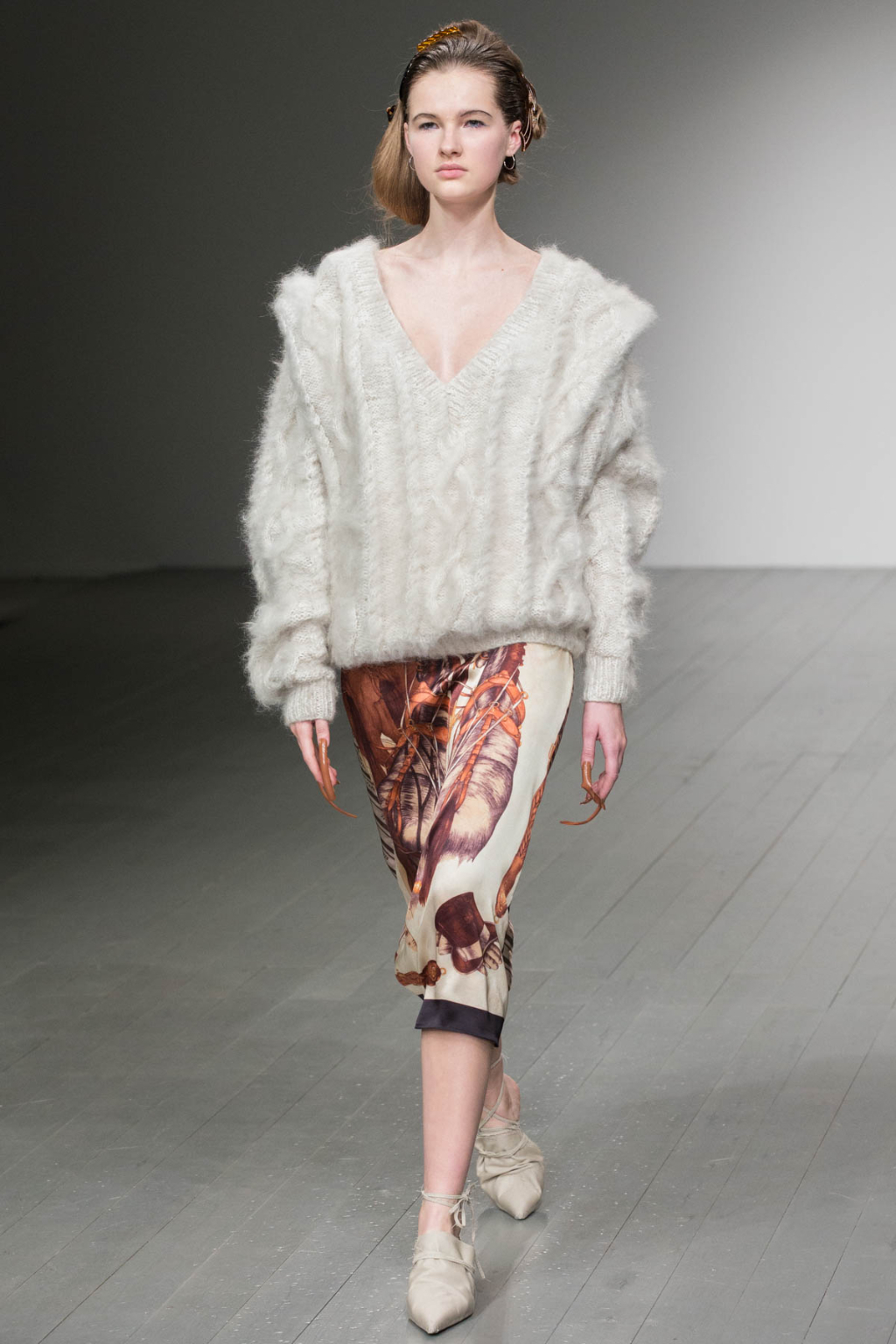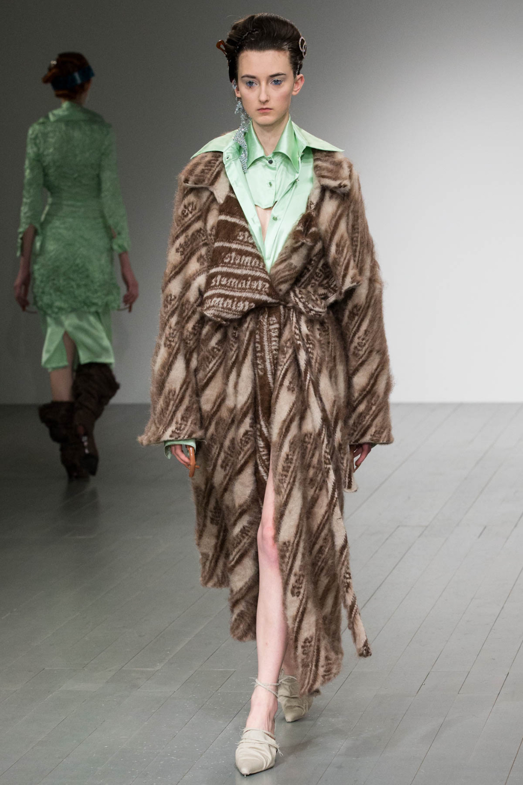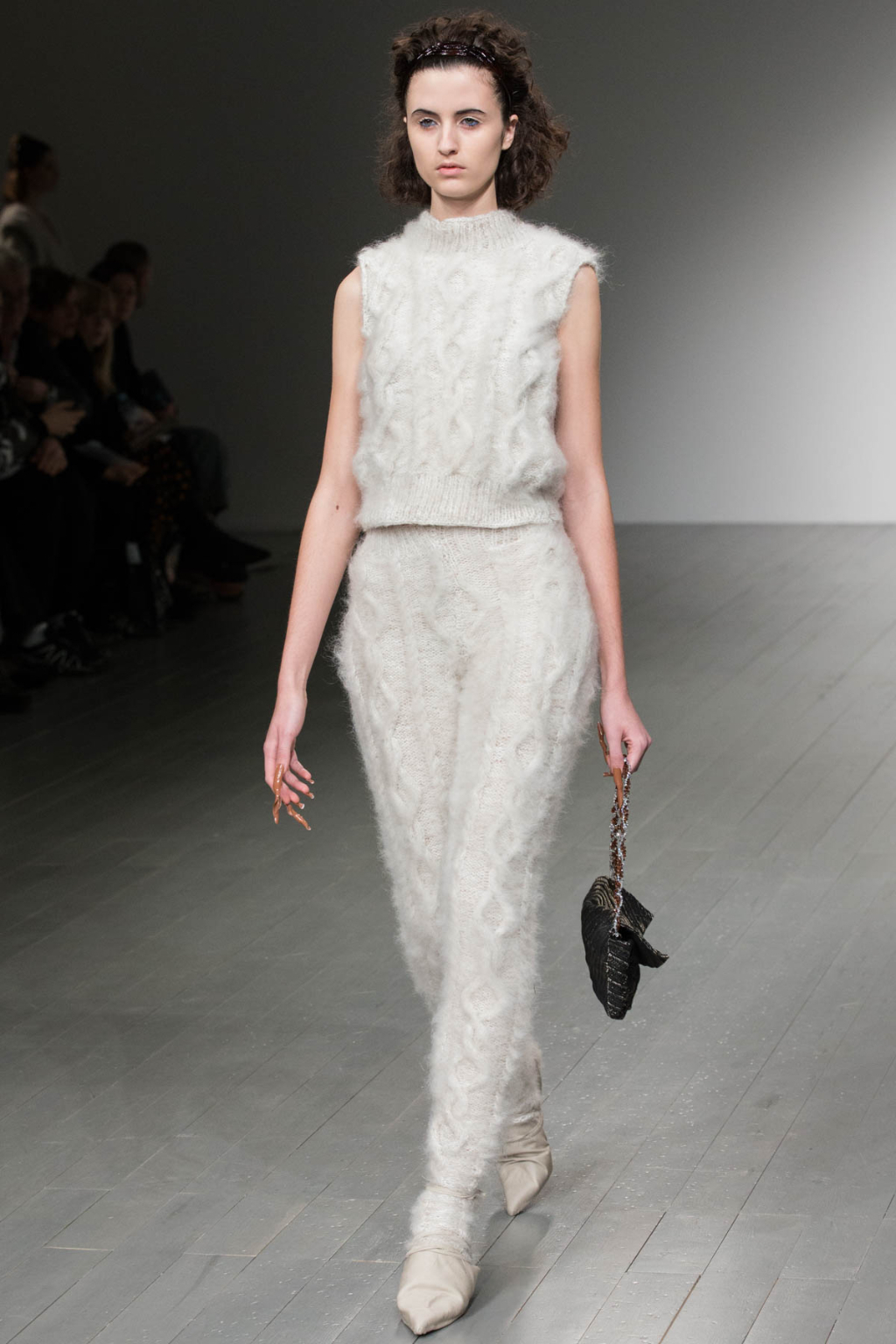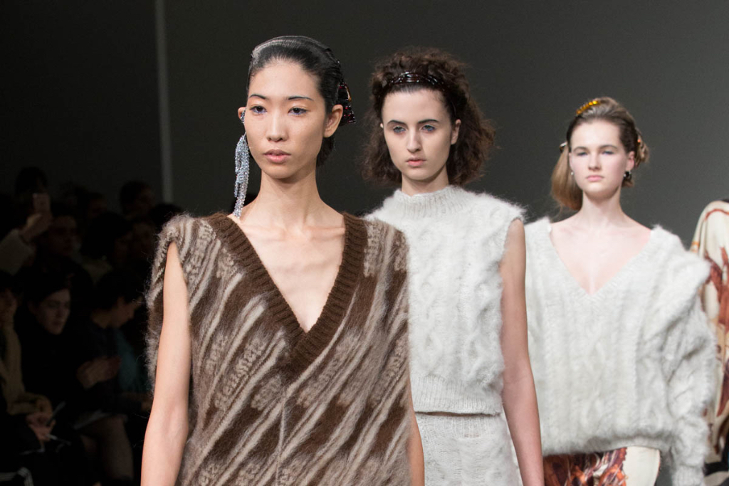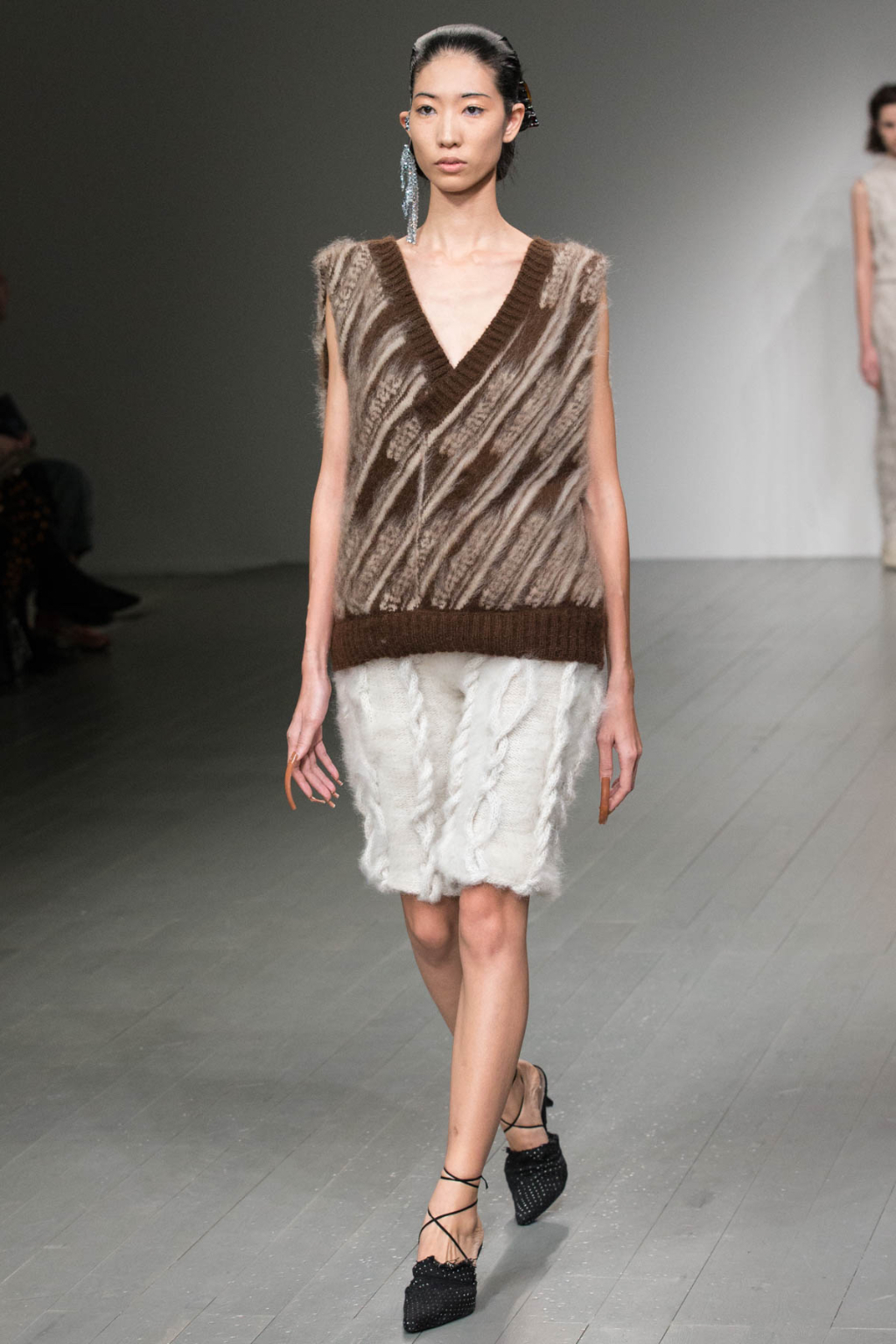 A theme of deconstruction was also very much present. A cocoa-coloured trench coat was rugged and heavily crumpled. Knitted mohair was shaggy and fluffy, as evident in a cream trouser and sleeveless knit co-ord. Pointed mules had a makeshift, unfinished look about them.