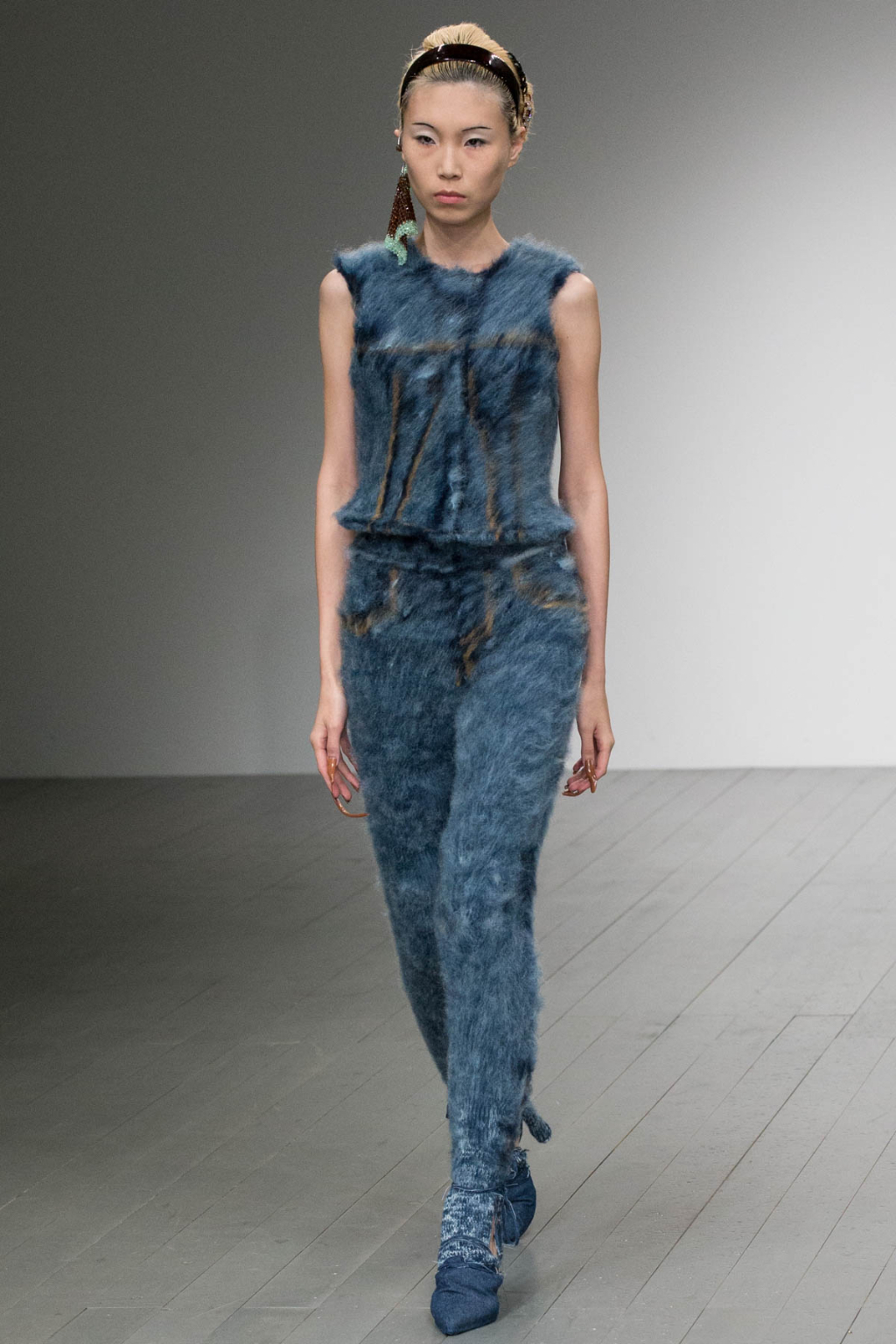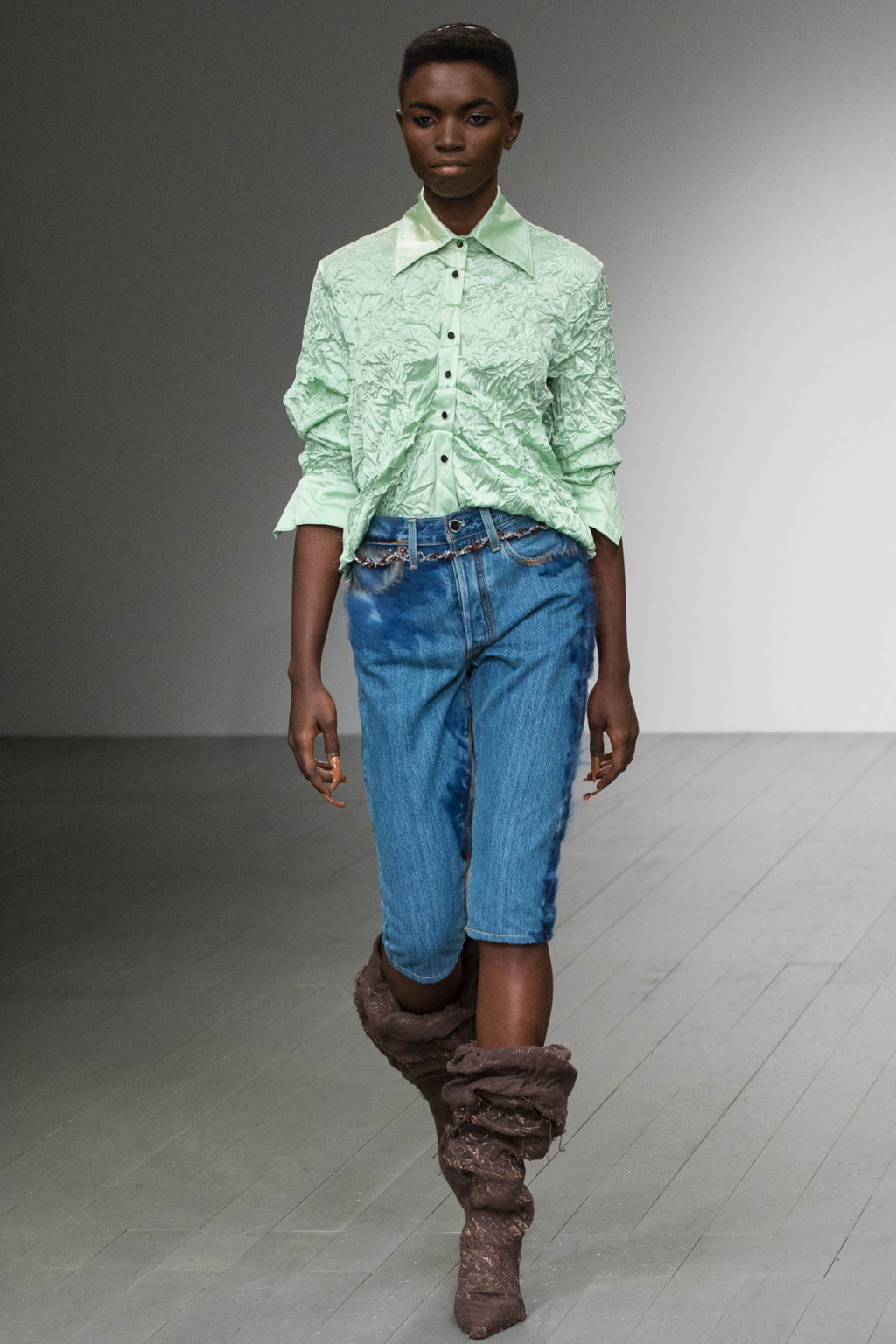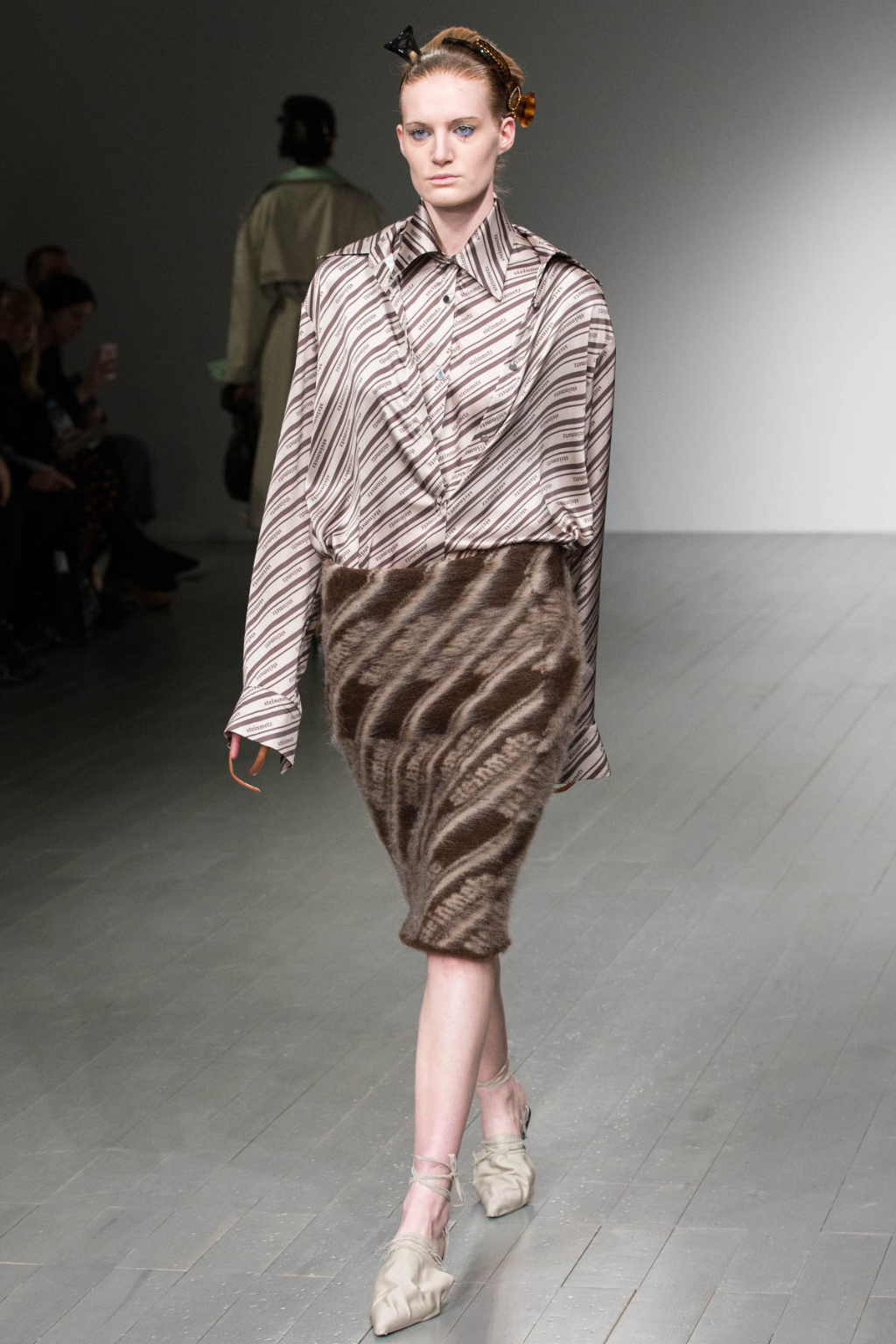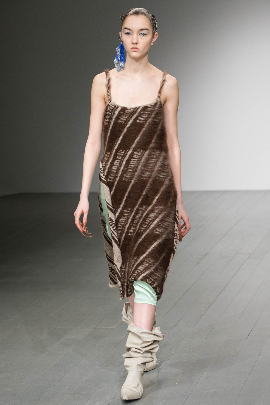 A theme of deconstruction was also very much present. A cocoa-coloured trench coat was rugged and heavily crumpled. Knitted mohair was shaggy and fluffy, as evident in a cream trouser and sleeveless knit co-ord. Pointed mules had a makeshift, unfinished look about them.