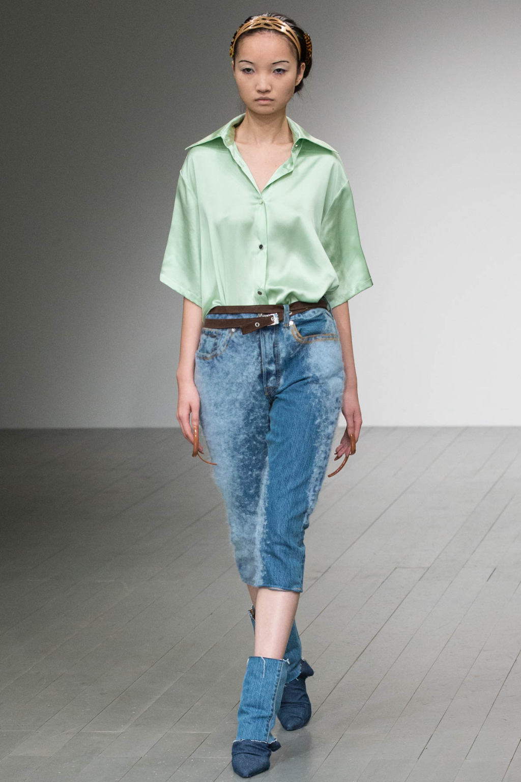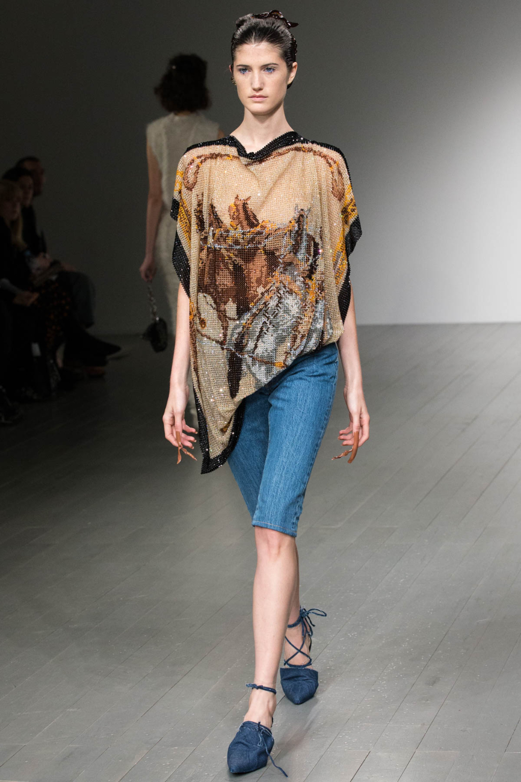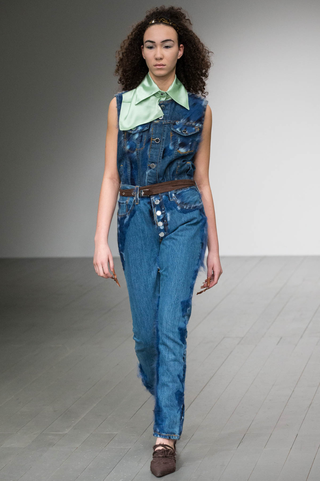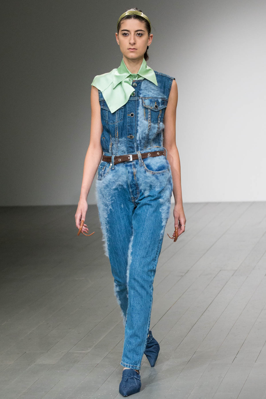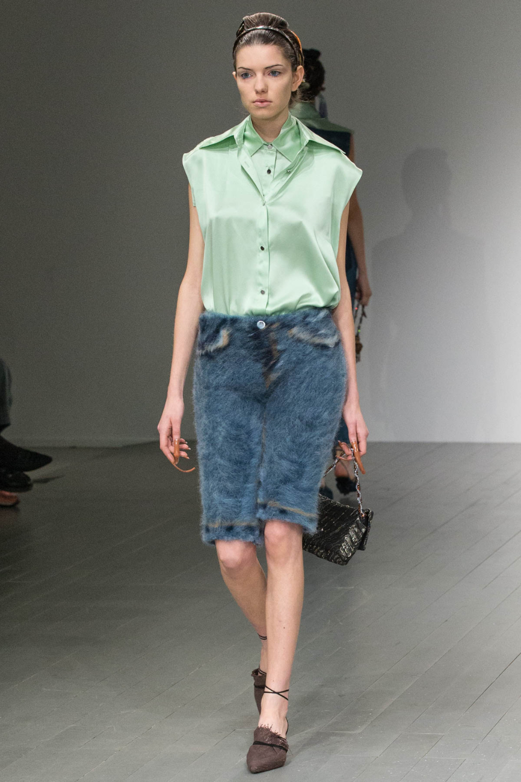The stone-coloured trench coat, silk shirt, high-waisted jeans, cable knit jumper and monogram print are all indisputably classic staples, but they took on a brilliantly kitsch undertone. Denim was replicated in sleeveless shirts, kitten heel boots, and vintage-feel jeans, and came in various tones and textures: rough and worn, fluffy, raw, hand-felted. It was denim the way it was worn in the heyday of the early noughties.