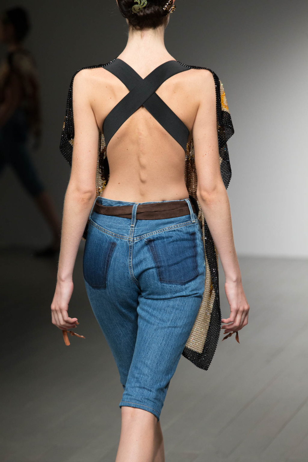 Each minute decorative technique revealed something new from what is already familiar. The diamanté detailing could have been a reincarnation of the iconic noughties embellishment, but learning of its Swarovski composition somehow made it anything but tacky. Oh, and the nails! Each model wore mink-hued acrylic nails, with one extended further than the others. Although a small detail, it managed to elevate the overall aim of Steinmetz’s collection: redoing what has not yet been intended to be redone.
