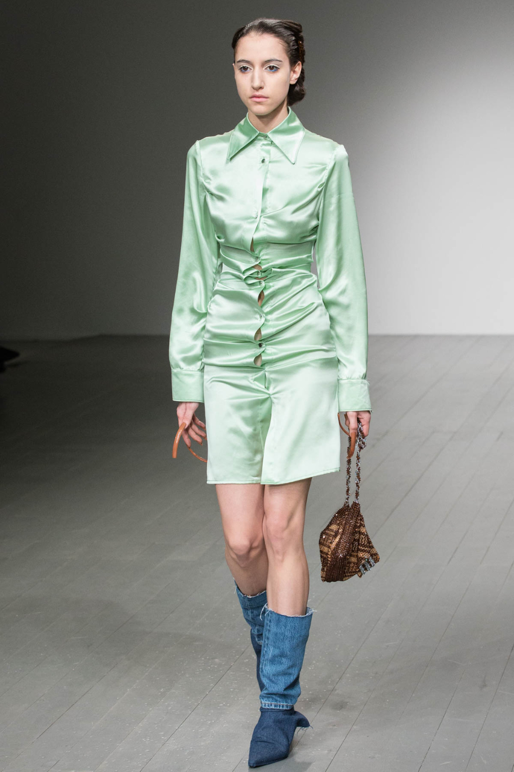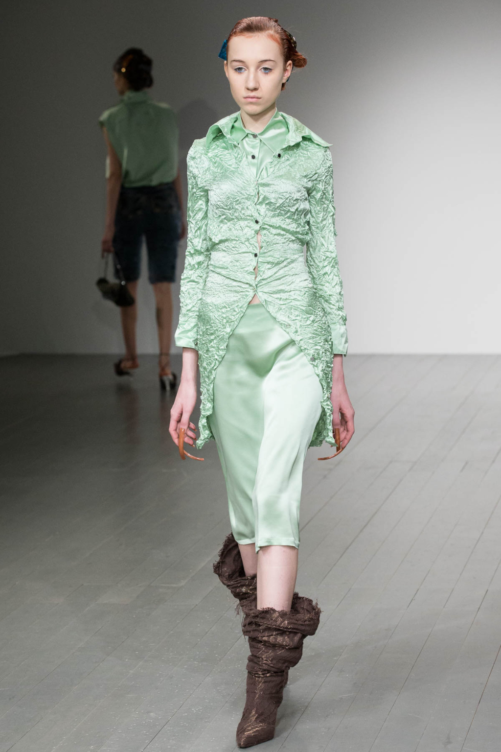 There was this one shade of green that one couldn’t quite put their finger on. It wasn’t quite mint. Not laurel green. It was a particular hue that one had maybe seen once before in their lifetime, a sort of light, pallid green, like the pigment of matcha green tea mixed with milk. Perplexing, because it was a tone not often seen on the catwalk, but it managed to work as the canvas for smooth silk dresses and shirts, as well as their textured, tightly-crinkled counterparts.