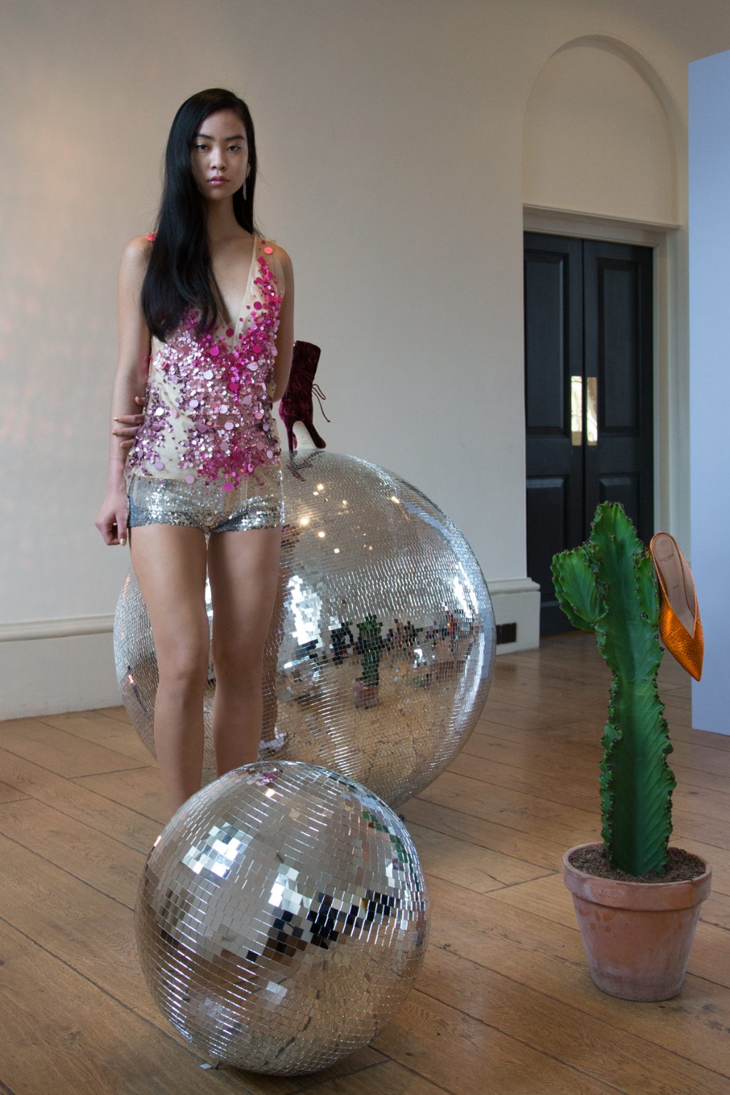 High heel sandals in bold pink and indigo were positioned on disco balls of different sizes, while mules in metallic orange were placed on life-sized cacti. The central part of the room was replaced by a sandpit, which alongside the oversized disco balls created an enchanting contrast between the two themes: a glamorous party in the Wild West. However, the luxury designer managed to translate this divergence into clean and sophisticated lines, through exploring new materials such as lurex and crepe silks.