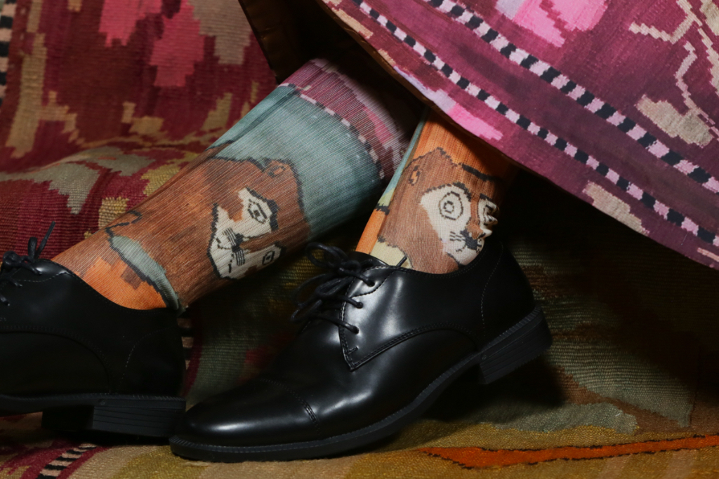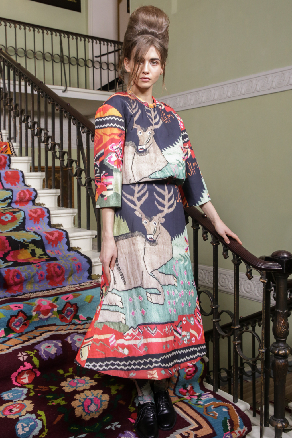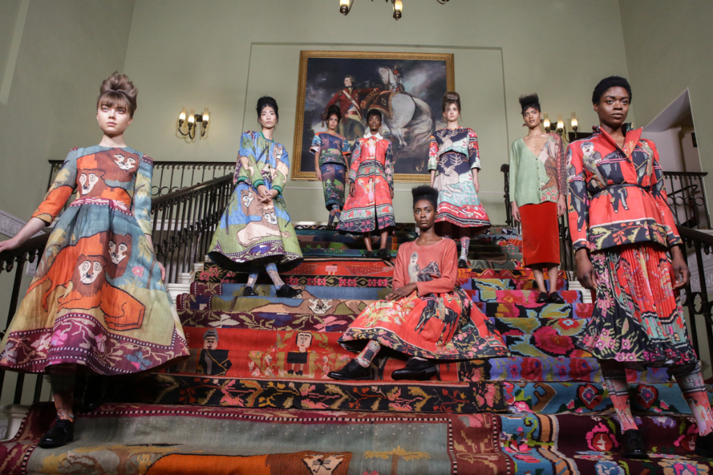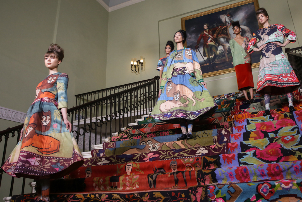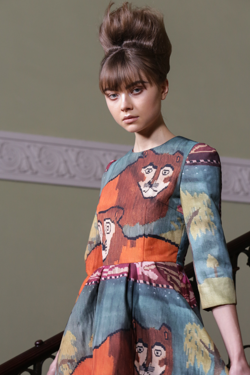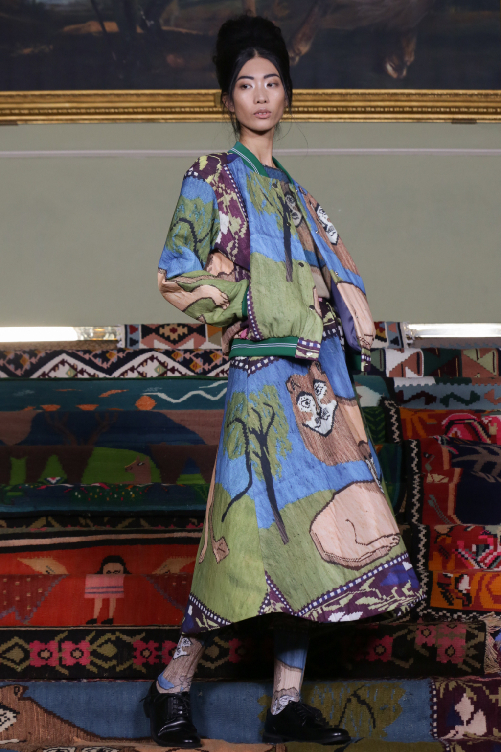 Vibrant tales from the woods were conveyed through lucid tapestry prints of Red Army officers on horseback, lions and deer surrounded by segments of floral shrubbery, using a colourful palette of earthy tones, vermillion and midnight navy. Motifs were heavily detailed and bore a resemblance to Georgian Kilim rugs as well as Russian shawls.