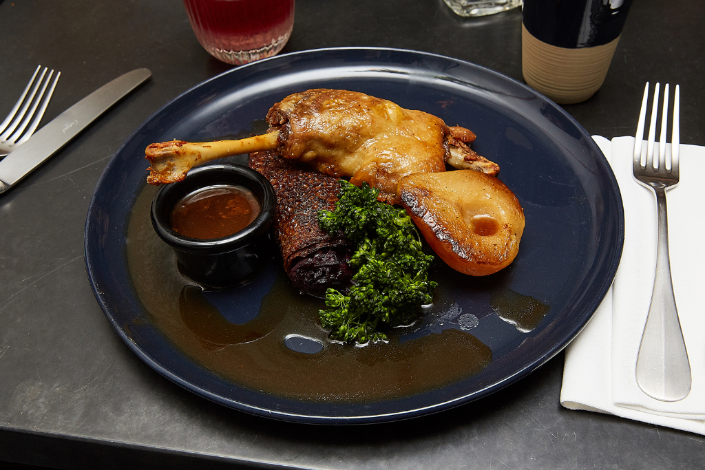 The mains courses were split into mains and galettes;– we went for a dish from each: the Cod Wrapped in Buckwheat and the Confit Duck Leg. I was eager to try the fish, mainly to see how it would work as a galette and also because it seemed somewhat experimental. The cod was salty, full of flavour and neatly packed into a crispy buckwheat crêpe exterior. It was accompanied by delicately braised fennel, new baby potatoes, glazed carrot and chorizo sauce, making this a surprisingly hearty and tasty dish.