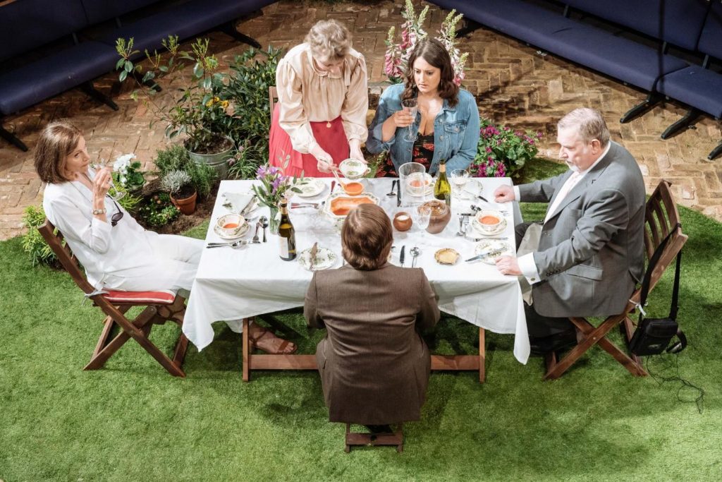 The rest of the characters are a smidge more interesting. There’s a nice class-based tension between Lang’s acid-tongued Flora and Bradley’s boorish George, while Hinds gets a lot of the best lines as the BS-less Rosie. And by staging the performance in Simon Daw’s perfectly middle-England back garden, director Paul Miller manages to milk the play dry laughs-wise. Though it’s merely tittersome in the first half, the classically awkward al fresco family meal that dominates act two soon has the audience guffawing. But still, it’s all tempered by how conventional the production feels.