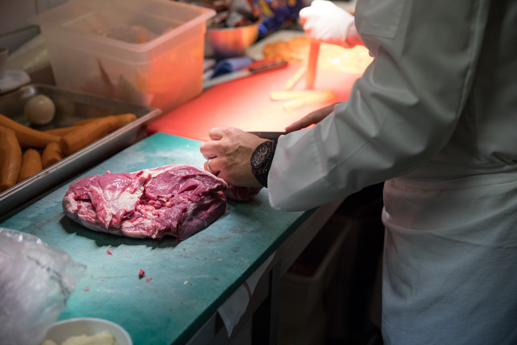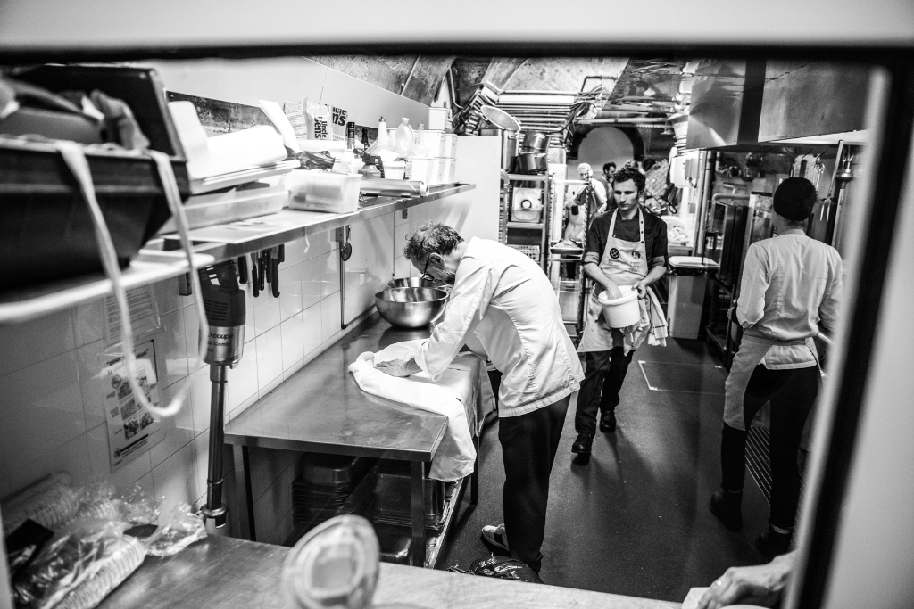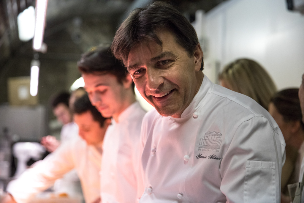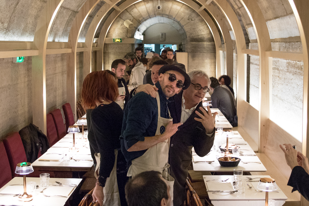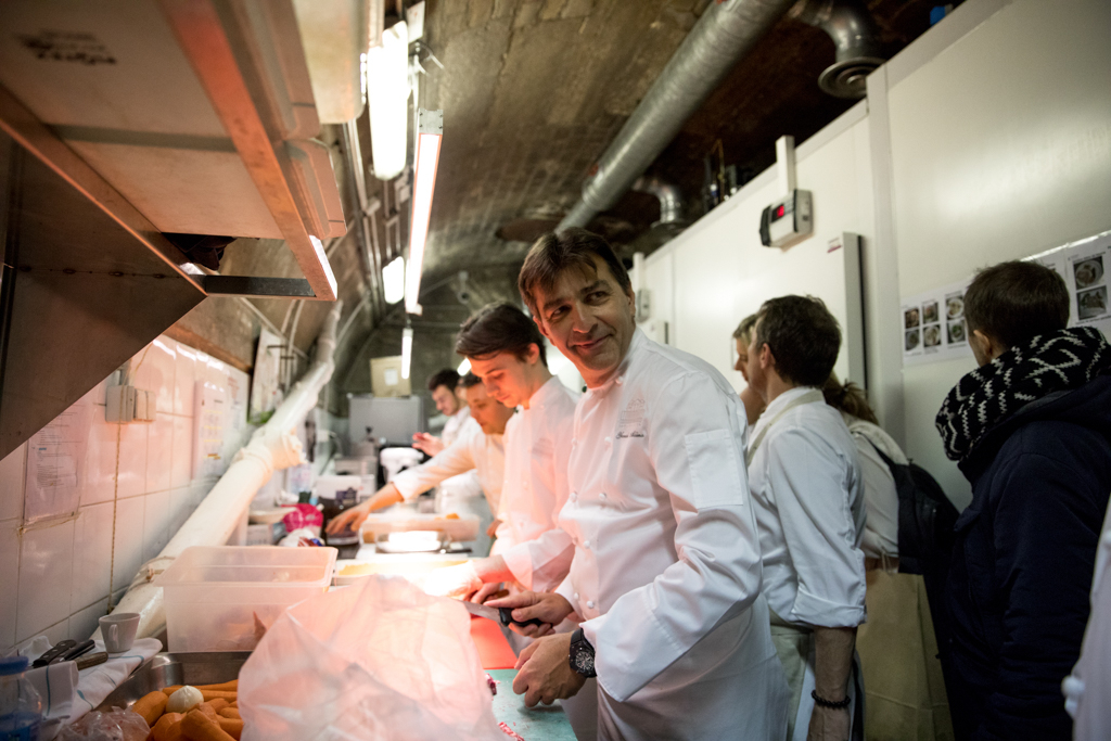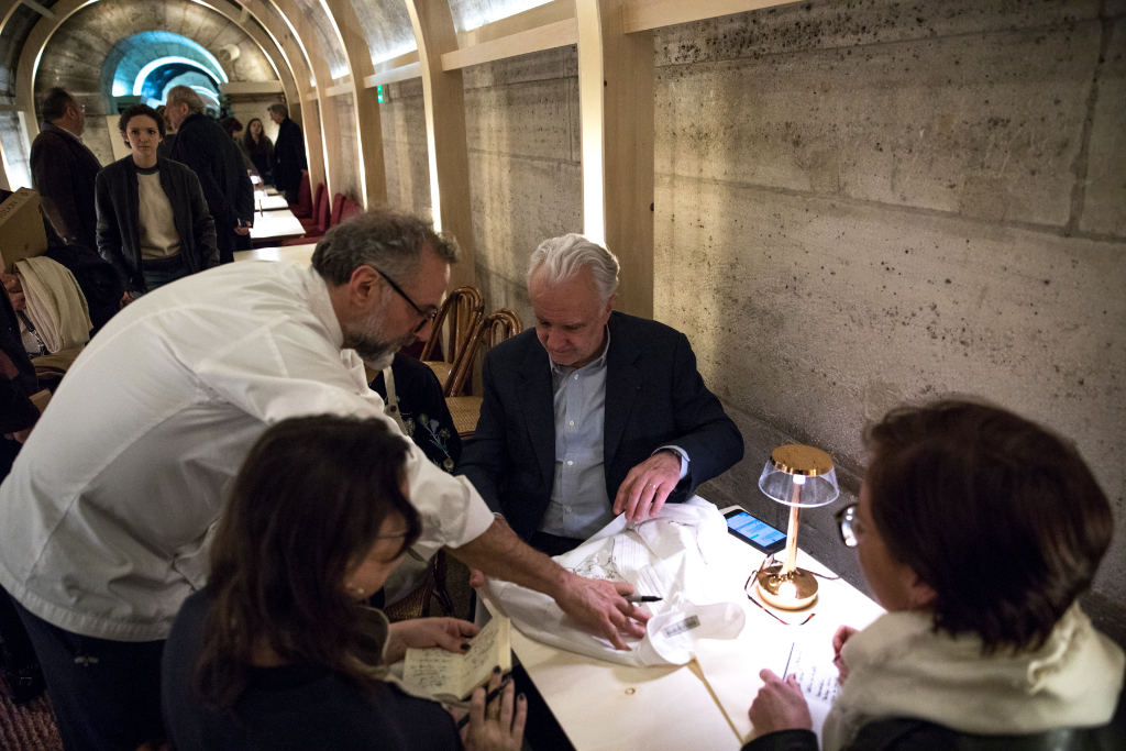 On the day of the opening, two legendary French chefs helped cook the very first meals: Alain Ducasse and Yannick Alléno. Ducasse brought with him Romain Meder, head chef of three-michelin-starred Plaza Athénée restaurant, and Christian Julliard, one of his right-hand men. More chefs from Paris, France and around the world have been invited by Massimo Bottura to prepare healthy and delicious meals with surplus ingredients provided by Carrefour, the Banque Alimentaire and Phenix, a young social entrepreneurship tackling food waste by serving as a link between large supermarkets and various charitable associations. Every night from Monday to Friday, a team of volunteers welcome guests, mostly refugees, homeless, rough sleepers and people in situations of social vulnerability, serving them dinner directly at the table. Refettorio Paris aims to serve 100 meals a day using about 130 kg of recovered food.