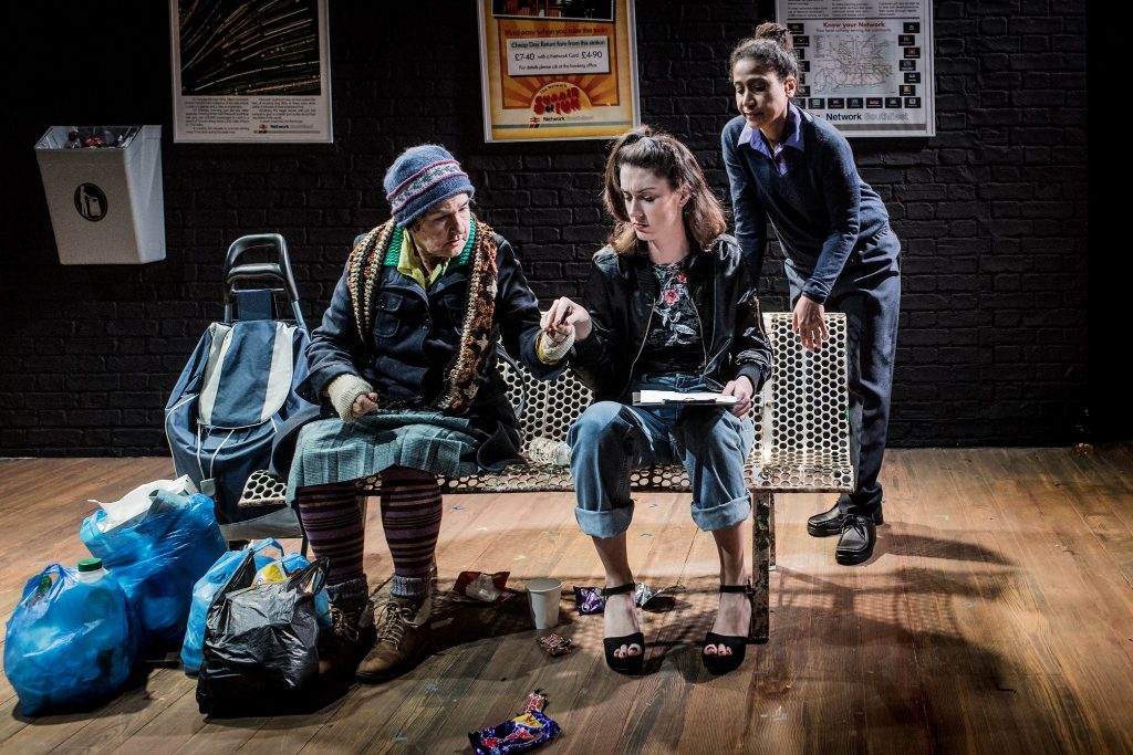 Coward’s Still Life is answered by Ayres in Glimpse, which considers the human need for comfort in familiarity amid frenetic social mobility. An apparently homeless elderly lady (Claxton) sits waiting in a train station for her brother to arrive. Employing humour and tenderness, the piece touches on political discrimination towards the poor, also showing that no woman is free from judgment for her appearance: “people make all sorts of assumptions when you haven’t got tidy hair”.