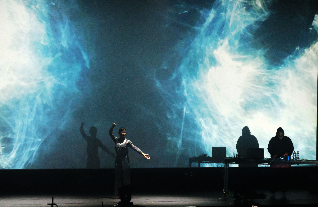The weekend begins on Friday with thought-provoking unions of sounds and vision for Session One. Electronic musician Jlin opens the night with a new work for dancers, following in Richter’s footsteps. The piece is an immersive experience: a complex fusion of music, movement and visuals. Random in the first part, the colourful beams that rotate across the auditorium gradually assume an organised structure in the second sequence. At this point, solo dancer Lilian Steinter’s (in a fluorescent costume) movements become smoother. The music, presented through recorded voicemail messages from a female voice, is predominated now by percussion. The videos of unformed material gradually disappear. The third movement reclaims part of the initial asymmetry, but with the addition of some piano chords. To add to the multidimensional consistency of the creation, artificial fog invades the stage.