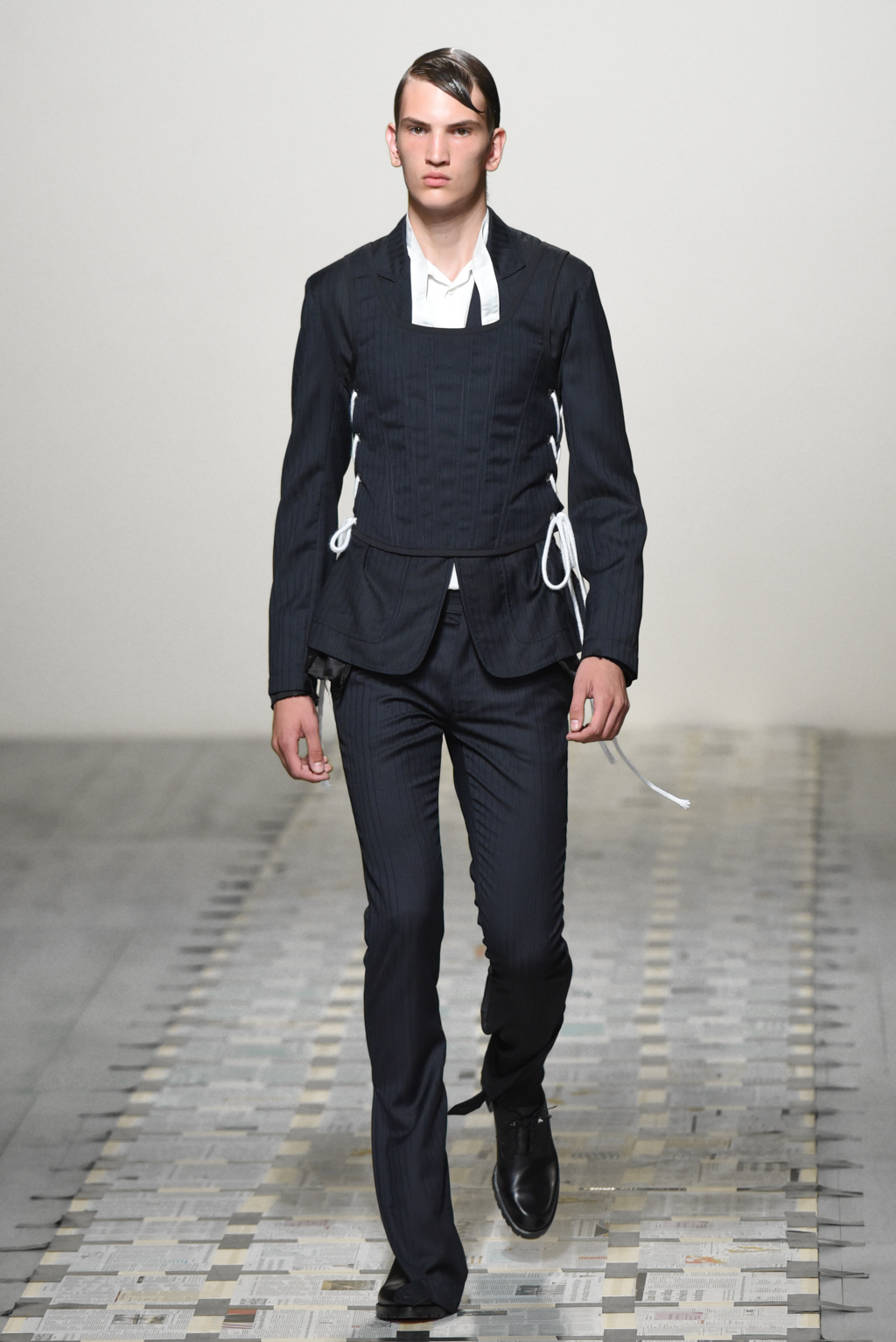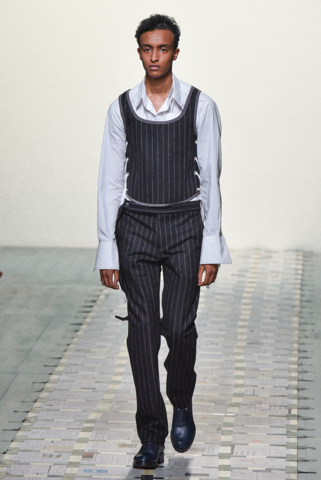 Daniel W Fletcher presented their new 2019 collection at BFC Show Space for London Fashion Week Men’s. The outfits reflect the struggles of becoming a fashion designer in the modern age. This message is translated through a duality represented by the hard-working business man and his transformation into a night creature, more casual and darker. Tailored suits are a constant In this show, with a twist on its traditional layout. Here are our images from the show.