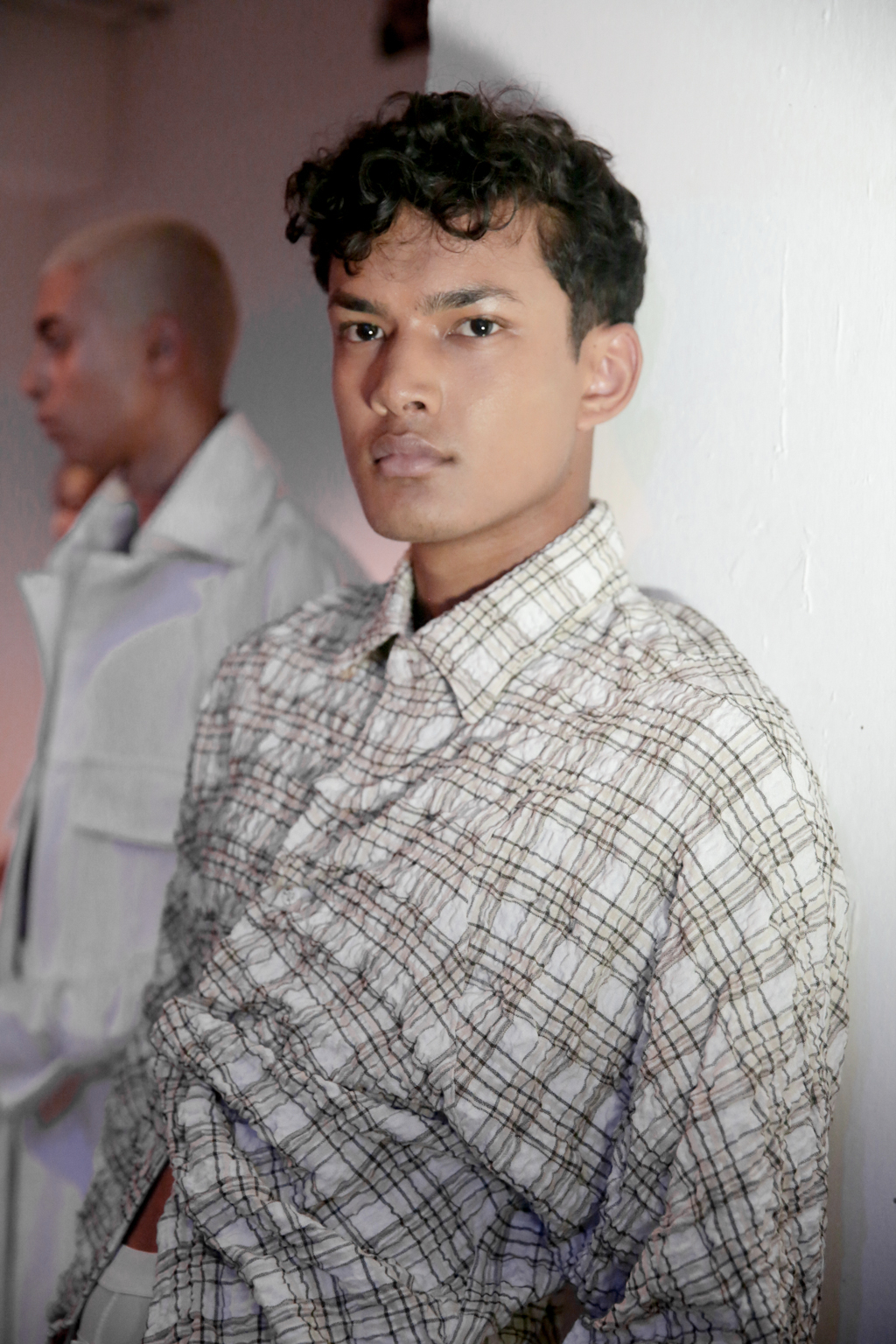 Conceived with an imaginary character in mind – an amalgam of personality traits relating to the designer’s close friend network – the collection presents masculine clothes infused with subtle aspects of femininity. The fabric choices remain familiar, all part of the modern wardrobe: nylons, jersey and cotton shirting. The fits represent the feeling of intimacy. Tops, often tight around the chest, loosen up towards the tail. The pieces offer little movement, unlike the previous collection, where the wearer could alter the garments.